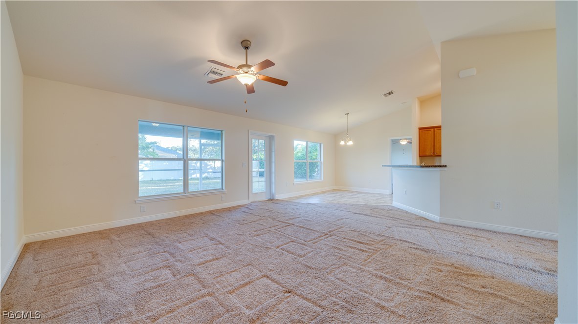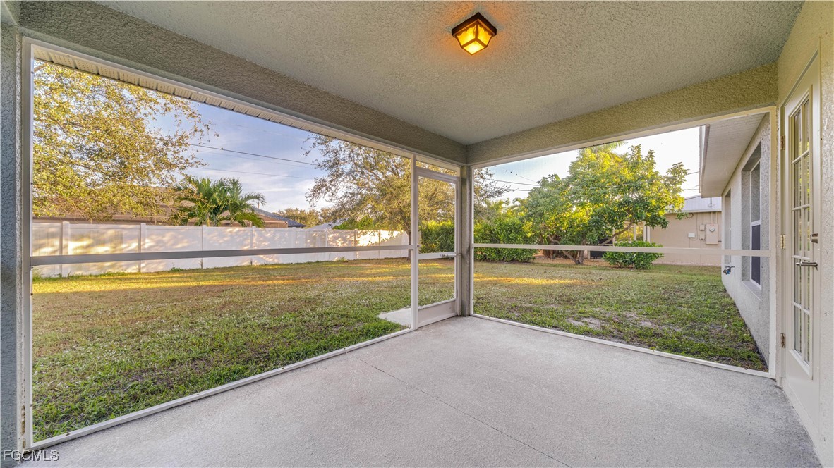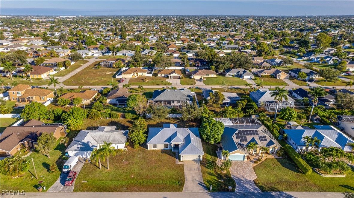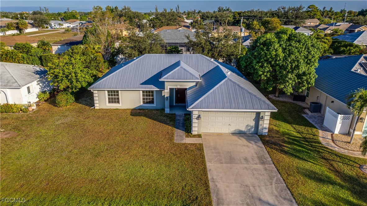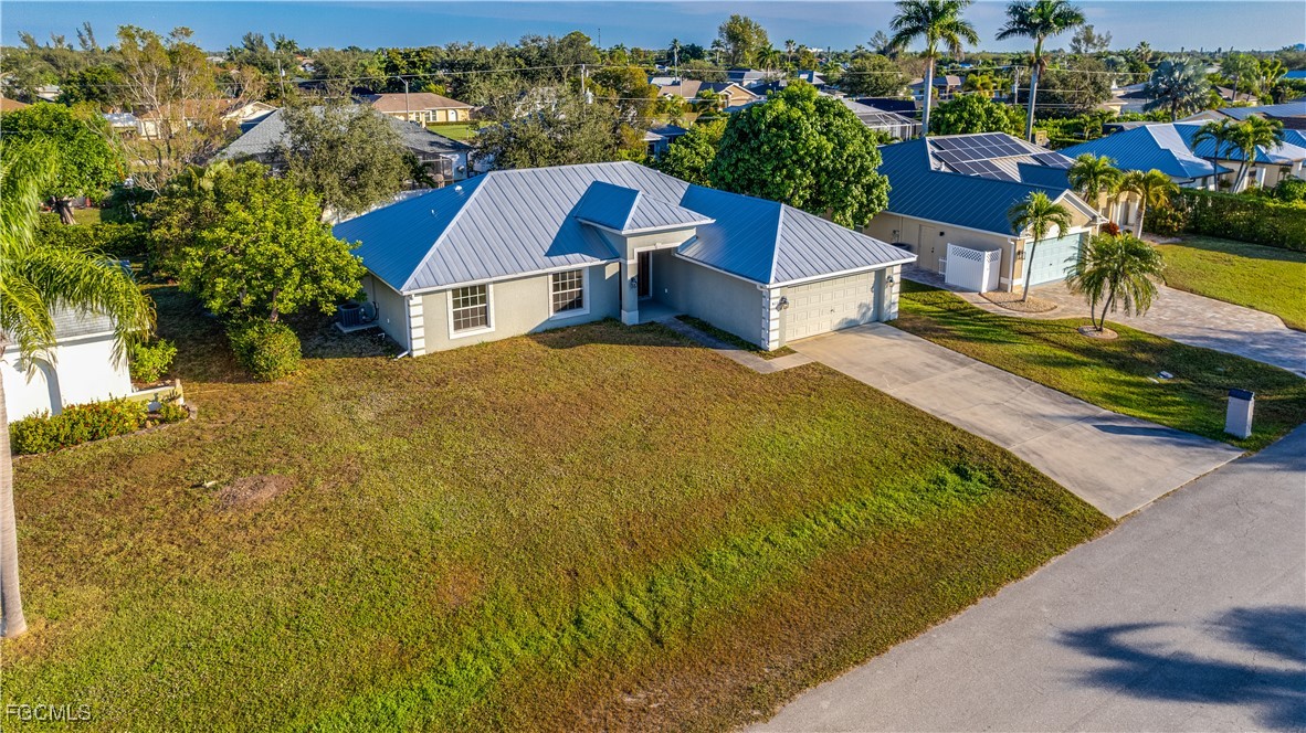 Spacious 4 Bedroom, 2 Bathroom home offering approx. 1,757 sq ft of living area with a spacious great-room floor plan and soaring vaulted ceilings. The large primary suite includes double sinks, a garden soaking tub, separate shower, and walk-in closet. The backyard offers screened rear porch with plenty of room to add a pool. Recent updates include a 2021 metal roof, and a recently serviced A/C. Home is priced accordingly due to known carpet damage. Flooring replacement may be required, and condition has been factored into list price. NOT IN A FLOOD ZONE! ALL ASSESSMENTS PAID. Prime SE Cape Coral location near Santa Barbara Blvd. and Veterans Parkway with convenient access to restaurants, shopping, and schools.