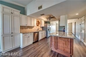 Remodeled pet friendly 2/2 condo unit on the 3rd floor with fantastic views over the intersecting canals. The unit comes with assigned parking space, laundry in residence, gourmet kitchen, wooden floors, screened-in balcony overlooking gulf access intersecting canals, south exposure, true Florida living in an open floor plan. Kitchen is equipped with stainless steel appliances, granite counter tops and wine cooler. Bathrooms are tastefully upgraded. Lots of storage space in unit. Condo is conveniently located directly off the Rubicon canal by boat or super close to Cape Coral Downtown by car. This condo is pet friendly - one dog or cat up to 50 lbs. 1 assigned parking space and lots of guest spaces. Boat dock can be used for an extra fee.