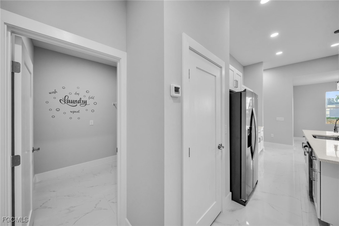 Welcome to this beautifully designed 3-bedroom + den/office home, situated in one of Lehigh Acres well-established neighborhoods. With thoughtful upgrades throughout, this home offers modern comfort and timeless style. The open-concept layout features tray ceilings in the main areas of the house, elegant tile flooring, unique details, and a stunning chandelier in the dining area. The kitchen is a chef's dream with quartz countertops, stainless steel appliances, solid wood cabinets, and a spacious pantry. Spacious bedrooms with walk-in closets, and a luxurious master bath with a dual-entry shower. Built with safety and efficiency in mind, the home includes hurricane-impact windows. A dedicated outdoor space is perfect for entertaining. Situated just minutes from shopping centers, schools, and main roads like Lee Blvd and Sunshine Blvd, this home offers an ideal balance of peaceful living and everyday convenience in one of the area's most promising locations.