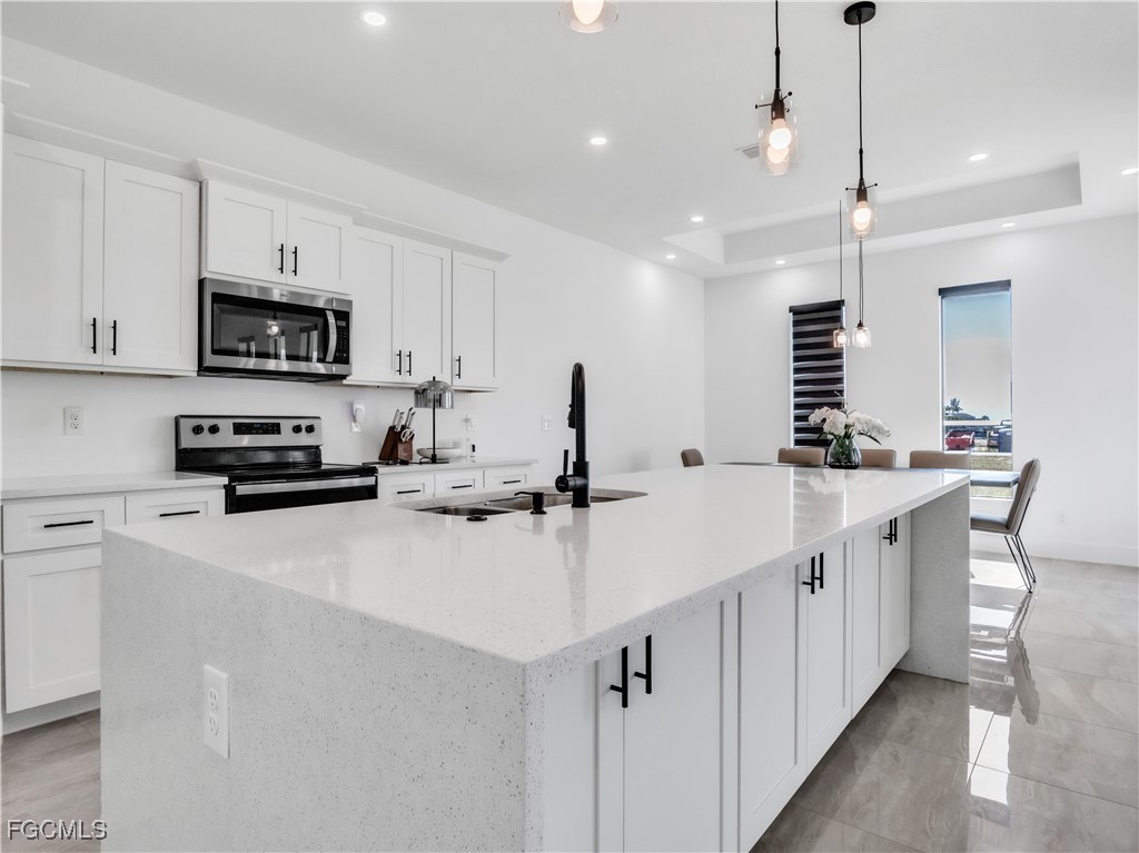 Discover modern living in this stunning 3-bedroom, 2-bathroom home with a den, built in 2022 and offering nearly 1,800 sq ft of elegant design. Enjoy high 10’ tray ceilings, 8’ doors, and impact windows and doors throughout. The spacious master suite features dual showers, his-and-hers sinks, and a walk-in closet. The open-concept kitchen shines with quartz countertops, soft-close cabinetry, stainless steel appliances, pantry, and breakfast bar. Tile flooring, luxury light fixtures, and French doors add a refined touch. Outdoor highlights include a landscaped backyard, paved driveway, lanai, and irrigation system. Complete with a 2-car epoxy-finished garage, washer and dryer, well and septic system with reverse osmosis, and gutters—this contemporary home offers style, comfort, and efficiency in a serene, centrally located neighborhood.