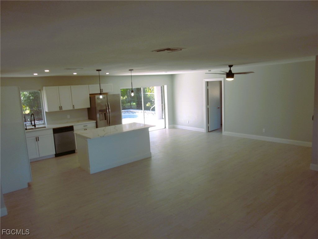 Move-in ready 3 bedroom, 2 bath pool home on city water and sewer in a well-established Cape Coral neighborhood. The home features a recently updated kitchen, modern flooring, and beautifully refreshed bathrooms. The primary suite offers direct access to the pool deck, making it a perfect pool bath. Relax and entertain in the screened pool area while enjoying the charm of a mature community close to shopping, dining, and everyday conveniences.