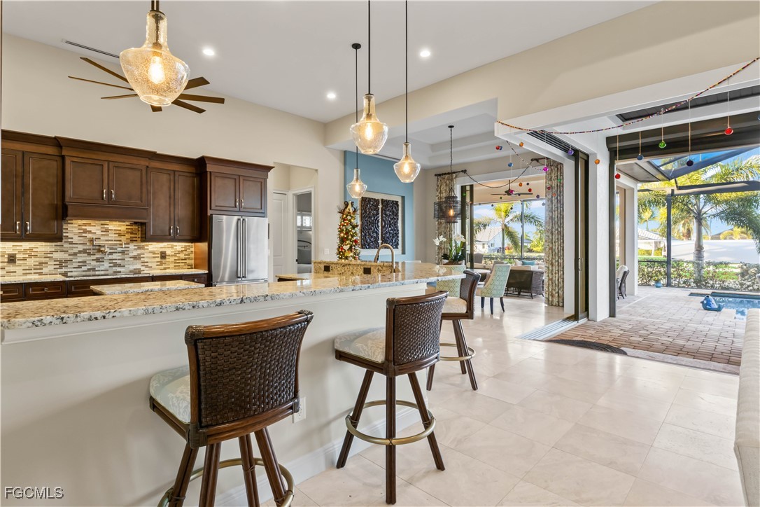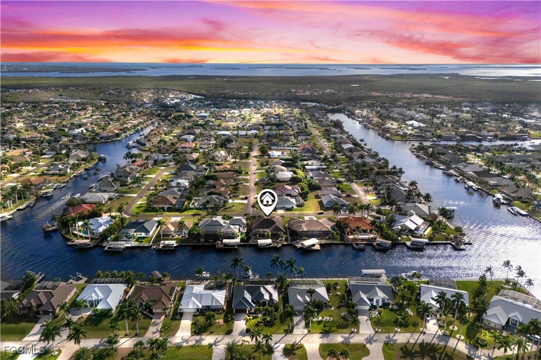 AN UNPARALLELED WATERFRONT ESCAPE AWAITS! Welcome to this stunning custom waterfront estate offering 2,504 square feet of refined coastal living. Featuring three spacious bedrooms, a versatile den, and three beautifully appointed bathrooms, this home surpasses the finest model homes and delivers an exceptional blend of luxury, comfort, and functionality. Perfectly situated on the Eternity Canal with Gulf access, this residence is designed to capture breathtaking water views while seamlessly blending indoor and outdoor living. Wide-panel pocketing sliders in BOTH the living and dining areas open effortlessly to expansive entertaining spaces, creating a true Florida lifestyle experience. Soaring ceilings, abundant natural light, and an open-concept layout highlight designer finishes throughout, including custom glass and metal double doors, upgraded flooring, and countless one-of-a-kind details. The chef-inspired kitchen and living spaces flow beautifully for everyday living or hosting guests, while the private den provides an ideal home office or quiet retreat. A three-car garage offers ample room for vehicles and recreational gear, and impact-resistant windows with roll-down storm shutters provide peace of mind without compromising style. Step outside to your personal waterfront oasis—host unforgettable gatherings in the outdoor kitchen, enjoy the resort-style pool with ambient lighting, and relax beneath the large tiki hut while watching spectacular sunsets. Boaters will appreciate the 10,000 pound boat lift (easily accommodating a 28’ boat), captain’s walk, composite dock, and quick access to open water. A true backyard oasis with sparkling pool and spa and all the space you need for entertaining! Additional highlights include granite surfaces throughout, travertine and premium wood flooring, handcrafted cabinetry, cypress wood-paneled ceilings and soffits, pavered walkways, and thoughtfully designed outdoor living areas that elevate the entire experience. Located in the heart of the Cape Harbour area with easy walking to marina, multiple restaurants, bars and shopping! Not to mention easy access out to the Gulf and the many islands and waters that surround Cape Coral! This is a rare opportunity to own a truly exceptional Gulf-access waterfront home. Schedule your private showing today and experience the beauty, elegance, and lifestyle this remarkable property offers.