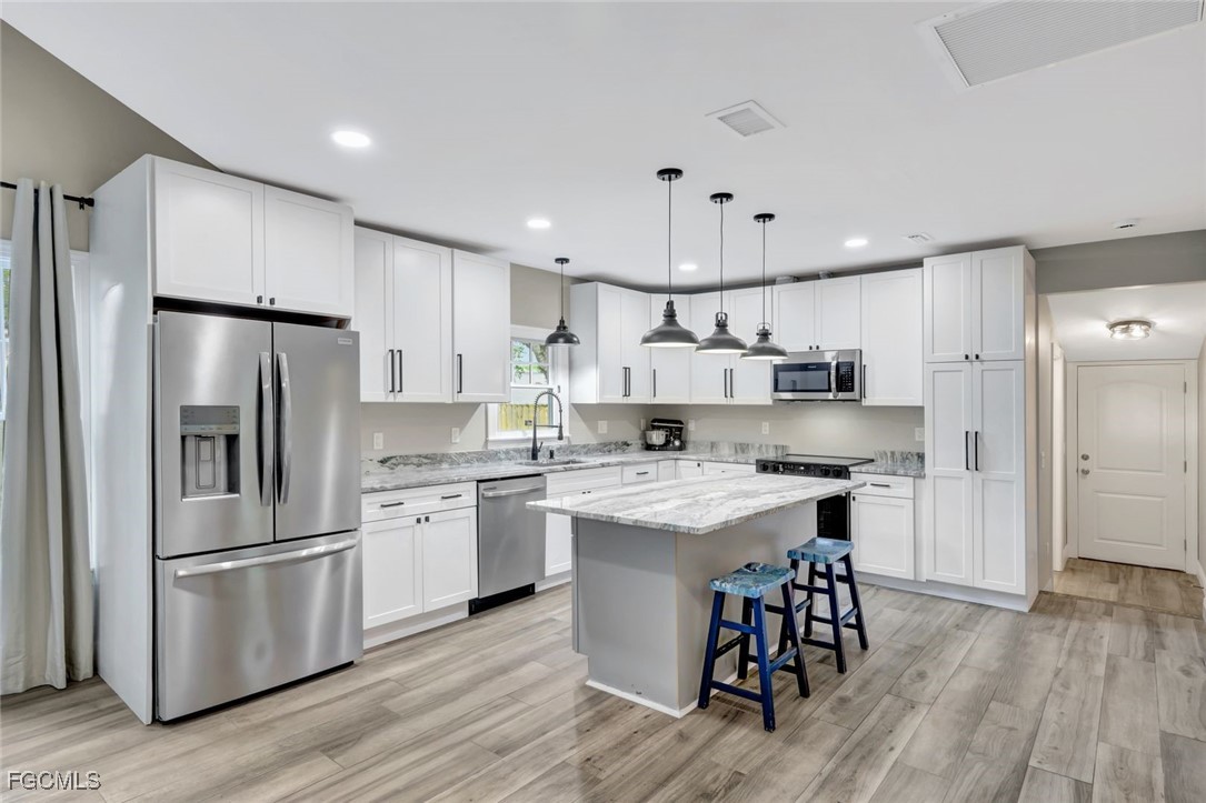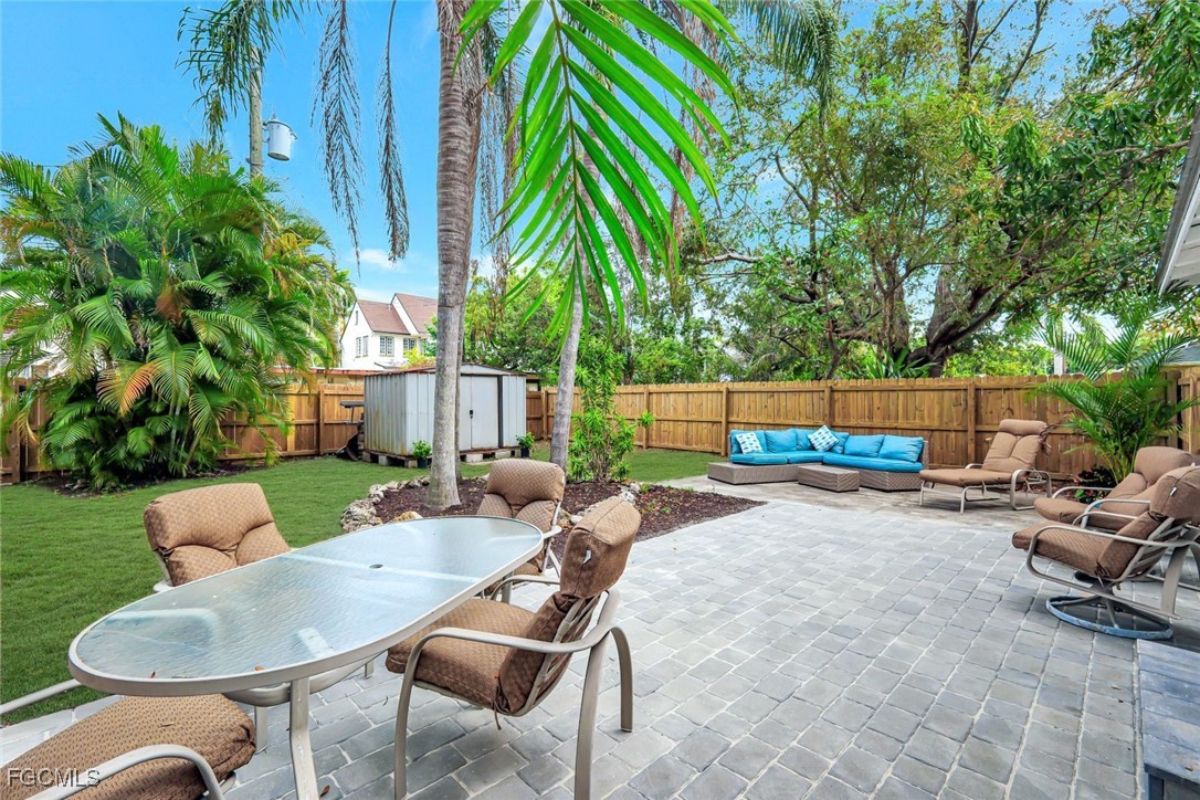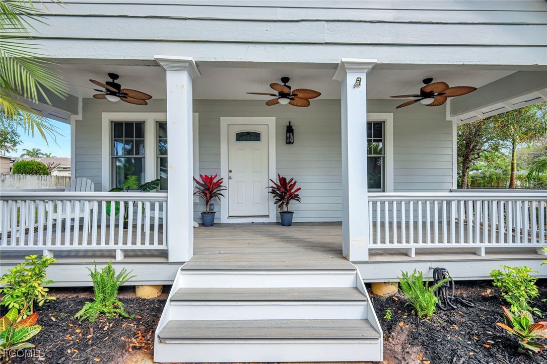 Discover Timeless Charm and Modern Comforts in the Dean Park Historic District This beautifully updated 3-bedroom, 2-bathroom bungalow seamlessly blends historic character with modern comforts, including new electrical, AC, and hurricane double impact window installation. From the moment you step onto the inviting front porch, you'll feel at home. Relax and enjoy the tranquil atmosphere with composite wood decking and three overhead fans, perfect for morning coffee or evening relaxation. Inside, wood-plank tile floors flow throughout the open living area, featuring a built-in electric fireplace, a dining room, and an eat-in kitchen. The kitchen boasts an island with granite countertops and all-new appliances. Two comfortable bedrooms are located at the front of the home, while the primary bedroom offers a walk-in closet and an en-suite bathroom with a walk-in shower. Beyond the kitchen, you'll find a second bathroom with a shower/tub combo and a convenient laundry area. Step out back to a private oasis with brick pavers and a concrete pad, ideal for enjoying the Fort Myers lifestyle. The quiet, pet-friendly neighborhood also features sidewalks perfect for leisurely strolls. And when you're ready to explore, you're just a short trip away from the exciting dining and entertainment scene of downtown Fort Myers. Enjoy a diverse selection of restaurants, from casual cafes to upscale dining experiences, as well as live music venues, theaters, and art galleries. This charming bungalow offers the best of both worlds – historic charm and modern living – in a truly desirable location