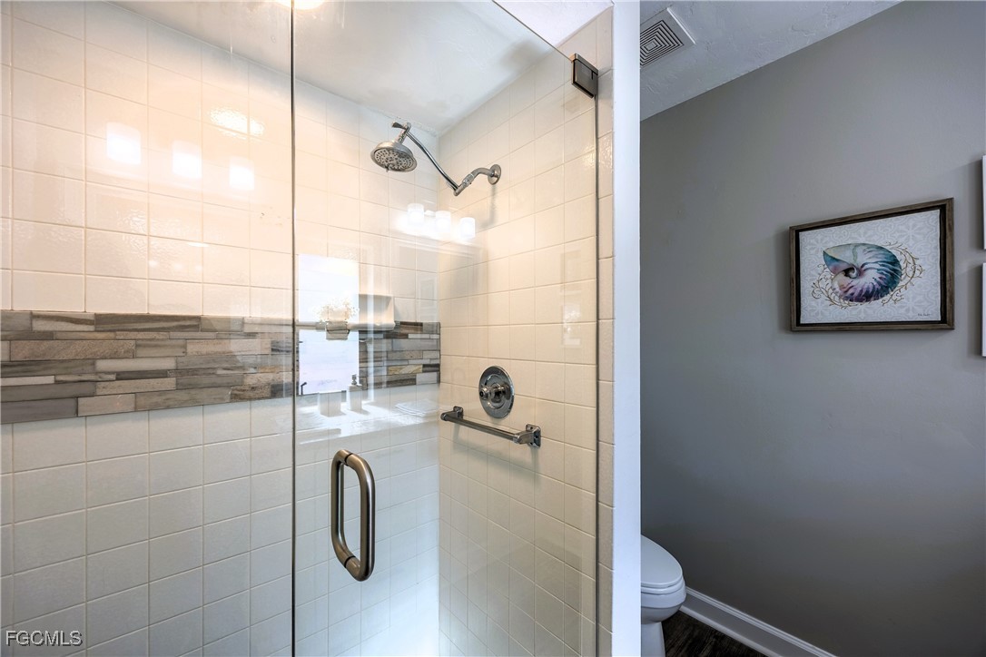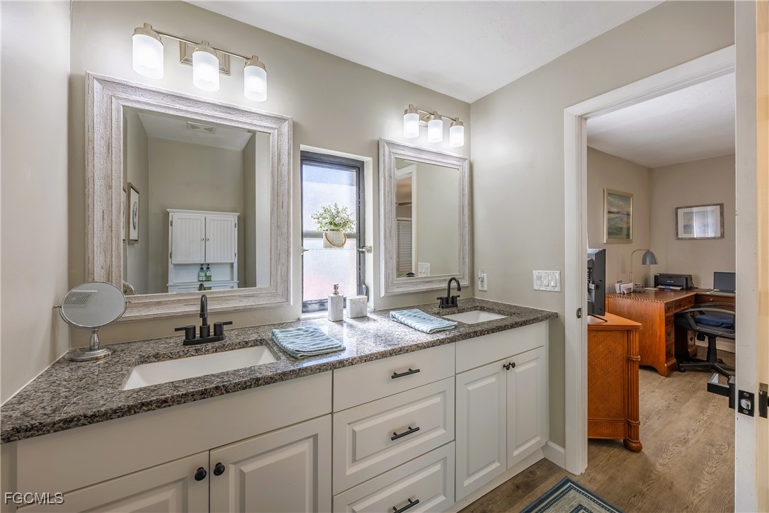 The designer-updated kitchen features white shaker cabinetry, granite countertops, a curated tile backsplash, open shelving, breakfast bar, and generous pantry space, delivering both style and functionality. Luxury vinyl plank flooring extends throughout the home for a seamless, modern aesthetic. The owner’s retreat is generously sized and includes dual sinks, a walk-in shower with new glass enclosure (2024), and two spacious closets.