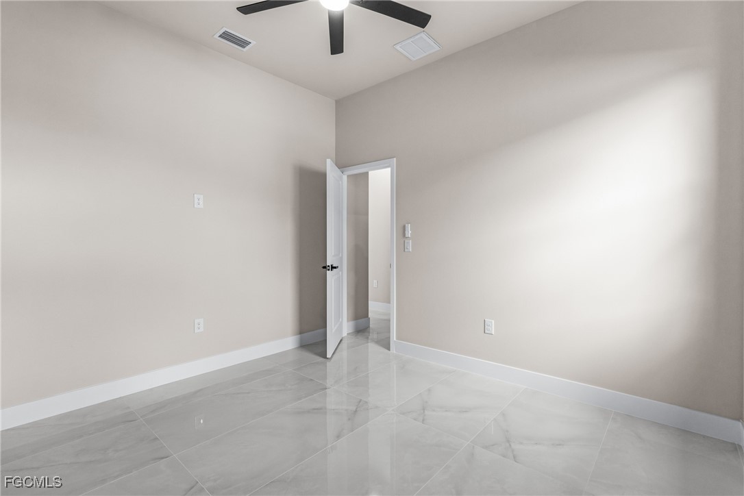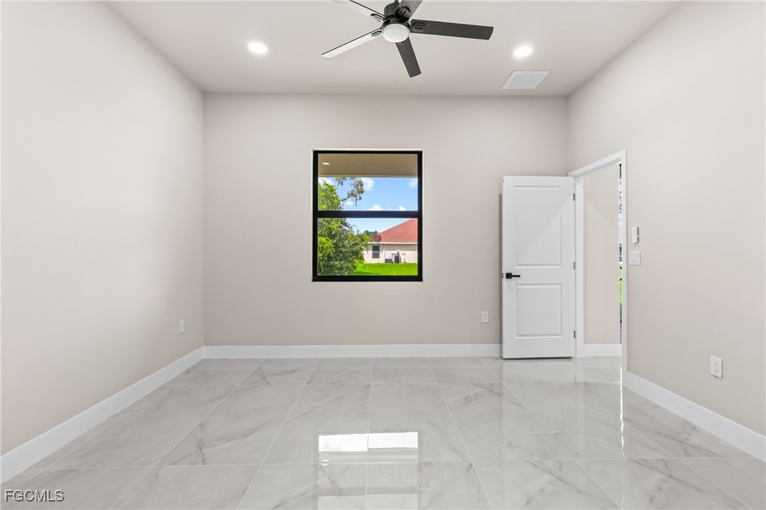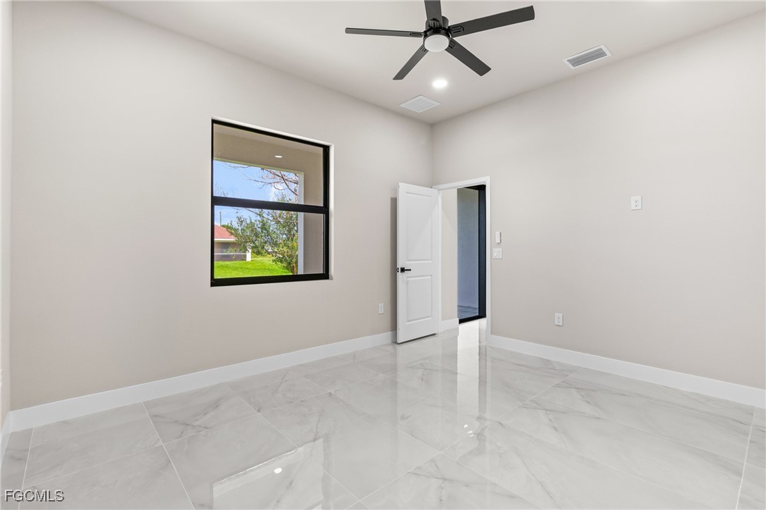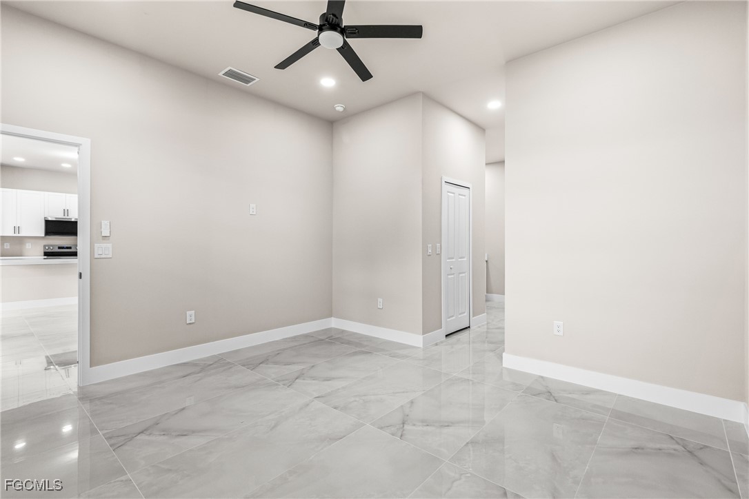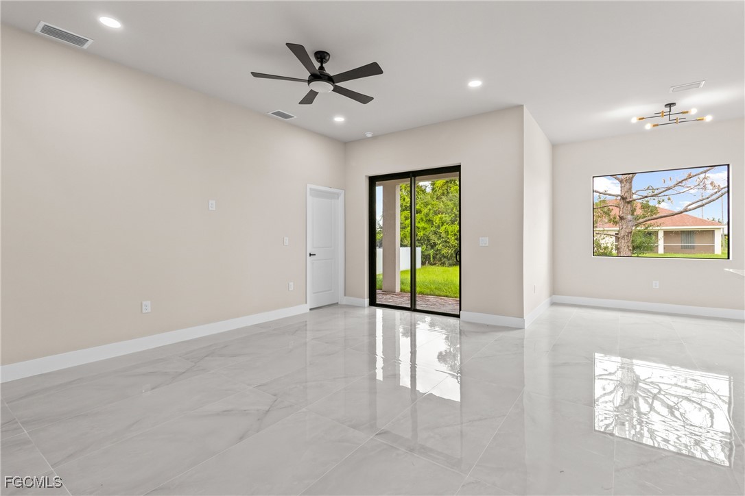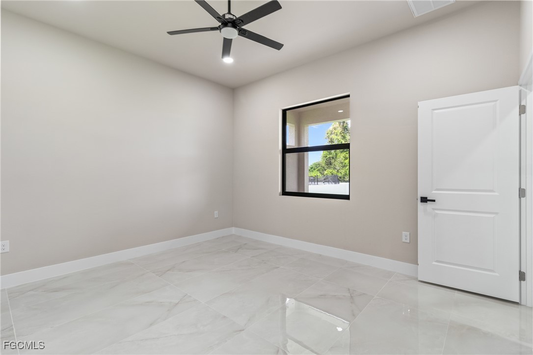 As you step inside, you'll notice the elegant touches that define this property. The kitchen is a true focal point, featuring exquisite quartz countertops that provide both, beauty and durability. The sleek stainless-steel appliances not only enhance the kitchen's aesthetics but also offer modern conveniences for cooking and entertaining. The interior design incorporates a touch of black and gold accents throughout, adding warmth and character to the living spaces. These wooden elements create a harmonious balance with the contemporary finishes, giving the home a unique and inviting atmosphere. Additionally, ceiling fans have been thoughtfully installed to enhance comfort and energy efficiency. The layout is functional and spacious, with three well-appointed bedrooms. The den adds versatility, serving as a home office or guest room. The master bathroom features a shower plus his and her closet and sinks. Plus, we cannot miss the addition made to the back of the home that can be used as a storage for your lawn and patio stuff. The home location in the SW of Lehigh Acres provides convenient access to local amenities, schools, and parks, making it a wonderful place to call home.