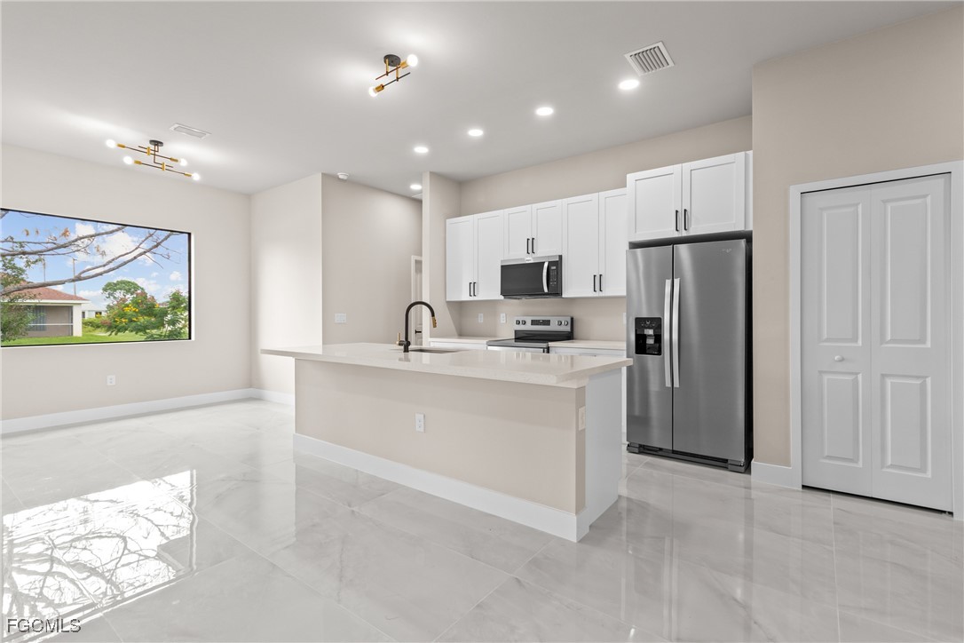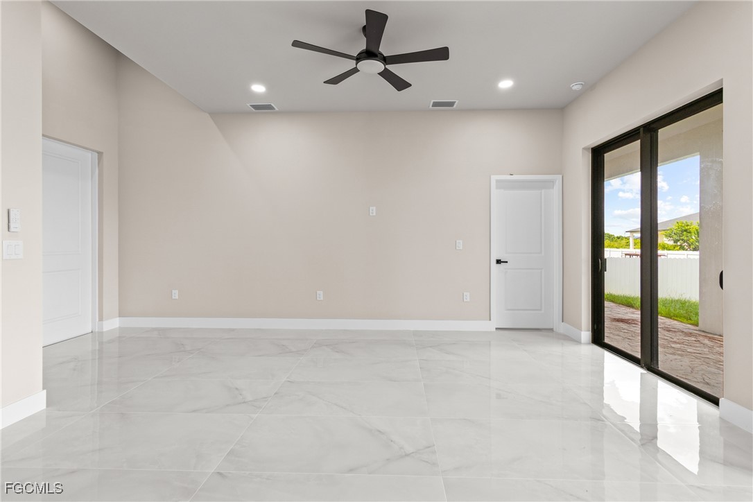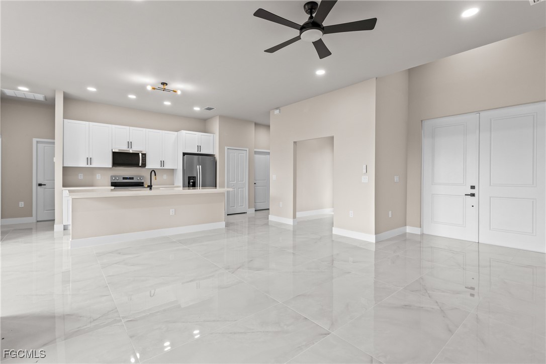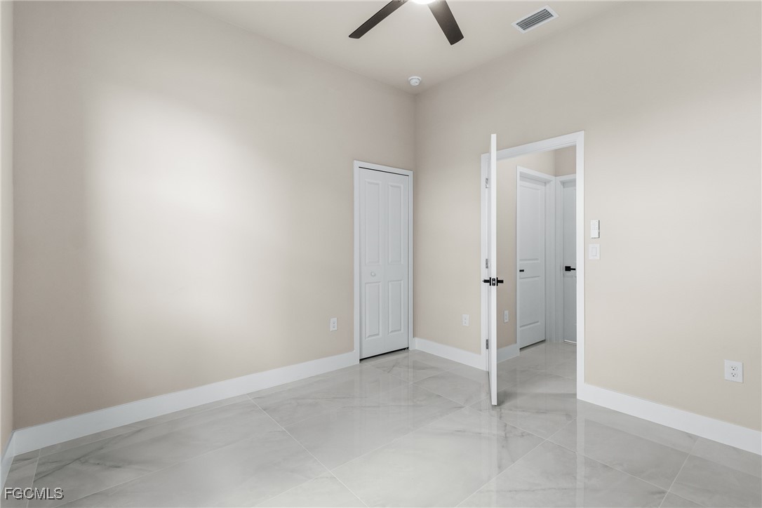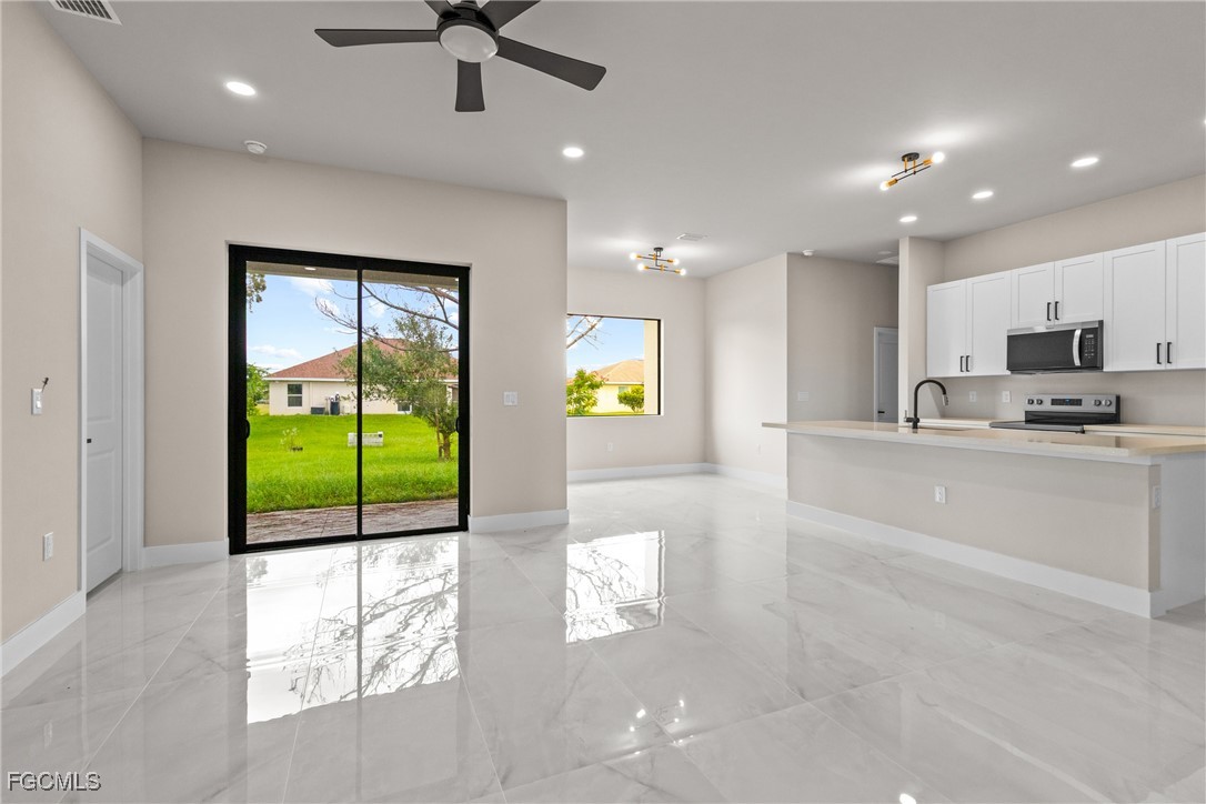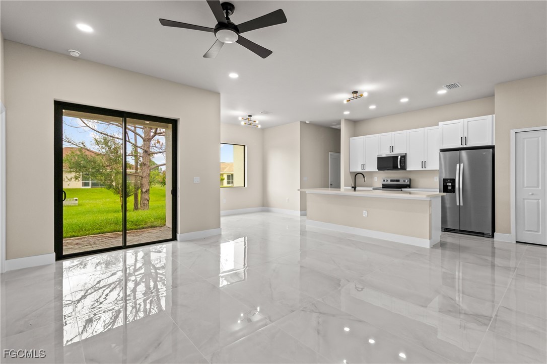 As you step inside, you'll notice the elegant touches that define this property. The kitchen is a true focal point, featuring exquisite quartz countertops that provide both, beauty and durability. The sleek stainless-steel appliances not only enhance the kitchen's aesthetics but also offer modern conveniences for cooking and entertaining. The interior design incorporates a touch of black and gold accents throughout, adding warmth and character to the living spaces. These wooden elements create a harmonious balance with the contemporary finishes, giving the home a unique and inviting atmosphere. Additionally, ceiling fans have been thoughtfully installed to enhance comfort and energy efficiency. The layout is functional and spacious, with three well-appointed bedrooms. The den adds versatility, serving as a home office or guest room. The master bathroom features a shower plus his and her closet and sinks. Plus, we cannot miss the addition made to the back of the home that can be used as a storage for your lawn and patio stuff. The home location in the SW of Lehigh Acres provides convenient access to local amenities, schools, and parks, making it a wonderful place to call home.