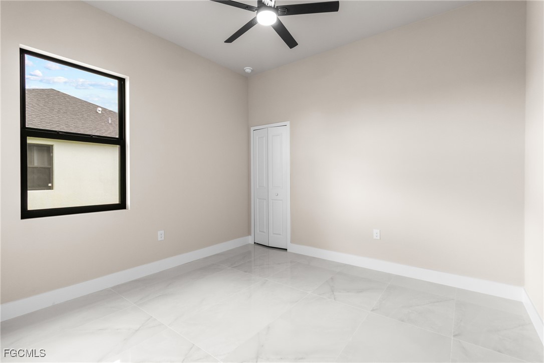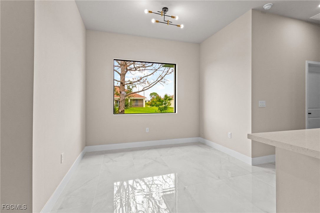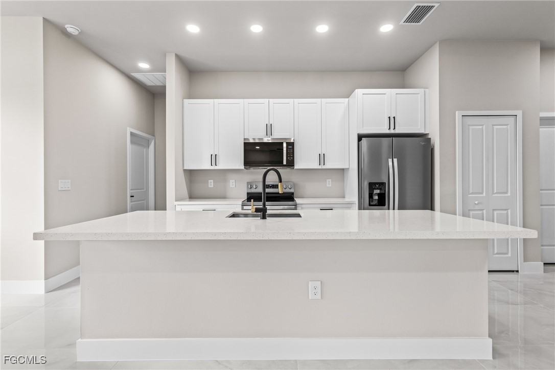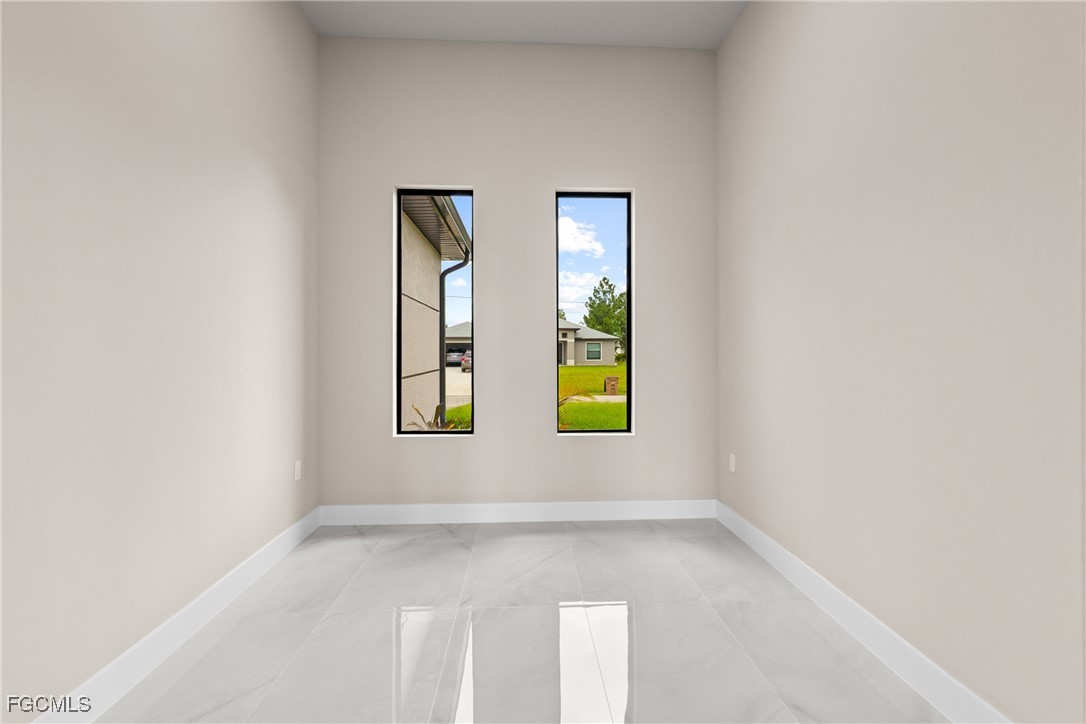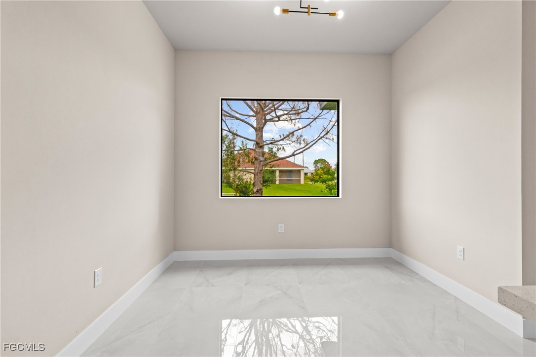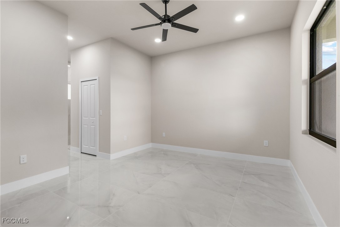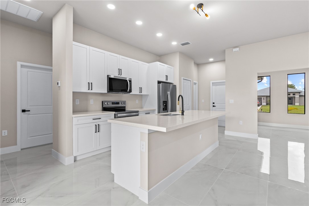 As you step inside, you'll notice the elegant touches that define this property. The kitchen is a true focal point, featuring exquisite quartz countertops that provide both, beauty and durability. The sleek stainless-steel appliances not only enhance the kitchen's aesthetics but also offer modern conveniences for cooking and entertaining. The interior design incorporates a touch of black and gold accents throughout, adding warmth and character to the living spaces. These wooden elements create a harmonious balance with the contemporary finishes, giving the home a unique and inviting atmosphere. Additionally, ceiling fans have been thoughtfully installed to enhance comfort and energy efficiency. The layout is functional and spacious, with three well-appointed bedrooms. The den adds versatility, serving as a home office or guest room. The master bathroom features a shower plus his and her closet and sinks. Plus, we cannot miss the addition made to the back of the home that can be used as a storage for your lawn and patio stuff. The home location in the SW of Lehigh Acres provides convenient access to local amenities, schools, and parks, making it a wonderful place to call home.