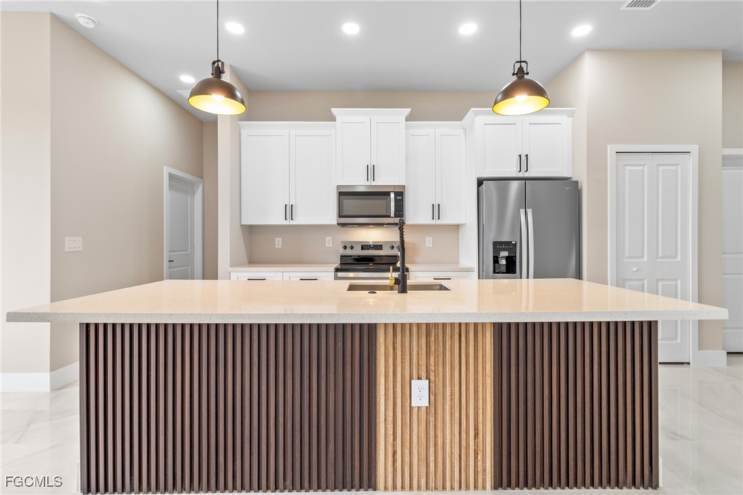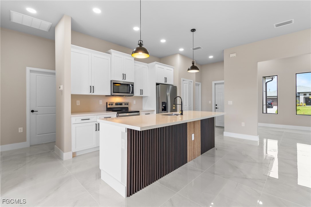 As you step inside, you'll notice the elegant touches that define this property. The kitchen is a true focal point, featuring exquisite quartz countertops that provide both, beauty and durability. The sleek stainless-steel appliances not only enhance the kitchen's aesthetics but also offer modern conveniences for cooking and entertaining. The interior design incorporates a touch of black and gold accents throughout, adding