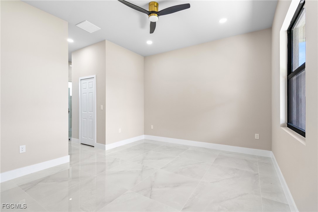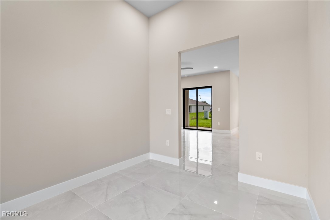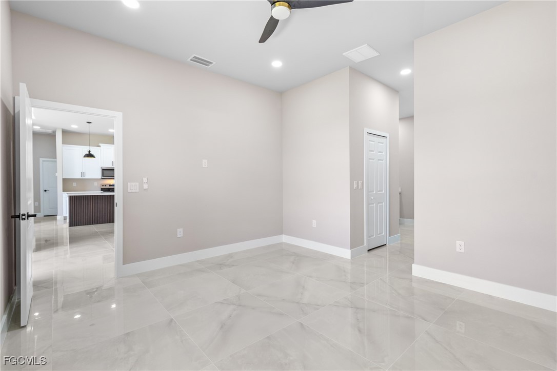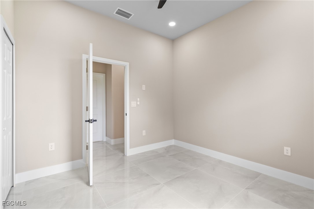 warmth and character to the living spaces. These wooden elements create a harmonious balance with the contemporary finishes, giving the home a unique and inviting atmosphere. Additionally, ceiling fans have been thoughtfully installed to enhance comfort and energy efficiency. The layout is functional and spacious, with three well-appointed bedrooms. The den adds versatility, serving as a home office or guest room. The master bathroom features a shower plus his and her closet and sinks. Plus, we cannot miss the addition made to the back of the home that can be used as a storage for your lawn and patio stuff. The home location in the SW of Lehigh Acres provides convenient access to local amenities, schools, and parks, making it a wonderful place to call home.