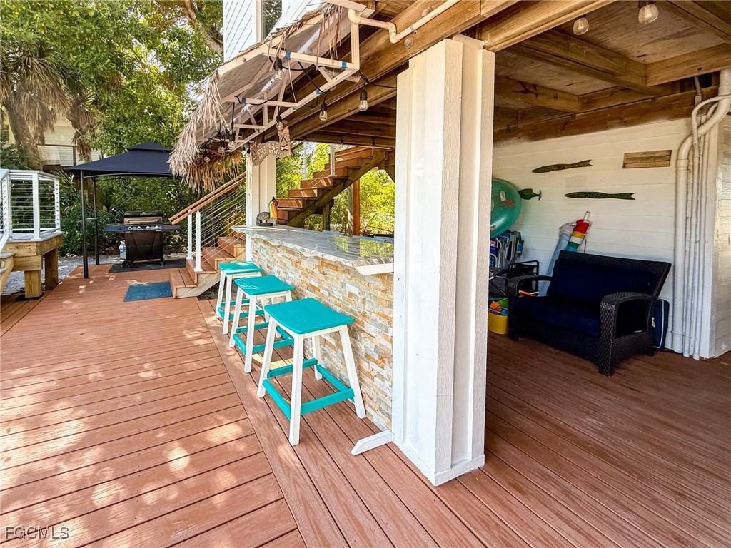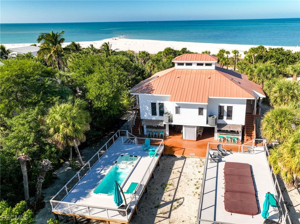 Island Paradise Found: Gulf-Side Retreat with Private Hot Tub/Pool & Tiki Bar! Wake up to your dream beach paradise on North Captiva Island! This exceptionally well-maintained 3-bedroom, 2.5-bath 1/2 duplex oasis offers unbeatable views and amenities designed for luxurious island life. Step inside to an open-concept living area featuring vaulted ceilings, bright coastal décor, a spacious kitchen with granite countertops & stainless steel appliances, plus a counter-height dining bar. This seamless space connects effortlessly to the front porch and sunset deck, providing the perfect venue for gazing at the shimmering Gulf. The primary suite on the main level offers a spa-style bath with a soaking tub and dual vessel sinks. The upper-level main bedroom enjoys panoramic Gulf views and its own private sun deck—a front-row seat to palm trees, pristine sandy beach, and glowing sunsets followed by moonlit water. A charming bunk room comfortably sleeps three, ideal for kids or grandkids. Your private outdoor oasis is an entertainer's dream, complete with a heated pool/spa combo, covered tiki bar, ground-level laundry, half bath, and a grilling station. Built for durability and peace of mind, the home boasts mostly Hardie board siding, a metal roof, and impact-rated doors and windows. A 1/2 interest in a membership to the deeded beach lot across the street ensures a direct connection to the sand and surf. If you are looking for the ultimate island beach retreat with excellent rental potential, 543 Gulf Lane offers unparalleled charm, comfort, and an unbeatable location at a price.