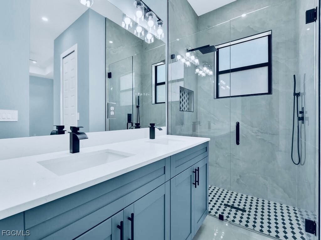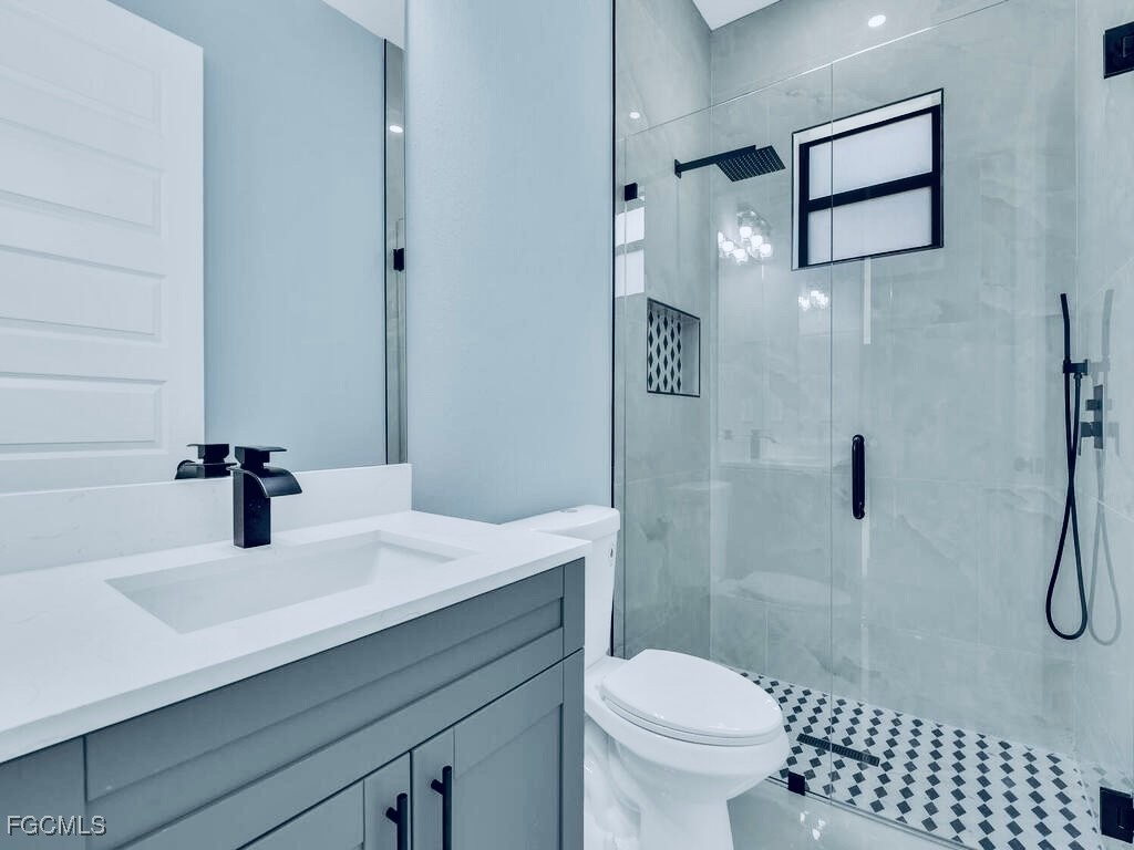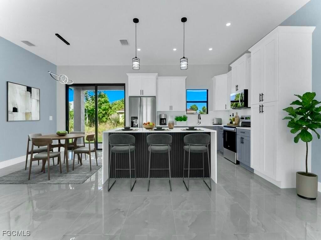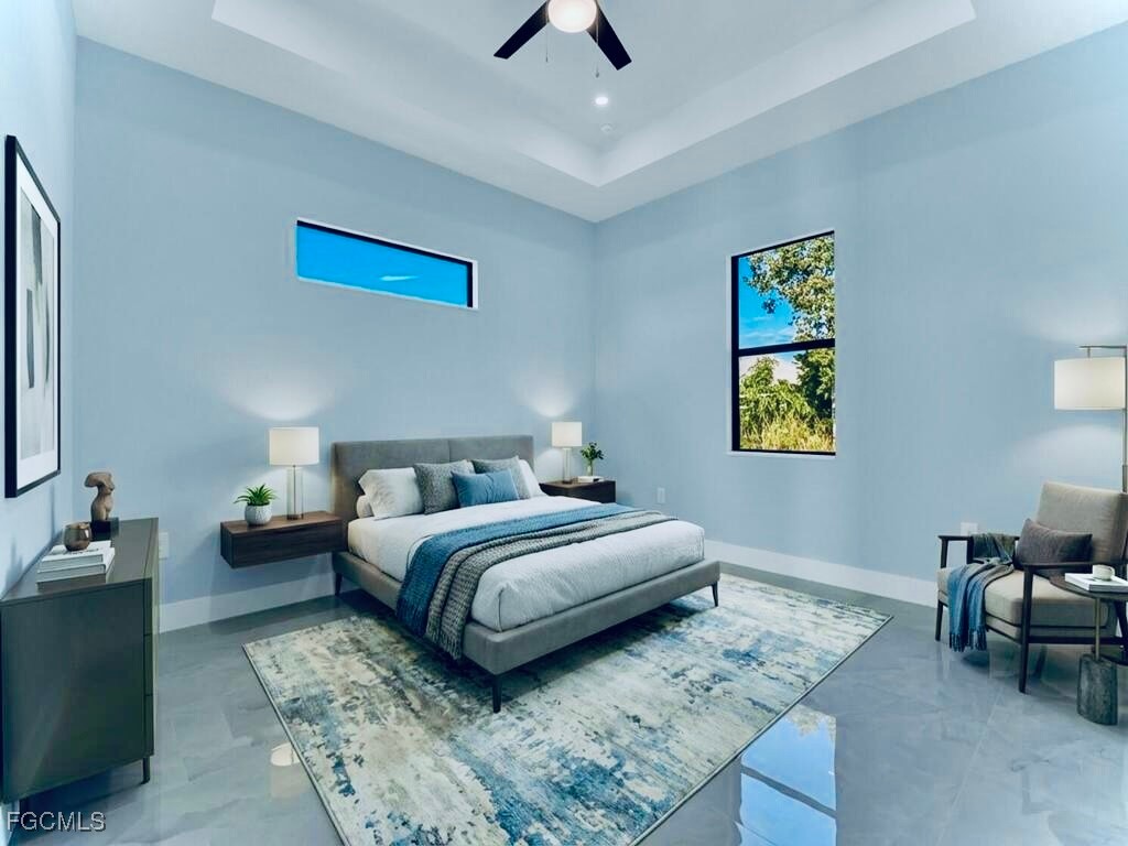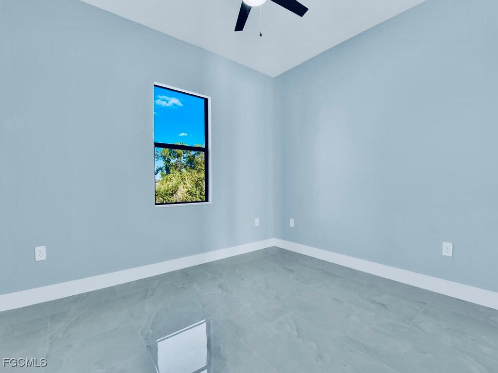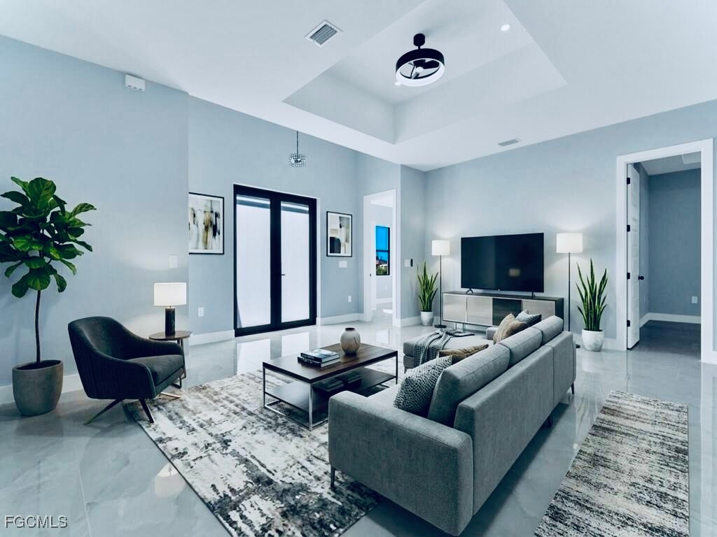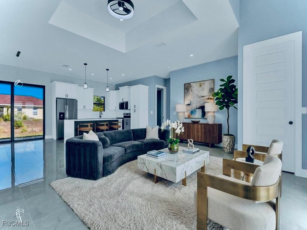 Welcome to this MARVELOUS (2025) BUILT completed 4/2 home nestled away on a quiet street in the HIGHLY DESIRABLE SW side. This GRAND elevation with flattering DOUBLE FROSTED front doors has Multiple TRAY ceilings & 8ft utlimate interior Doors plus a decorative IRON ACCENT at entrance spotlights an impressive OVERSIZED porcelain tile throughout, gorgeous QUARTZ rainfall countertops & backsplash with an inviting Attractive SHIPLAP breakfast bar, STAINLESS STEEL appliances, and SOFT CLOSE SHAKER cabinets with crown molding. It is nicely landscaped including a stone perimeter and highlights IMPACT WINDOWS & DOORS, outstanding TILED walk-in showers with FRAME-LESS glass doors plus rainfall & multiple shower-heads including built-in niches, brilliant soffit lighting, awarding dual sink vanities, elegant bidets, excellent HIGH SPEED internet, and dazzling premium fixtures. It also features pendant & recessed lighting, an EPOXIED garage & entrance, custom mirrors, a built in cabinetry pantry, ideal pocket doors, generous dual closets in master, a Laundry vanity sink, and an awarding back patio great for entertaining. This property is NOT IN A FLOOD ZONE just minutes from all major amenities & a quick commute to Fort Myers! Schedule your showing today!