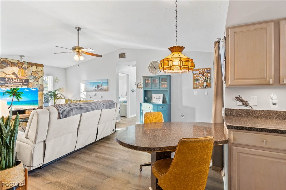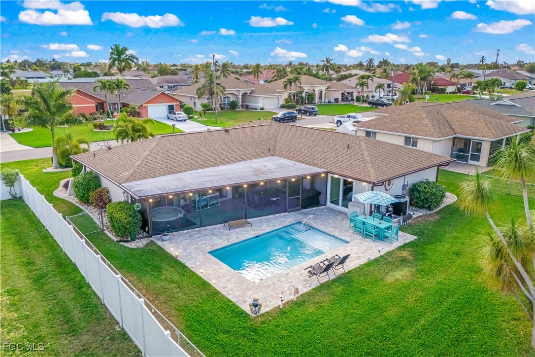 BEAUTIFUL SPARKLING POOL HOME! This 3-bedroom, 2-bath pool home with a 2-car garage, is meticulously maintained and filled with natural light. Designed flawlessly for indoor and outdoor entertainment, there is a brand new sparkling pool, new fencing, and a generous sized screened in outdoor patio - perfect for grilling and entertaining. The lanai with pass-through window adds an ideal spot for gatherings and al fresco dining. Multiple sliders to blend the indoor and outdoor areas create an expanded living area. This is a bright neutral home with a lot of character including a spacious family room with a slate fireplace, generously sized guest bedrooms with walk-in closets, and formal living and dining areas. Master bedroom is split and private and oversized with a beautiful master bathroom. The large fenced yard provides plenty of space for outdoor activities, gardening, or play, surrounded by mature trees and a sprinkler system for easy maintenance. The lanai with pass-through window adds an ideal spot for gatherings and al fresco dining. ALL ASSESSMENTS PAID. no FLOOD ZONE! Located in the heart of Cape Coral with easy access to the Midpoint Bridge, shopping and dining, you are not far from anything! This home combines thoughtful updates, a prime location, and a stunning outdoor living space—a rare opportunity that’s truly worth seeing in person.