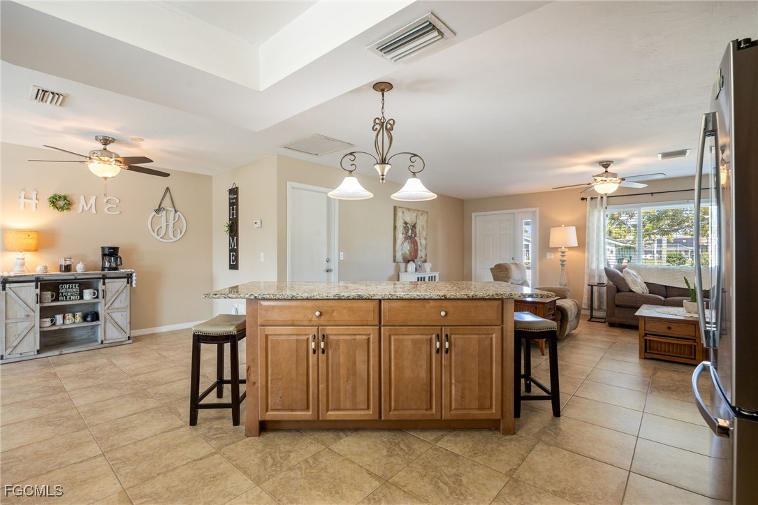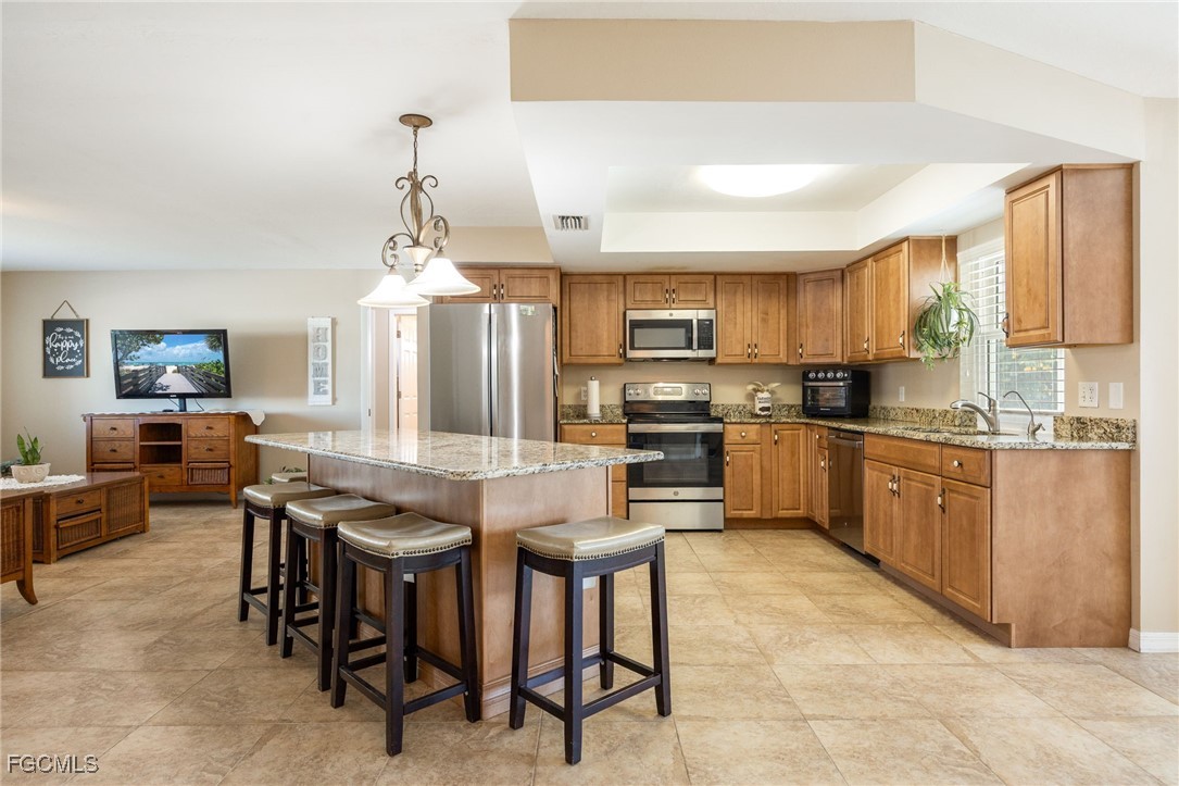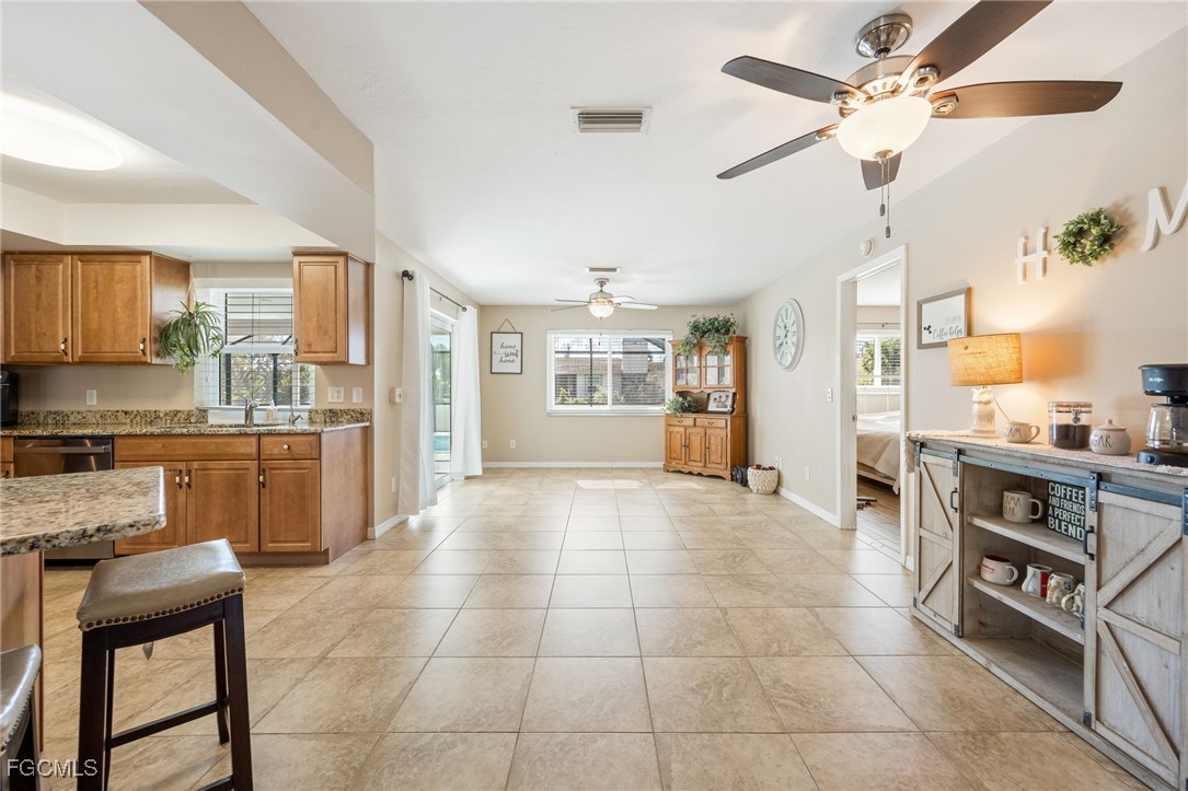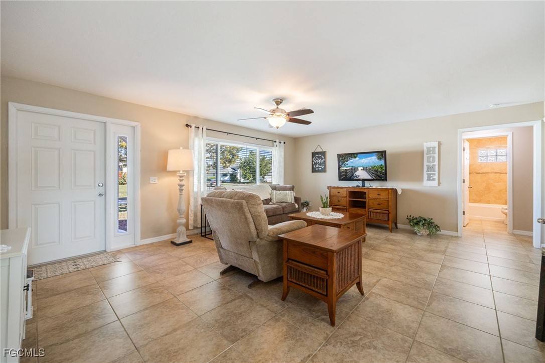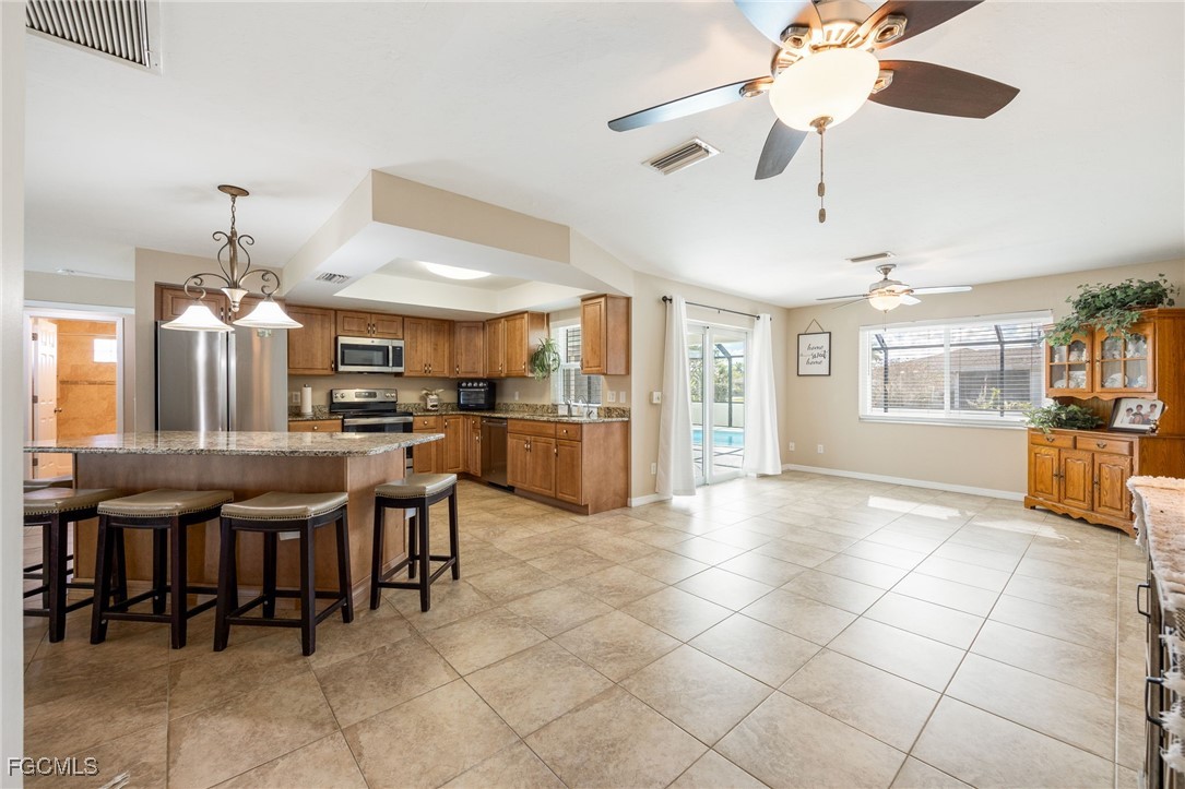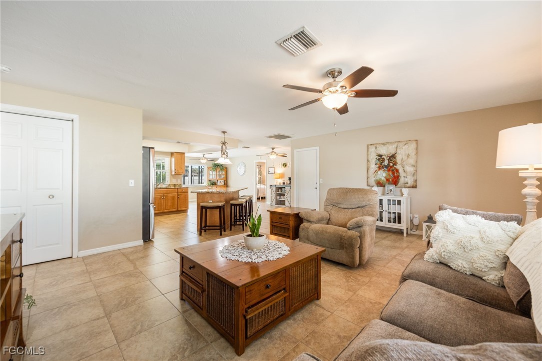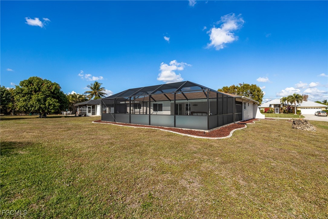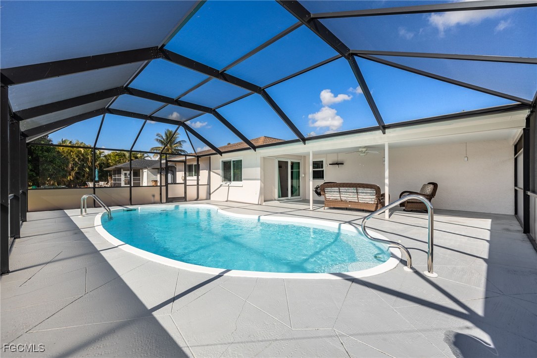Welcome to this beautifully maintained 3-bedroom, 2-bath pool home located on a desirable corner lot in the heart of SE Cape Coral. Just under 1,500 square feet, this home showcases pride of ownership throughout and has been meticulously cared for by the current owners, painted in 2025. The updated kitchen is the heart of the home, featuring granite countertops, woodgrain cabinetry, and a convenient breakfast bar island, perfect for everyday living and entertaining. The open layout flows seamlessly into the living and dining areas, creating a warm and inviting atmosphere. The split floor plan provides ideal separation between the guest bedrooms and the primary suite. The primary suite features a generously spacious sleeping area and a beautifully updated private en suite bathroom. Step outside to your private pool oasis, surrounded by a new pool cage and a beautifully landscaped yard accented with decorative lava rock and curbing, offering both curb appeal and low-maintenance living. Additional highlights include a finished garage with a full-wall workbench, ideal for hobbies, storage, or projects, and a thoughtful layout that maximizes space and functionality. There is a laundry tub located next to the washer and dryer. This home has impact windows and updated storm doors throughout for your familys safty during storms. Ideally located near the Midpoint Bridge, Del Prado Boulevard, shopping, dining, schools, entertainment, sports complexes, the Caloosahatchee River, and downtown Fort Myers, this home offers convenience without sacrificing comfort. This is a move-in-ready property that truly stands out for its condition, location, and attention to detail. Schedule your private showing today—homes this well cared for don’t last long!