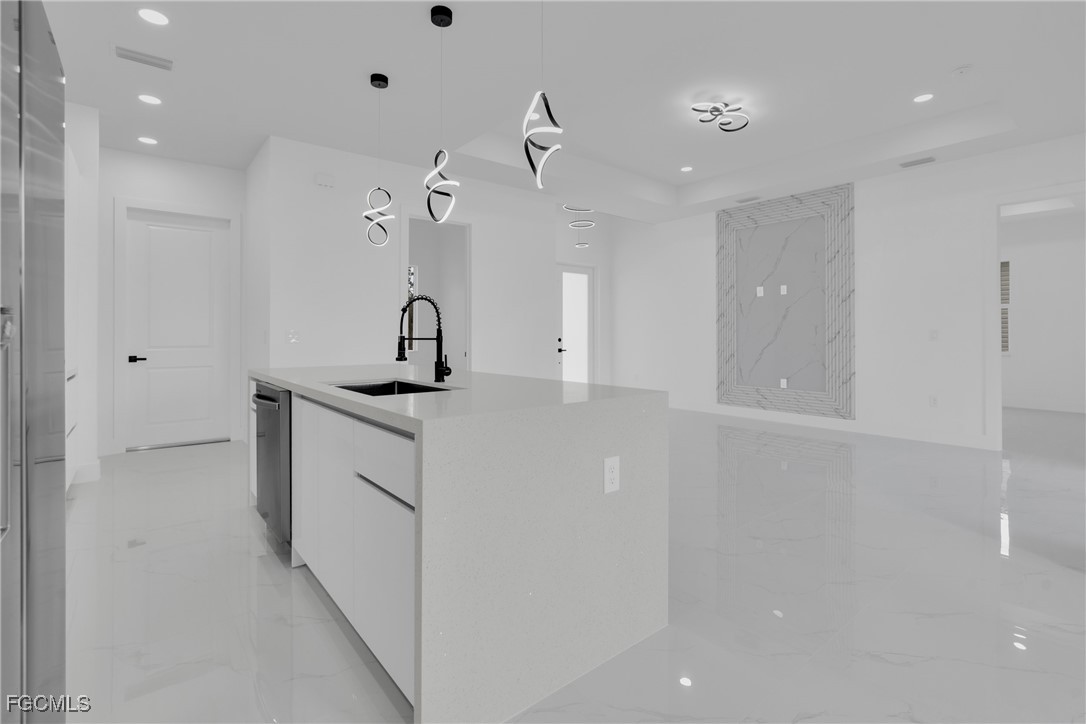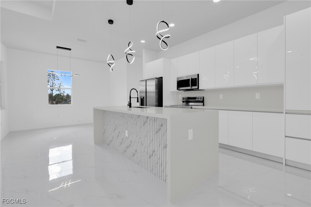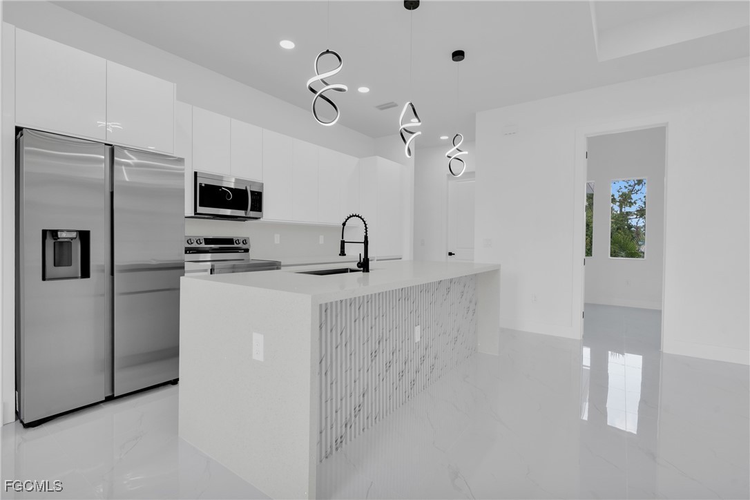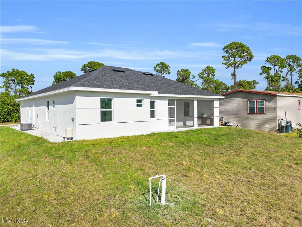 **HOME IS READY TO MOVE IN **Your Dream New Construction Home in Lehigh Acres! Don’t miss this incredible opportunity to own a beautifully crafted waterfront, brand-new residence Lehigh Acres! This thoughtfully designed 3-bedroom, 3-bathroom home with a versatile den offers modern elegance, comfort, and style throughout. Step inside to discover an open-concept layout highlighted by sleek white porcelain tile flooring, soaring 8-foot interior doors, and impact-resistant windows and doors for ultimate peace of mind. The heart of the home, the kitchen, boasts stainless steel appliances, a striking quartz waterfall island, elegant 42” white elegant acrylic cabinets — perfect for entertaining or enjoying everyday meals in style. The luxurious primary suite features a walk-in closet, dual vanity sink, and enclosed by frameless glass doors. All 3 bathrooms are designed with upscale finishes and attention to detail. Additional highlights include a dedicated office/den, a covered open lanai, 2-car garage, and energy-efficient A/C system with individual returns in each room for better airflow and temperature control. NO HOA fees NO FLOOX ZONE and a 1-year structural warranty included for your peace of mind. This home is the perfect blend of function, luxury, and location. Schedule your private showing today — your new beginning starts here!