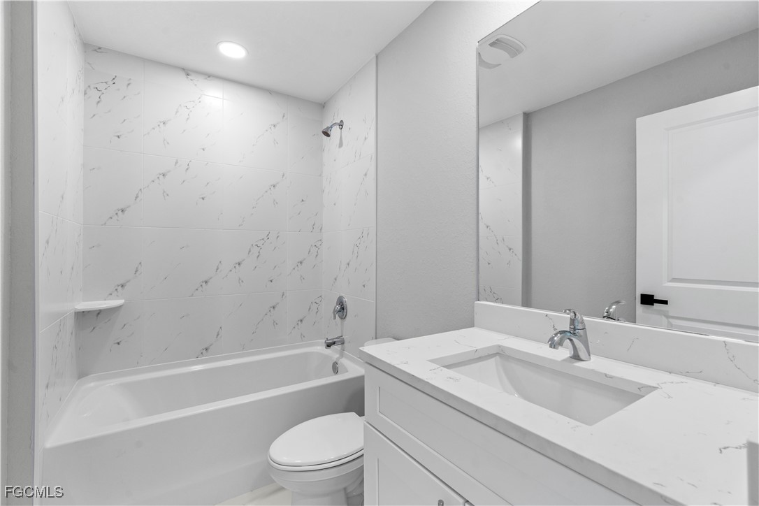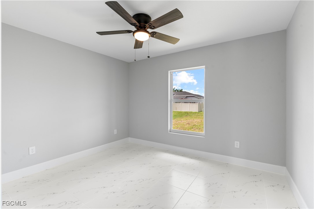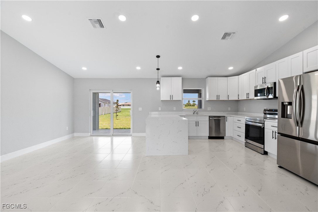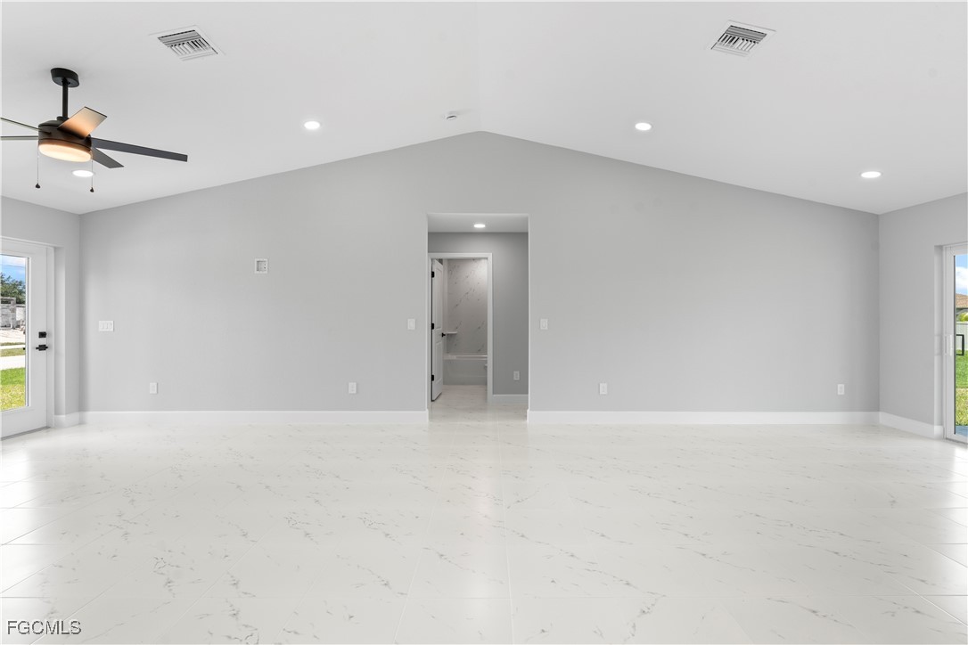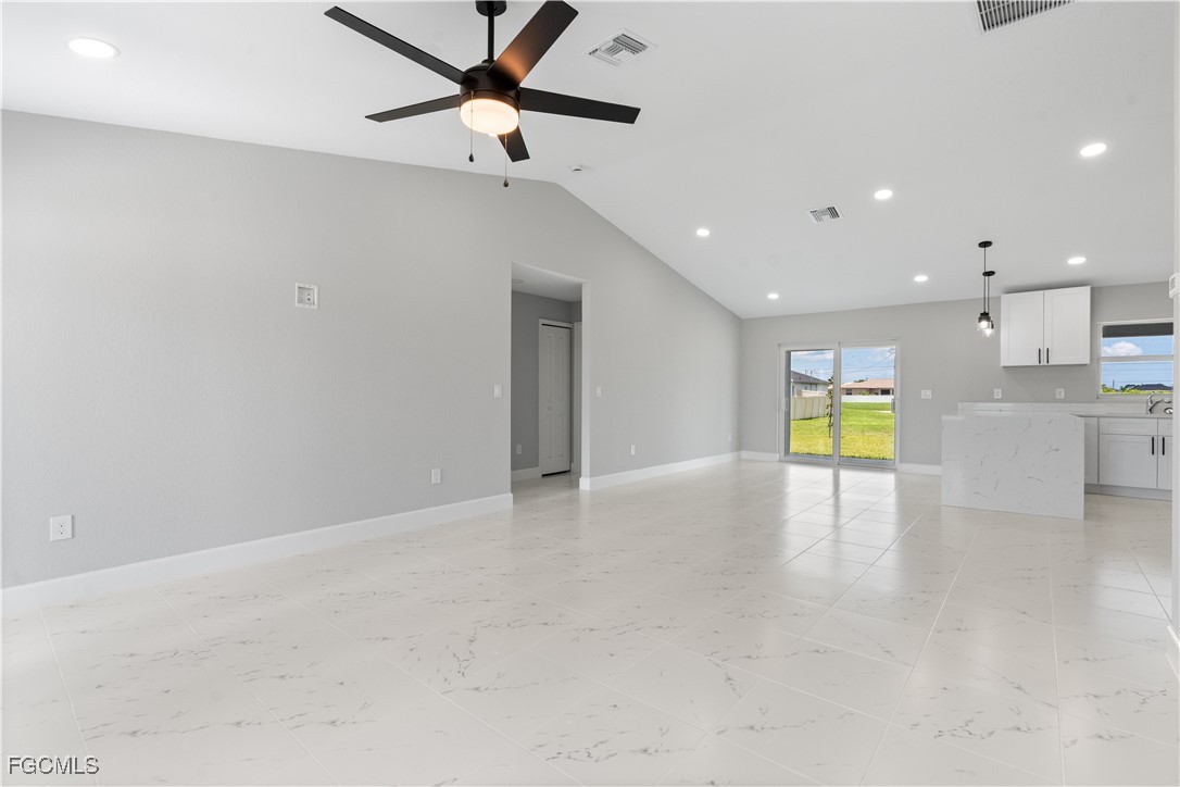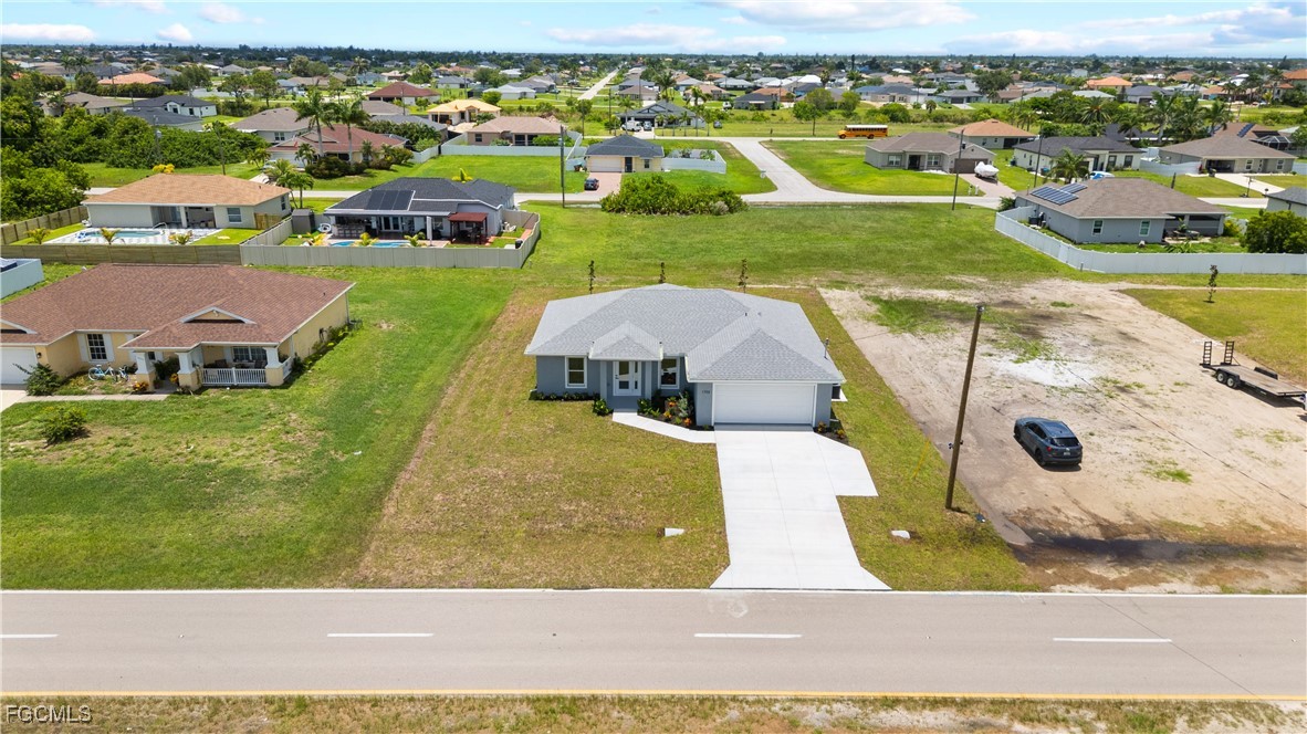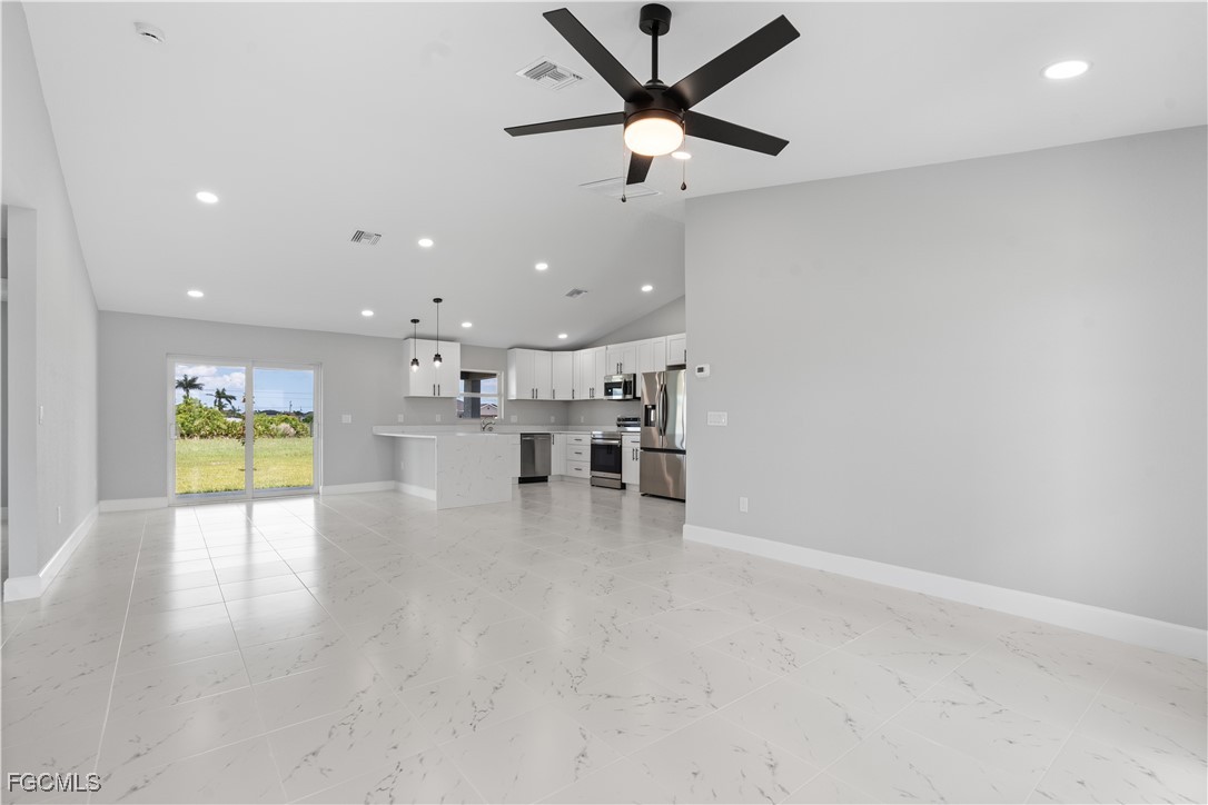 NO FLOOD ZONE. See this brand-new 1,500 square ft home in Cape Coral on CITY WATER WITH ASSESSMENTS PAID IN FULL. This beautiful home features 3 bedrooms and 2 bathrooms of comfortable living space. The home is situated with an oversized back yard. Entering through the sidelit front entryway, you are welcomed by the open floor plan with a vaulted 12’ cathedral ceilings and upgraded floor tile throughout the home. The living room incorporates an energy efficient, impact resistant sliding door and windows for an abundance of natural light. The spacious kitchen is open to the main living areas. It features brand-new energy-efficient stainless-steel appliances, quartz countertops, a pantry, a beautiful waterfall center island with plenty of storage and bar-top seating. The cabinets feature Shaker soft close doors and drawers through out with a dining area overlooking the oversized covered lanai and backyard. The master suite offers upgraded tile throughout with a walk-in closet and bathroom with dual sinks and a large shower. The guest bedrooms and bathroom also include upgraded floor tile with ample space for children or welcomed guests. Lighted ceiling fans adorn all of the bedrooms and living room. The home is upgraded for HDMI and USB in each room. Modern finishes throughout make this home move-in ready. Located in a great neighborhood with easy access to shopping, dining, and more. This home offers comfort, convenience and style at an affordable price with all of the many upgrades.