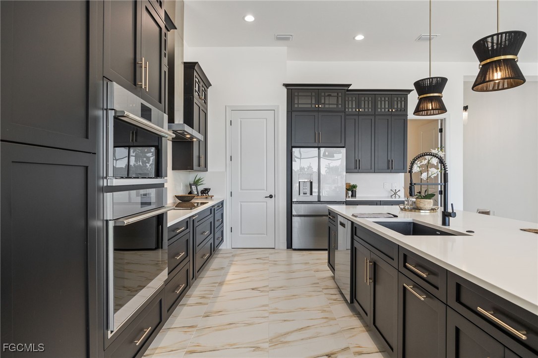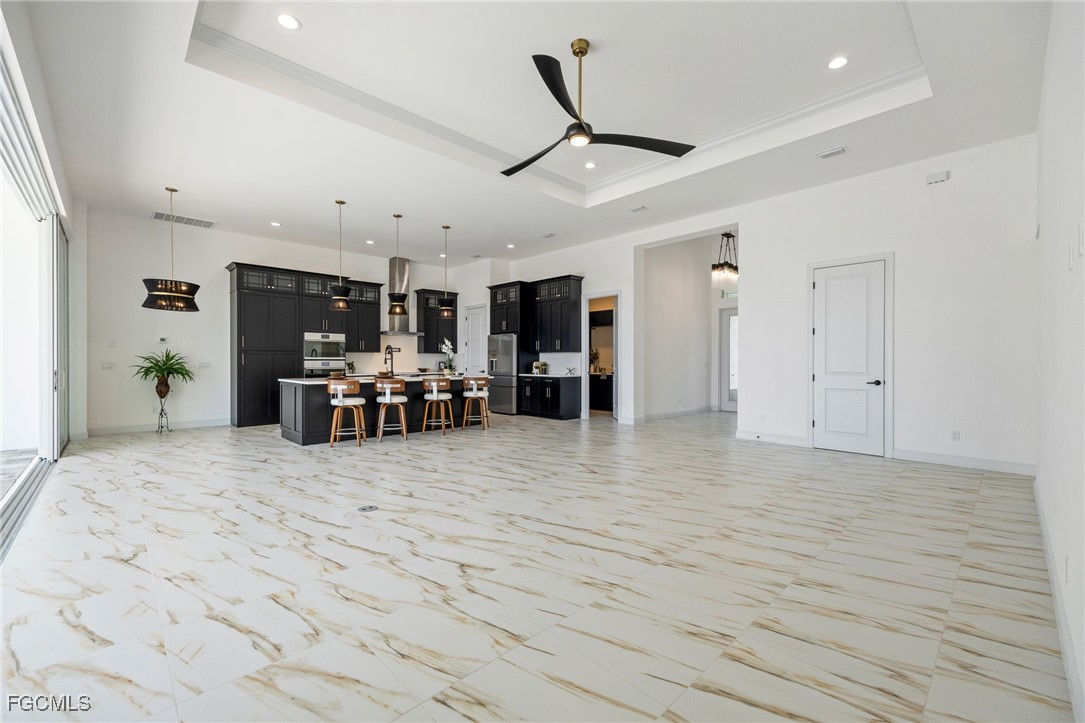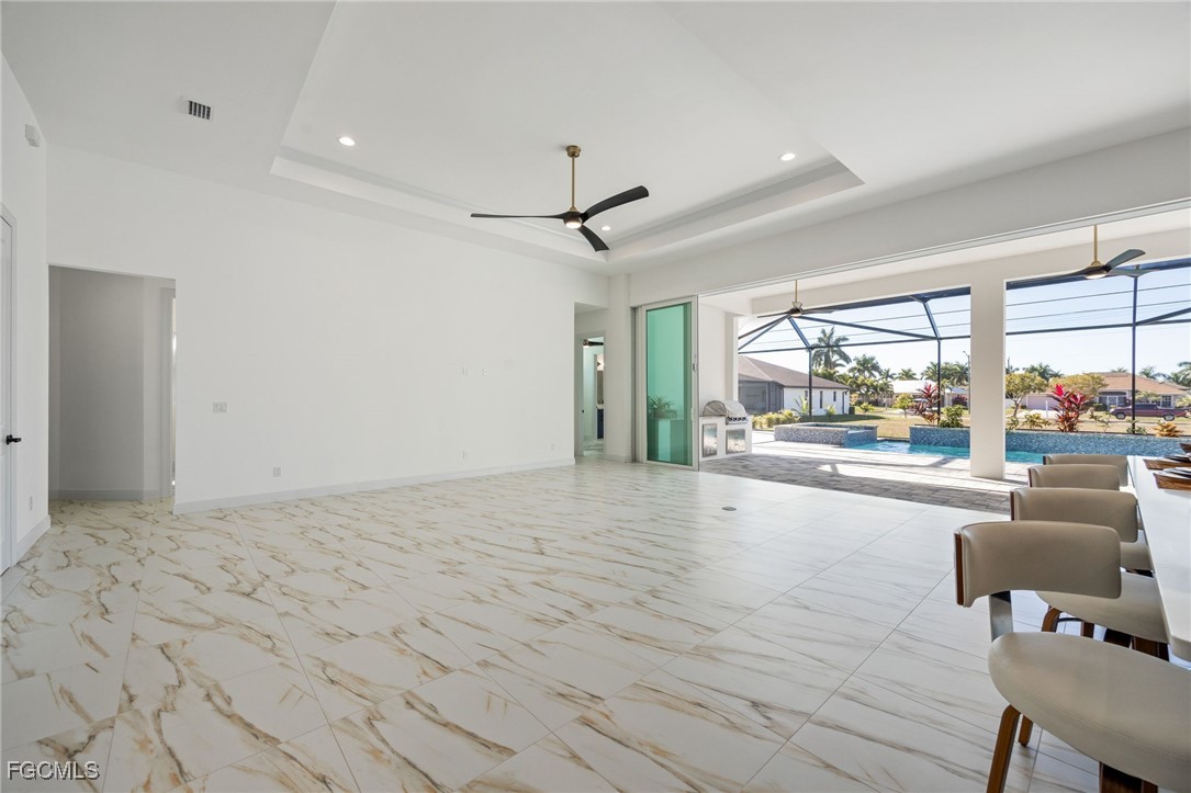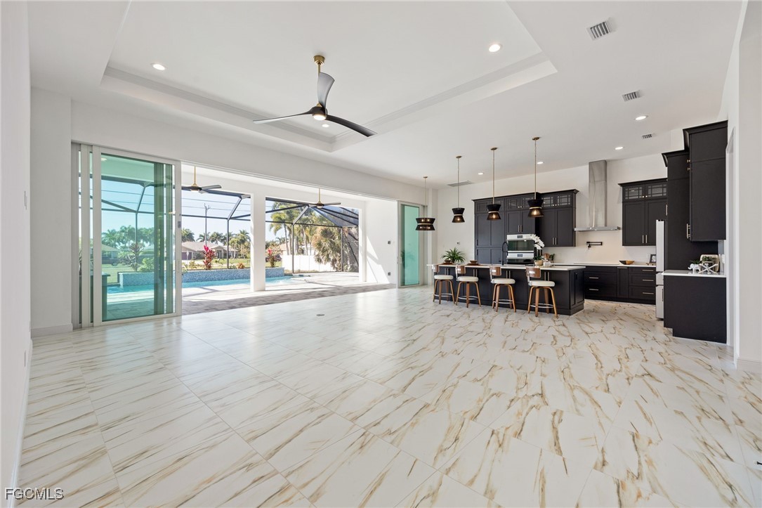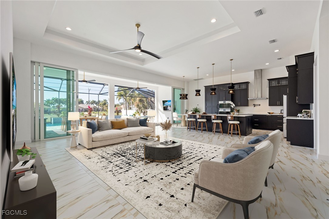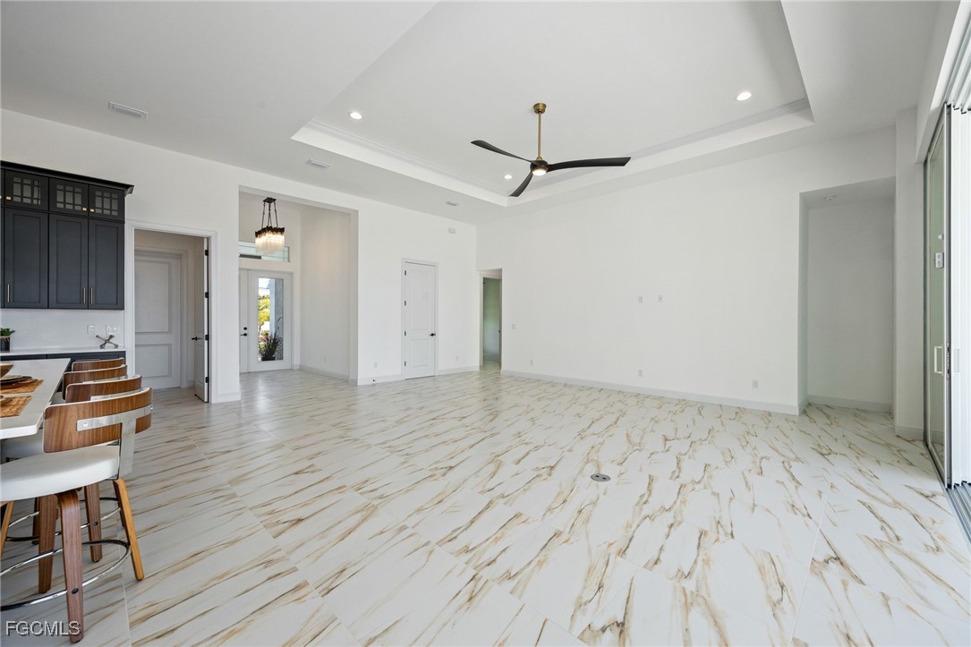 Brand-new and never occupied, this custom residence is available now—no construction delays, no waiting. Step through the double-door entry and into a spacious great room that immediately sets the tone for the home’s thoughtful design and quality craftsmanship. Custom-selected tile flooring introduces character and style while maintaining a bright, clean, and enduring aesthetic. Generous ceiling heights, solid-core interior doors, and enhanced sound insulation elevate both comfort and livability. The kitchen anchors the home with custom wood cabinetry, quartz surfaces extending from counters to backsplash, a pot filler, and a premium appliance package featuring an induction cooktop and advanced built-in ovens. Discreetly integrated within the cabinetry is a hidden entry leading to the primary suite—a private retreat showcasing a coffered ceiling, crown detailing, dual walk-in closets, a dedicated water closet, an expansive double shower, and a freestanding soaking tub complemented by designer fixtures. A well-planned split-bedroom layout provides four additional bedrooms and two-and-a-half baths, including a conveniently located pool bath. The laundry room is fully outfitted with a stacked washer and dryer, quartz workspace, utility sink, and overhead hanging storage. Additional interior upgrades include large-format tile installed with a crack-suppression membrane, pre-wiring for wall-mounted TVs in every bedroom, full impact-rated windows, doors, and sliding glass openings, and a high-efficiency spray-foam insulated attic with the air handler positioned inside the home. Seamless indoor-outdoor living is achieved through an impressive 32-foot-wide by 10-foot-tall sliding glass wall that opens to a west-facing lanai. The outdoor space is equipped with a built-in kitchen and overlooks a saltwater pool and spa with heater, sun shelf landing and water feature including an automatic pool fill, all enclosed by a reinforced cage with concrete-filled posts. The three-car garage is fully finished, insulated, and features an epoxy flake floor. Exterior construction reflects true custom standards, including stucco-finished exterior ceilings, a standing-seam metal roof with concealed fasteners, and materials selected for durability and efficiency. The overall level of finish and attention to detail throughout the home clearly reflects a higher standard of craftsmanship rarely found in new construction. Ideally located within walking distance to Cape Harbour’s restaurants, shopping, and marina lifestyle. This is an AnnieMac Rate Relief Eligible Property where the mortgage interest rate is reduced for the life of the loan to 5.875%. See full details and disclosure available through the listing agent.