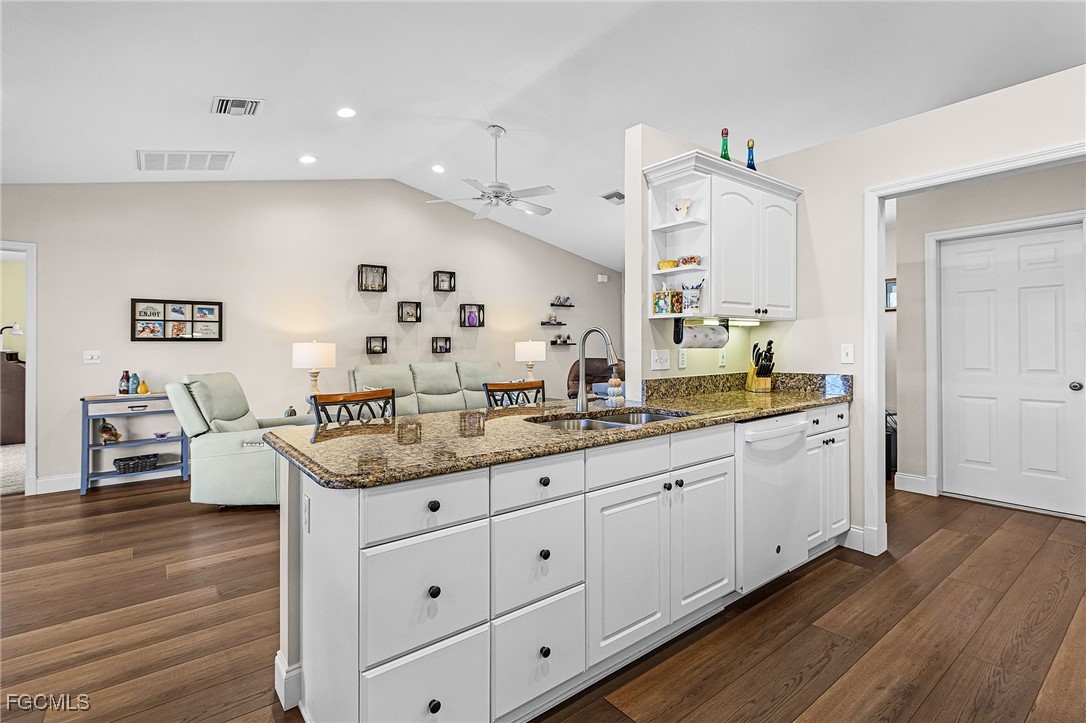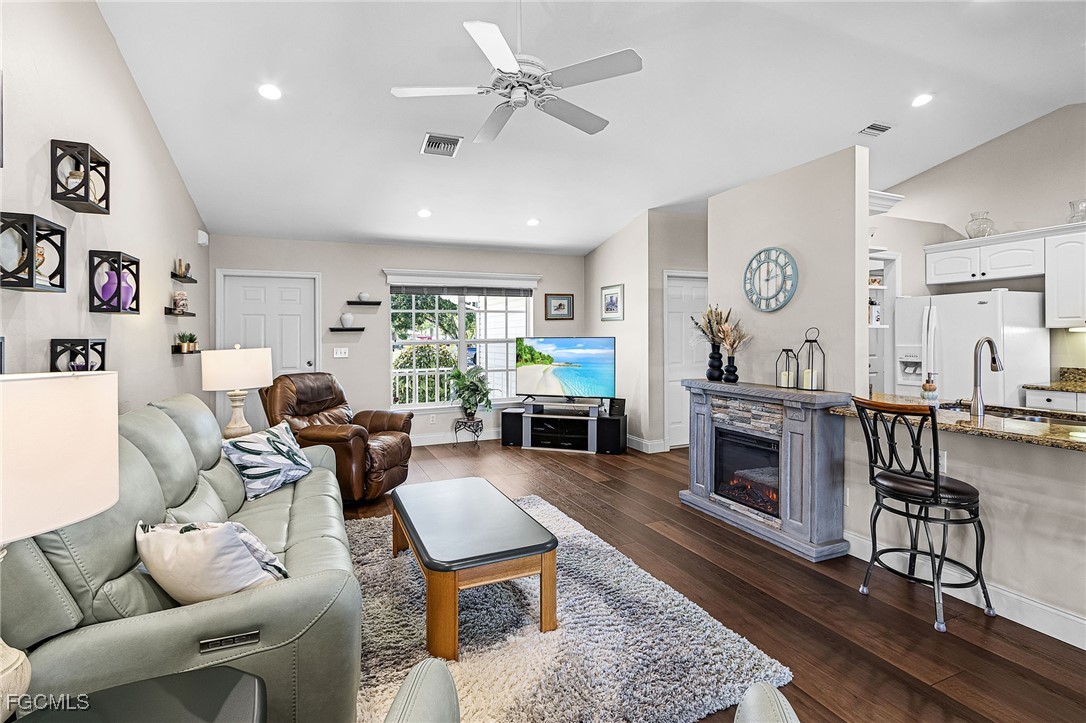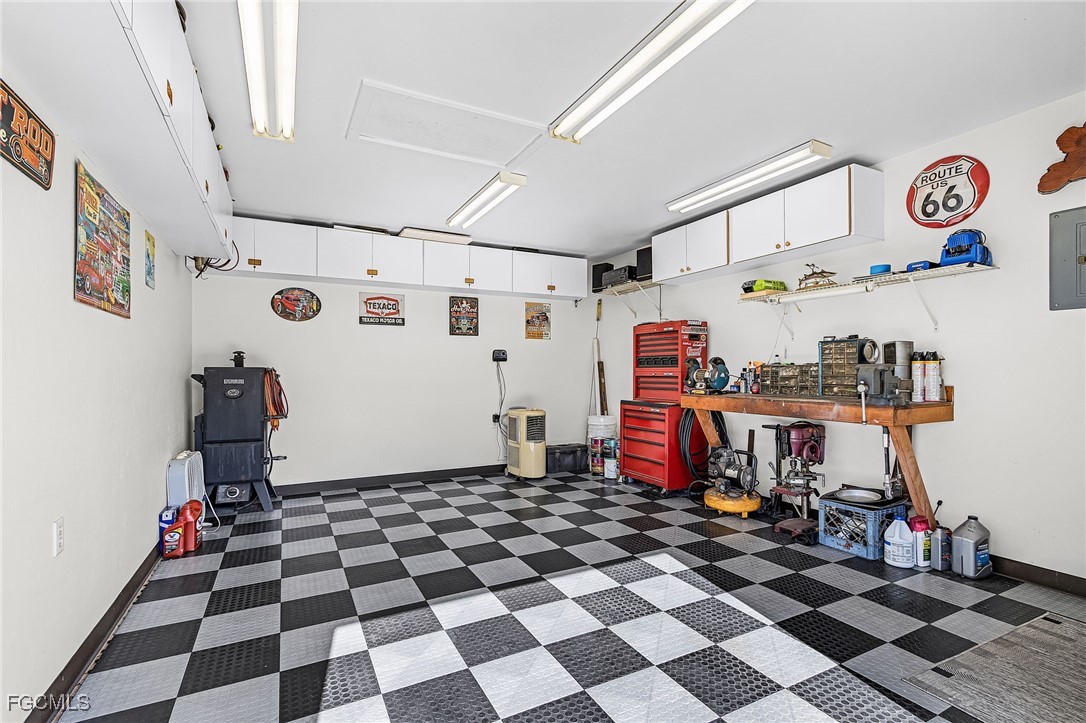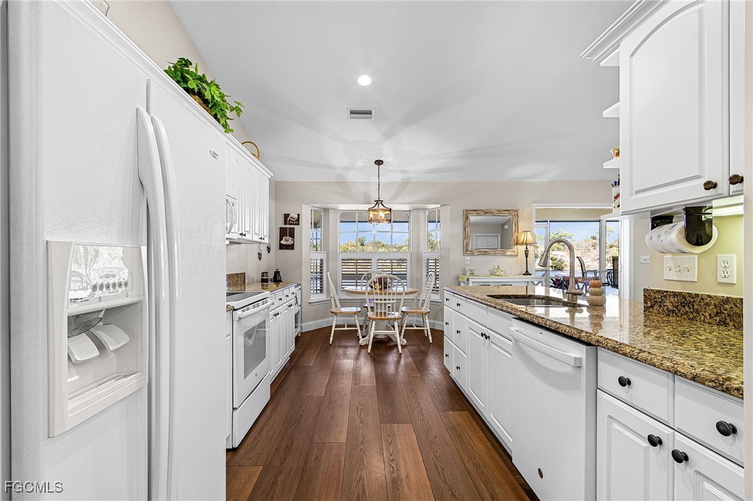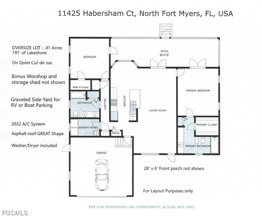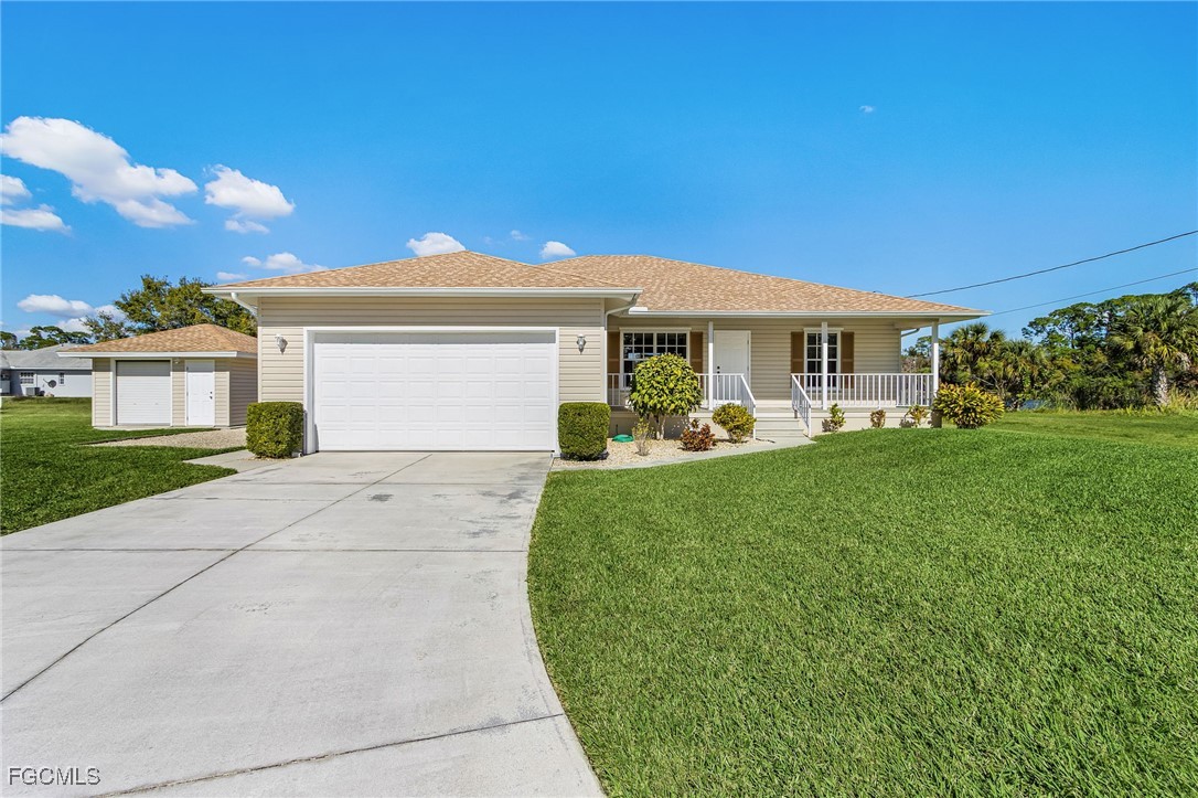 If you are looking for an IMMACULATELY maintained home with a quiet lake view – look no more! The BEAUTIFUL 2-bedroom, 2-bath home is located on an oversize .41 acre lot with 191’ of lake shoreline is a MUST see! This home has so MUCH curb appeal and exudes ‘pride of ownership’ inside and out! This one-owner home literally looks brand new because of the EXCEPTIONAL maintenance and upkeep. When you drive up you are greeted by the luscious green grass and beautiful landscaping, a large front patio with plenty of room for patio furniture. Enjoy the wonderful OPEN split floor plan, luxury woodgrain plank vinyl floor in living areas, laundry room and bathrooms for easy upkeep. The home has vaulted ceilings and feels so much larger than the 1,441 square feet. The lovely kitchen has granite countertops, white raised panel cabinets, white appliances, pantry closet off kitchen, and a breakfast nook with plantation shutters. Once you are inside it will be hard to take your eyes off the expansive lake view through French doors in the living room. The large master suite has French doors to the lanai, lake view, carpet, a large walk-in closet, bright white quartz countertop with makeup setting area, attractive fixtures with dual mirrors, shower tub combination, and linen closet for extra storage. The guest room has a huge walk-in closet, carpet and door opens to the screened lanai. The guest bathroom has tub/shower combination, dual sinks, and large linen closet for extra storage. You will make good use of the two additional storage closets located in the hallway. The laundry room is complete with storage cabinets, newer front loading washer and dryer, laundry sink and natural light. You will love the tranquil lake view where you can enjoy peaceful outdoor living that is perfect for relaxing with a cup of coffee, evening meal, or entertaining guests. The spacious screened lanai is approximately 36’ x 10’ with composite decking. The front porch is 28'x6' with composite decking. The 2-car garage is also immaculate! It has a side door that exits to a large, graveled area between home and the detached BONUS workshop. The graveled area has room for RV or large boat parking. This dream workshop-man cave has a single door, a roll up door, storage cabinets, checkerboard structural plastice flooring pads that you can drive on, and lots of lighting. Just behind the detached workshop is a large metal shed for additional storage space and is where the hurricane shutters are located. You will never have to paint the outside as it has beautiful vinyl siding. AC system was installed in 2022. The asphalt roof is in great shape as well. All assessments paid. Don’t miss out on your piece of paradise so call TODAY for a private showing!