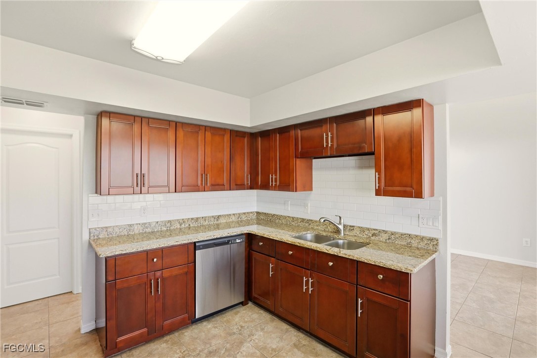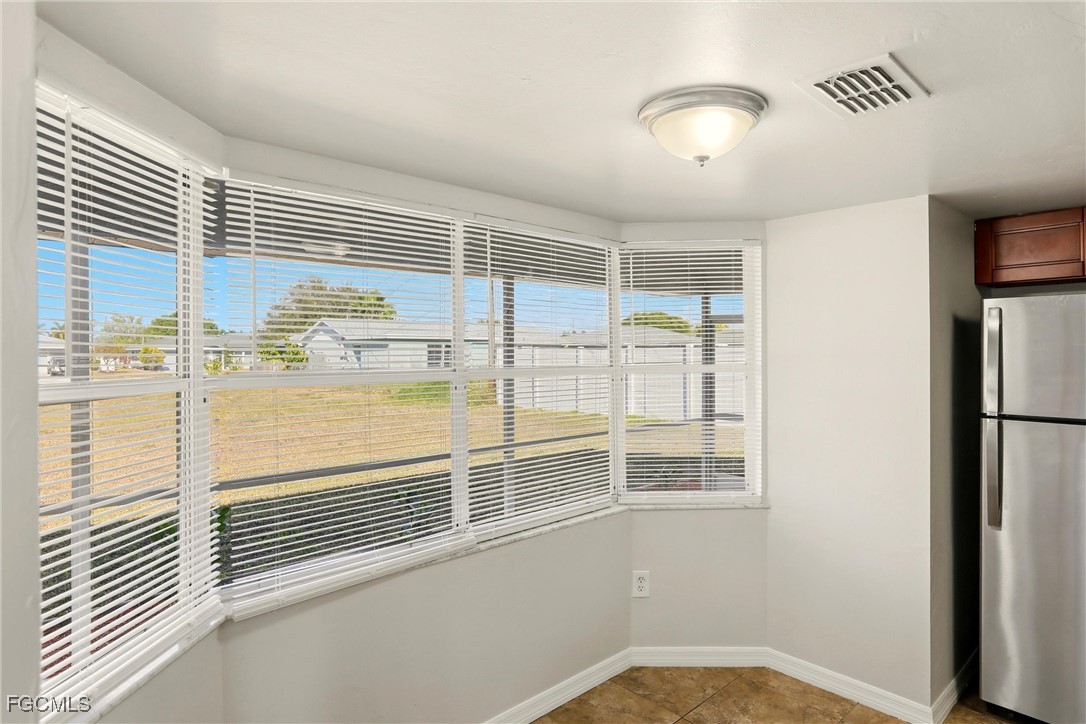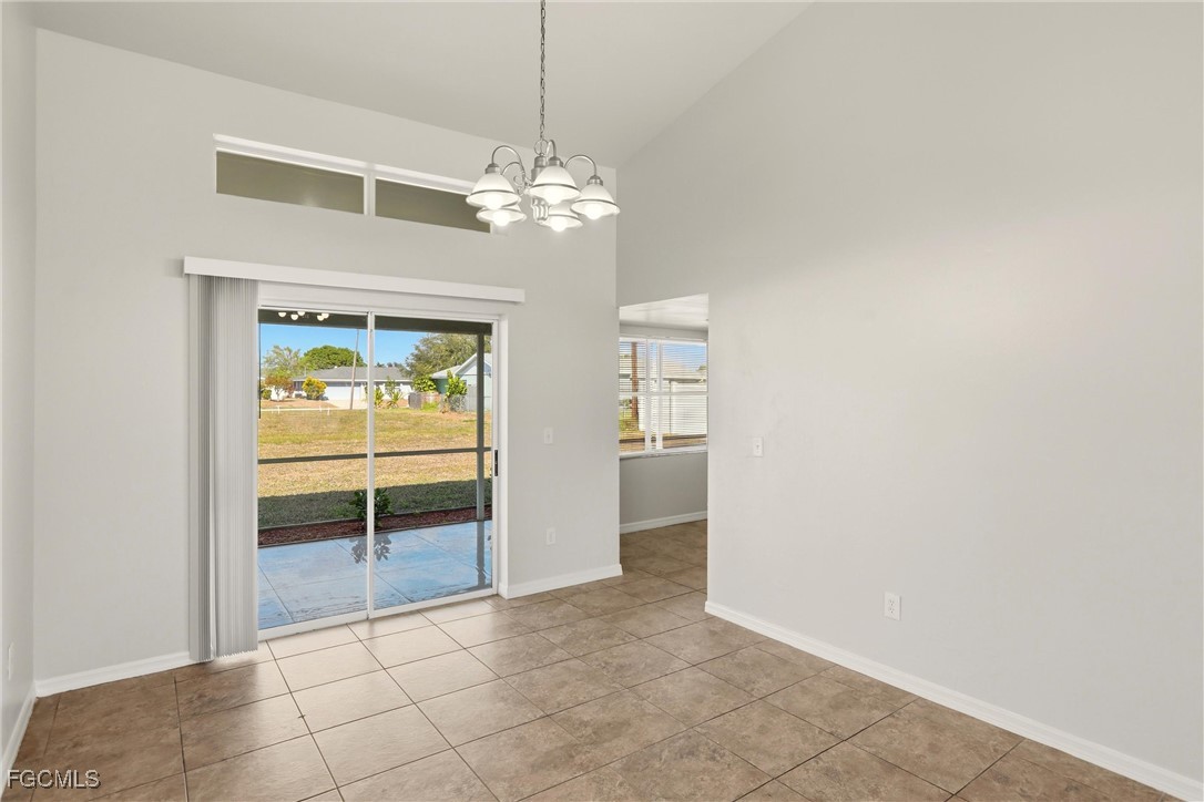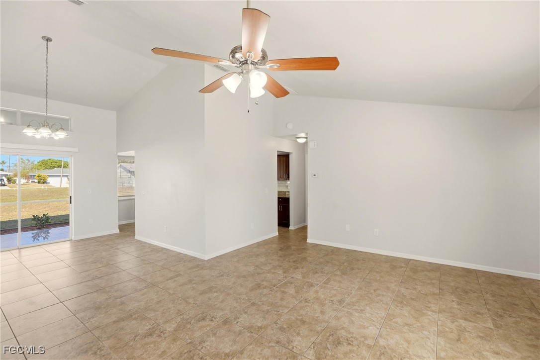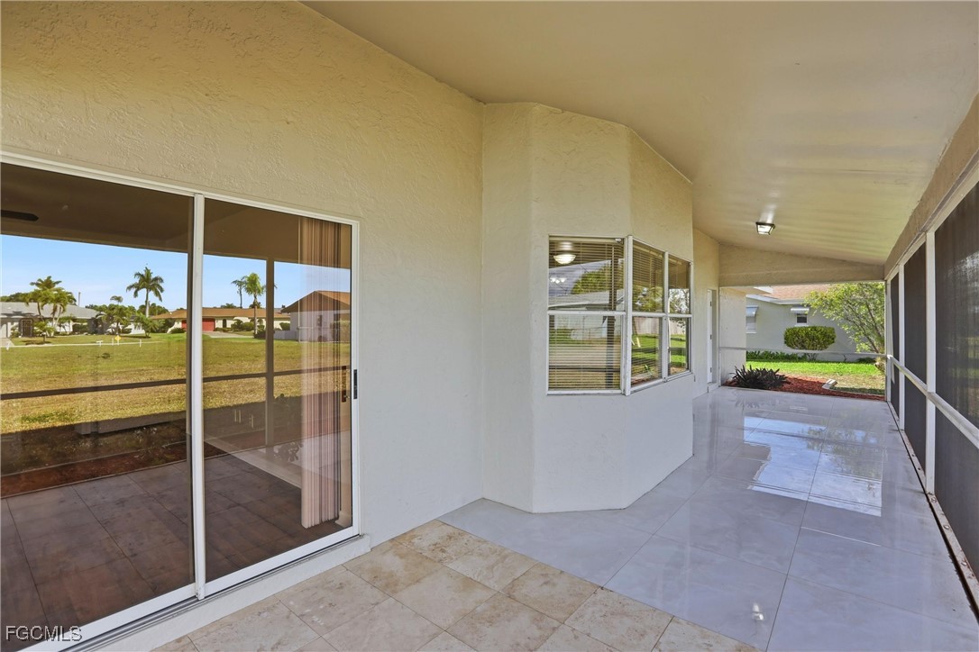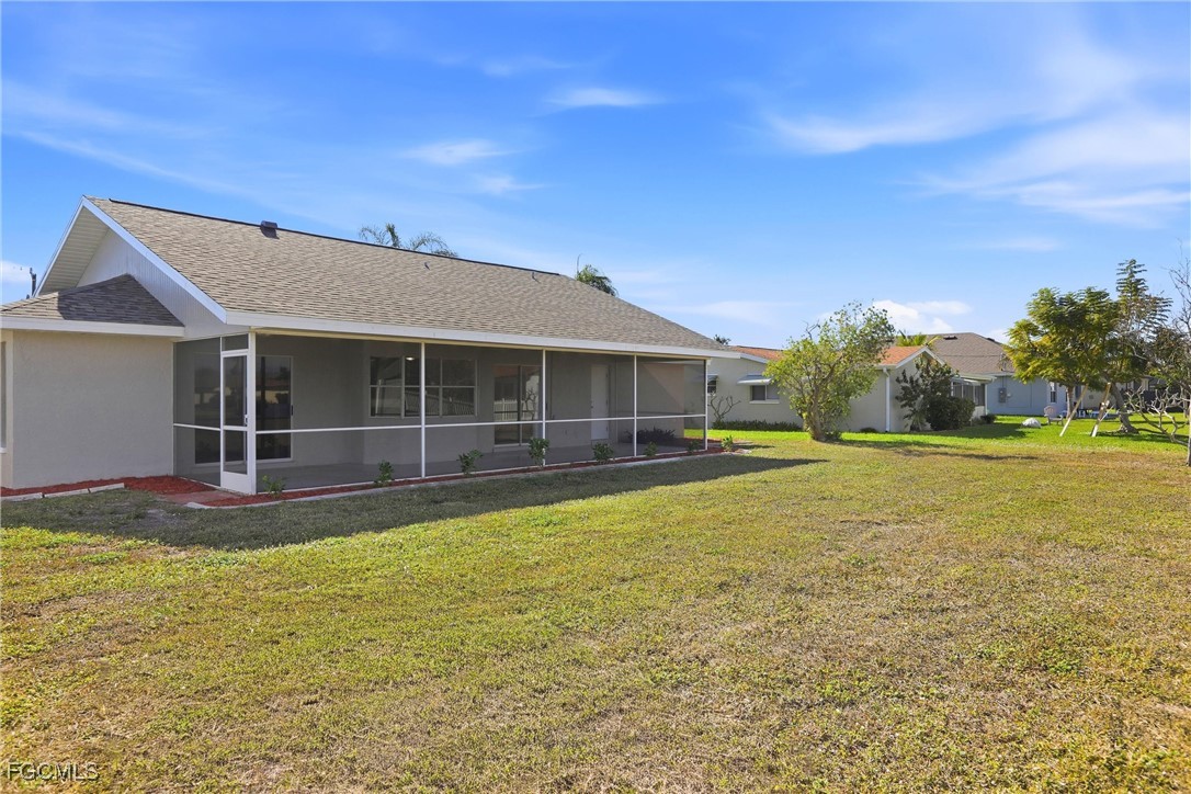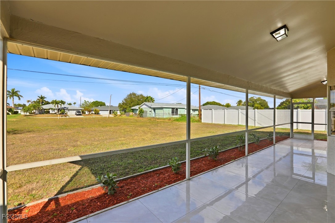 Located in a prime Southeast Cape Coral neighborhood, this well-maintained 3-bedroom, 2-bath home offers 1,522 square feet of comfortable living space with easy access to downtown Cape Coral, Fort Myers via nearby bridges, local parks, and area amenities. Fresh interior and exterior paint, updated landscaping, and new window coverings create an inviting first impression, while the light-filled living and dining area features tile flooring, vaulted ceilings, a ceiling fan, and sliding glass doors that open to the backyard. The separate kitchen offers granite countertops, rich cherry cabinetry, stainless steel appliances including a brand-new dishwasher, and a bay window nook ideal for casual meals or morning coffee. A desirable split-bedroom floor plan provides privacy, with the primary suite tucked away and offering patio access via slider, a walk-in closet, and a private bath with granite vanity and walk-in shower. Two guest bedrooms with luxury vinyl flooring share a hallway bath with granite vanity, tub/shower combination, and convenient access to the future pool area. An indoor laundry room near the primary suite leads to the two-car garage featuring a reinforced garage door and freshly painted floor. Outdoors, enjoy the expansive screened lanai that spans the entire back of the home, creating an ideal space for relaxing or entertaining. Located in an X flood zone and supported by a solid rental history, this home offers both comfortable living and strong investment potential.