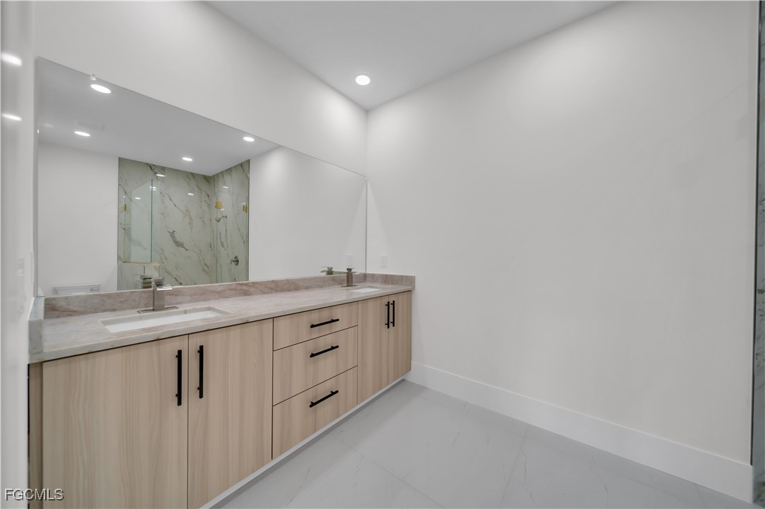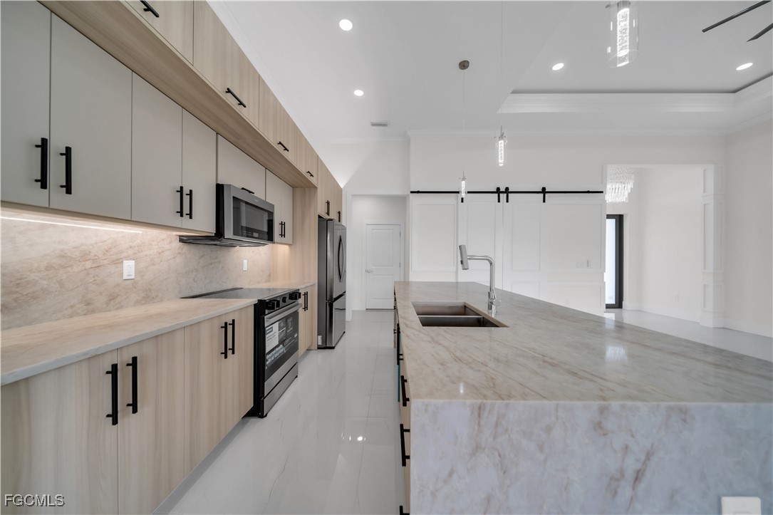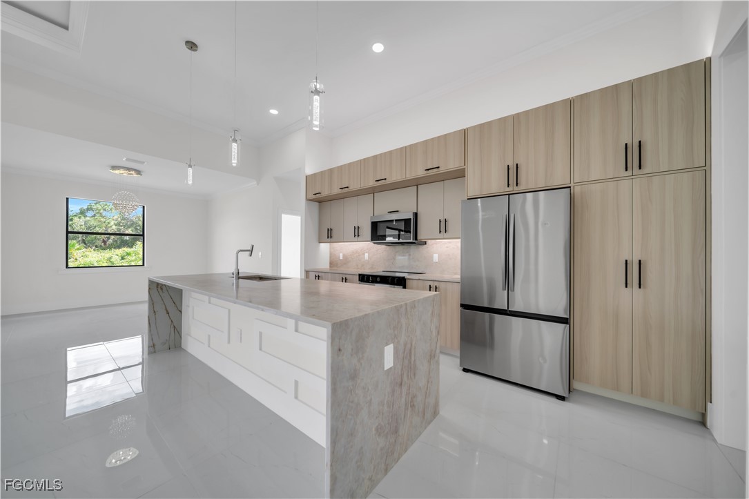 This brand-new construction features 3 bedrooms plus a Den and 3 full bathrooms, offering 1,868 sq ft of living space and 2,637 sq ft total, designed with a modern open-concept layout. The home showcases a stunning kitchen with a quartz waterfall island, custom cabinetry, stainless steel appliances, and elegant pendant lighting, perfect for both everyday living and entertaining. Large-format porcelain tile floors, high ceilings, and impact-resistant windows and doors provide comfort, safety, and contemporary style. A spacious lanai with a fully equipped outdoor kitchen completes the property, creating the ideal space to relax or host gatherings. Don’t miss this incredible opportunity—schedule your showing today.