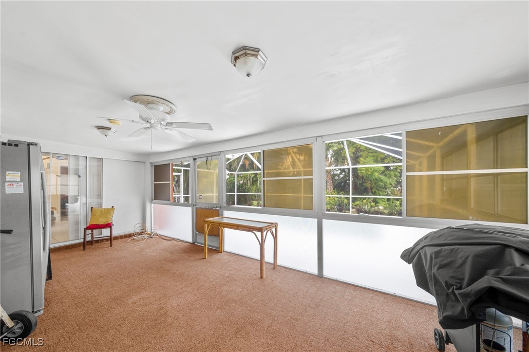 Pool home in a prime Southeast Cape location. This 3-bedroom, 2-bath home has a 2-car garage and just over 1,400 sq. ft. of living space. A new roof and gutters were installed in 2024, and has been replumbed with PVC. The kitchen features newer appliances. Crown molding in the main living areas add a polished touch throughout the home. A spacious covered lanai leads to the screened-in pool area surrounded by tropical landscaping for maximum privacy. The fenced yard includes an irrigation system. Conveniently located near Del Prado and the Midpoint Bridge, you’re close to shopping, dining, and quick access into Fort Myers.