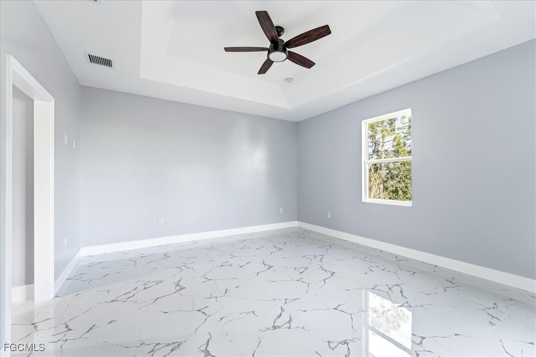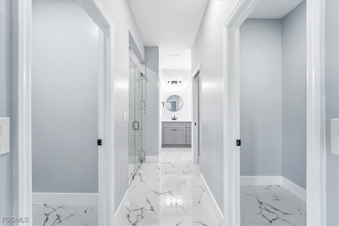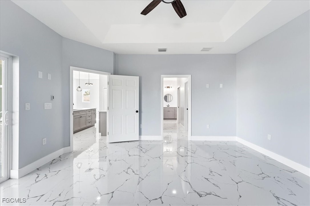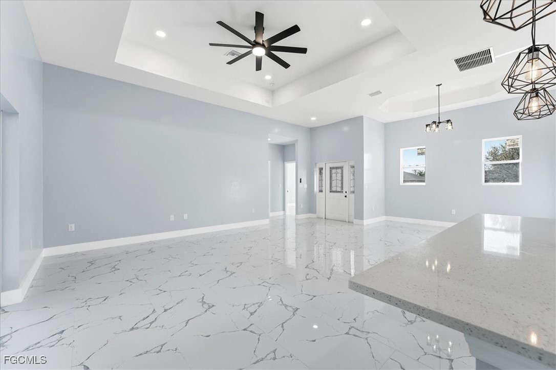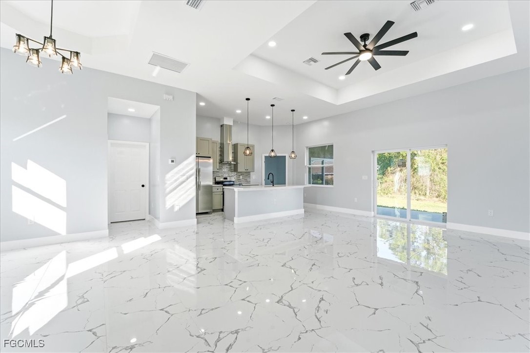 Immaculate new construction showcasing a bright, open floor plan with upscale modern finishes throughout, plus the added security of a stemwall foundation. This home features glossy marble-style tile flooring, a soft neutral color palette, and tray ceilings with contemporary ceiling fans. The designer kitchen offers a large center island, quartz-style countertops, stainless steel appliances, custom cabinetry, and statement pendant lighting—ideal for everyday living and entertaining. Spacious bedrooms provide a clean, airy feel, while the spa-inspired bathrooms include glass-enclosed showers, elegant tile work, matte black fixtures, and double-sink vanities. Oversized sliding glass doors extend the living space to a covered lanai, creating seamless indoor-outdoor flow. Thoughtfully designed with quality craftsmanship and move-in-ready appeal.