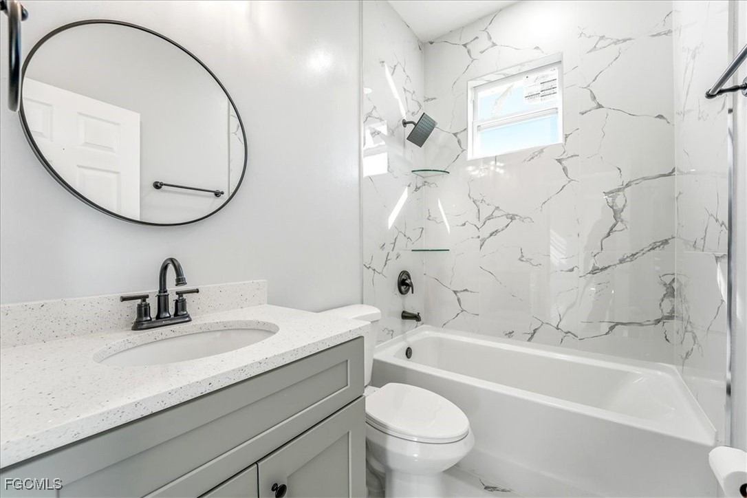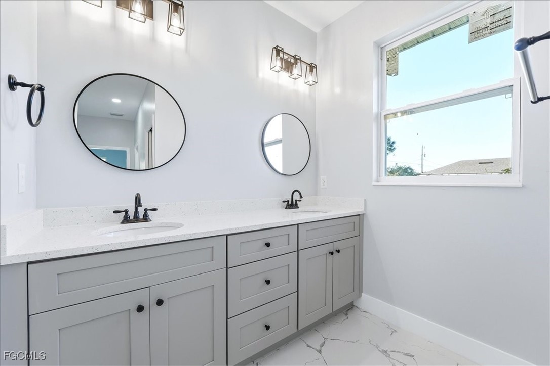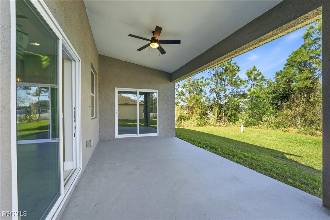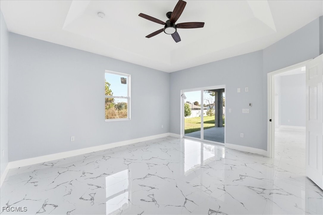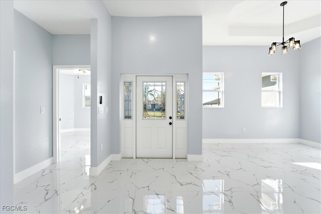 Immaculate new construction showcasing a bright, open floor plan with upscale modern finishes throughout, plus the added security of a stemwall foundation. This home features glossy marble-style tile flooring, a soft neutral color palette, and tray ceilings with contemporary ceiling fans. The designer kitchen offers a large center island, quartz-style countertops, stainless steel appliances, custom cabinetry, and statement pendant lighting—ideal for everyday living and entertaining. Spacious bedrooms provide a clean, airy feel, while the spa-inspired bathrooms include glass-enclosed showers, elegant tile work, matte black fixtures, and double-sink vanities. Oversized sliding glass doors extend the living space to a covered lanai, creating seamless indoor-outdoor flow. Thoughtfully designed with quality craftsmanship and move-in-ready appeal.