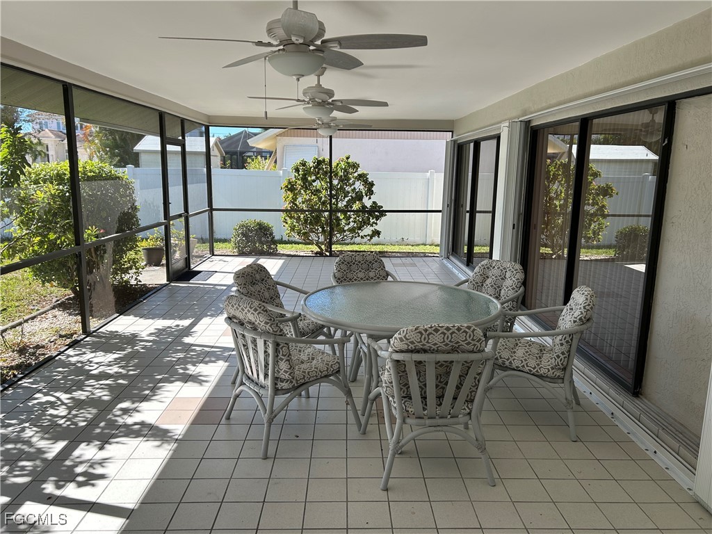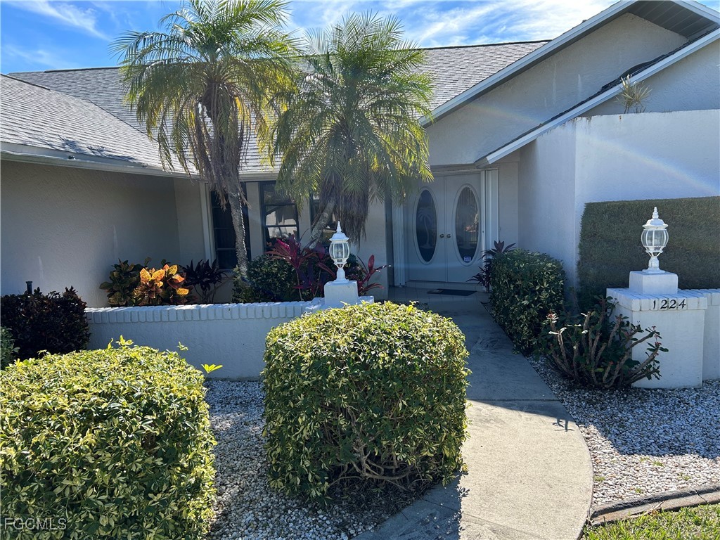 Well-Maintained SW Cape Home move-in ready. Fully furnished and turn-key with everything included to move right in. Roof replaced October 2022. AC replaced March 2022. New Water Heater. 3 bedroom/2 bath. On a quiet street in the Rose Garden neighborhood, close to Tarpon Point and Rotary Park! Formal living and dining room, great room area with vaulted ceilings, open to the kitchen and breakfast room area. Primary bedroom en-suite bath with large walk in closet and overlooking your own private garden. Separate soaking tub and walk-in shower. South facing screened lanai and fenced-in yard, large enough for a pool. All New accordion storm shutters installed and no storm damage here.