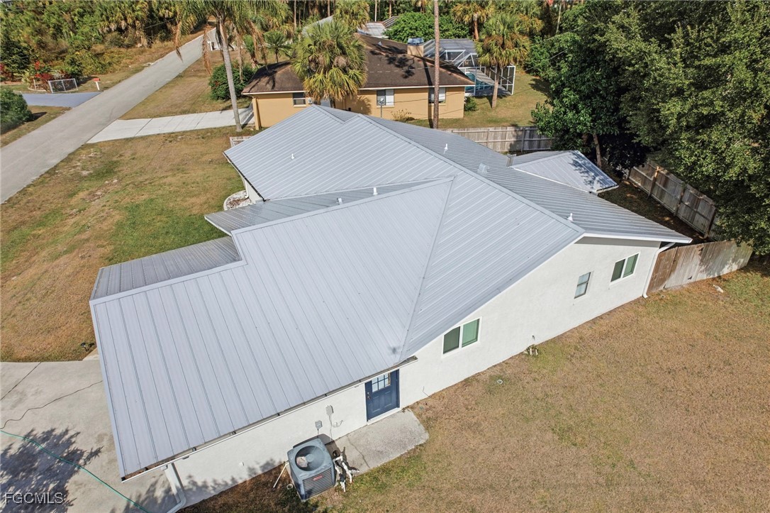 Recently remodeled from top to bottom! This updated single-family home is tucked away in a quiet, cozy pocket of Lehigh Acres and sits on an oversized corner lot. Inside, you’ll find new luxury vinyl plank flooring, tiled bathroom floors and showers and granite countertops in every space! Outside upgrades include a metal roof and gutters installed in 2023 - an uncommon and sought-after feature, new fencing added in 2023, and an A/C system just 5 years old. Enjoy the charm and benefits of mature apricot, mango, avocado and ackee fruit trees, providing fresh fruit from your own yard! The garage offers a versatile 4th room with central air, ideal for a home office or hobby room.