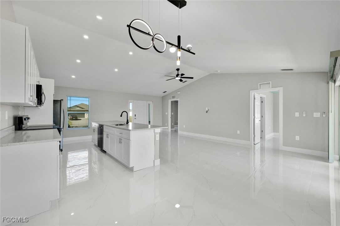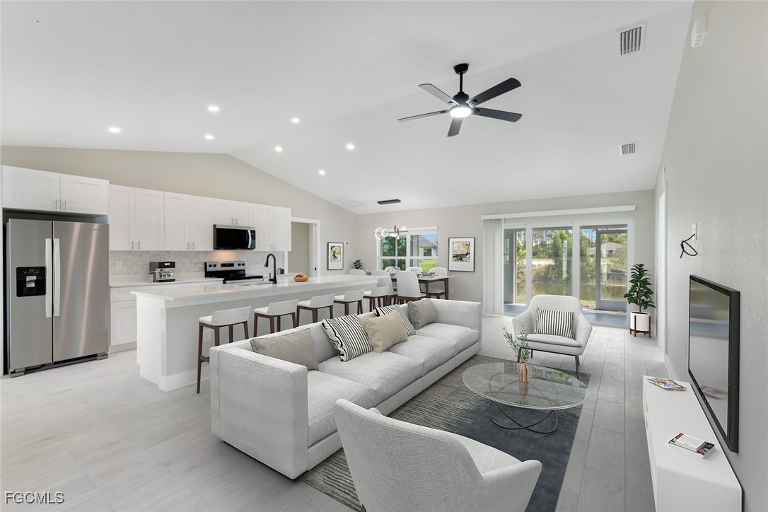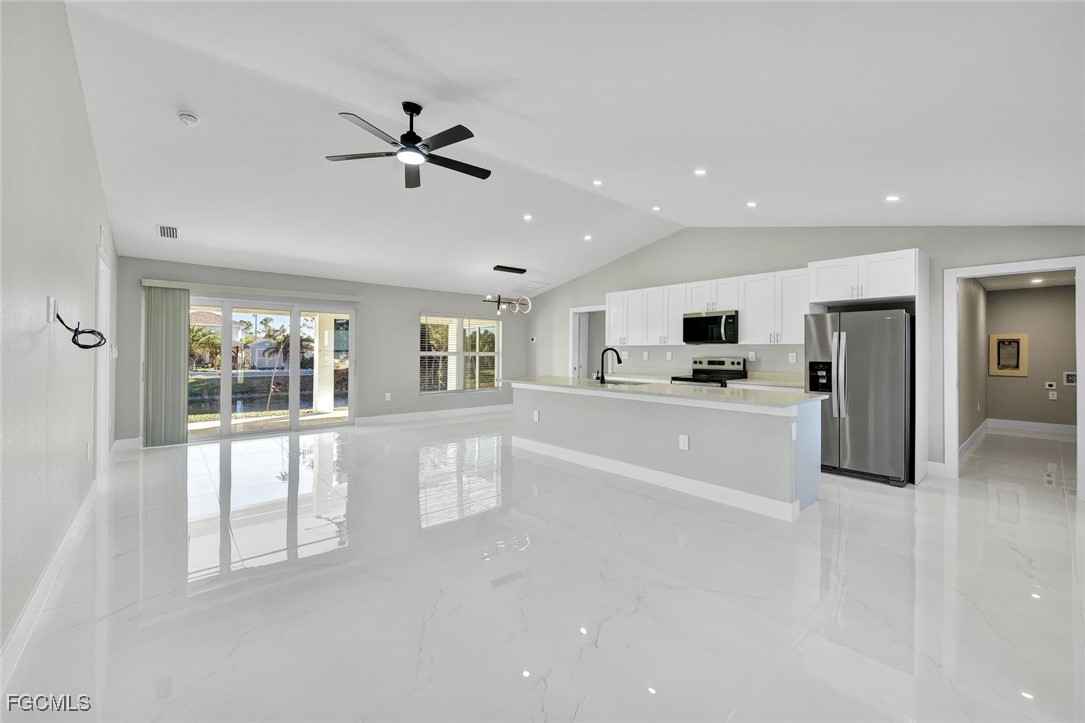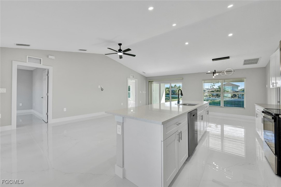 Nueva y hermosa casa de 4 habitaciones y 3 baños FRENTE AL AGUA, construida en bloques de hormigón, en la codiciada zona noreste de Cape Coral, en Gator Circle que tiene un parque communidad con senderos para caminar, parque infantil, baloncesto, tenis y pickleball. El vendedor está dispuesto a contribuir a los gastos de cierre del comprador. Vea el recorrido virtual. ¡NO SE ENCUENTRA EN ZONA INUNDABLE! Este popular modelo Verona incluye VENTANAS Y PUERTAS RESISENTES A HURACANES (no se necesitan contraventanas), una amplia y luminosa sala de estar de concepto abierto con pisos de baldosas, techos altos y puertas corredizas de 3 paneles que permiten la entrada de abundante luz natural y ofrecen vistas al agua. La luminosa cocina de chef cuenta con una enorme isla, gabinetes modernos con cierre suave, encimeras de cuarzo y un acogedor rincón para desayunar. La espaciosa habitación principal tiene un luminoso baño privado con encimeras de cuarzo, lavabos dobles, una ducha de azulejos con puerta de vidrio, y vestidor walk-in. Una segunda habitación principal opcional cuenta con un baño moderno y luminoso y acceso directo a la espaciosa terraza. Dos dormitorios adicionales y un tercer baño ofrecen mucho espacio para niños, invitados, una sala de estar, un espacio flexible o una oficina en casa. Ubicada junto a un canal navegable, disfrute de un día de pesca o simplemente explore los canales en paddleboard o kayak. En un vecindario IDEAL PARA FAMILIAS, con fácil acceso a áreas para ir de compras, comer, divertirse y a poca distancia en auto de las famosas playas de arena blanca de Florida. ¡Programe su visita hoy mismo! ~~~~~~~ Brand new, beautiful WATERFRONT 4 bedroom/3 bath concrete block home in desirable NE Cape Coral, in the Gator Circle neighborhood with a community park with walking trails, playground, and basketball, tennis and pickleball courts. NO FLOOD ZONE! This popular Verona model features HURRICANE-RATED windows and doors (no shutters needed), a large and bright open-concept living space with tile floors throughout, soaring cathedral ceiling and 3-panel sliding doors for natural light and VIEWS TO THE WATER. The bright chef's kitchen features a huge island, modern cabinetry, Quartz countertops, stainless steel appliances, and relaxing breakfast nook. The large owner's bedroom has a bright ensuite bath with Quartz counter tops, dual sinks, a tiled step-in shower with glass enclosure, and walk-in closet. An optional SECOND OWNER'S SUITE has a bright, modern bathroom and direct access to the spacious lanai. Two more bedrooms and a third bathroom provide lots of room for kids, guests, a den, a flex space or a home office. Situated on a navigable canal, enjoy a day of fishing or simply exploring the waterways via paddleboard or kayak. In a family-friendly neighborhood with convenient access to areas for shopping, dining, entertainment, and Florida's famous white-sand beaches. Schedule your showing today!