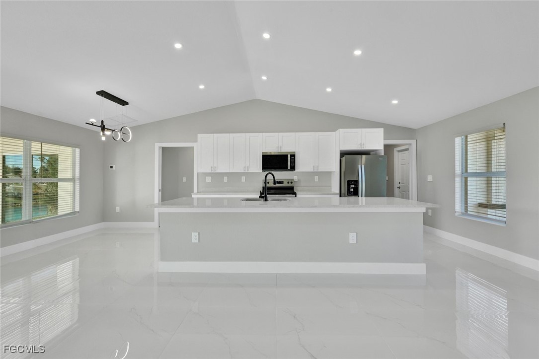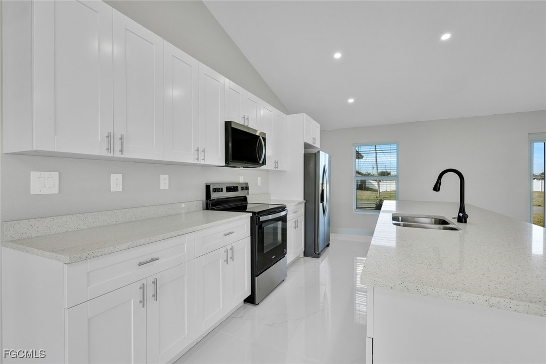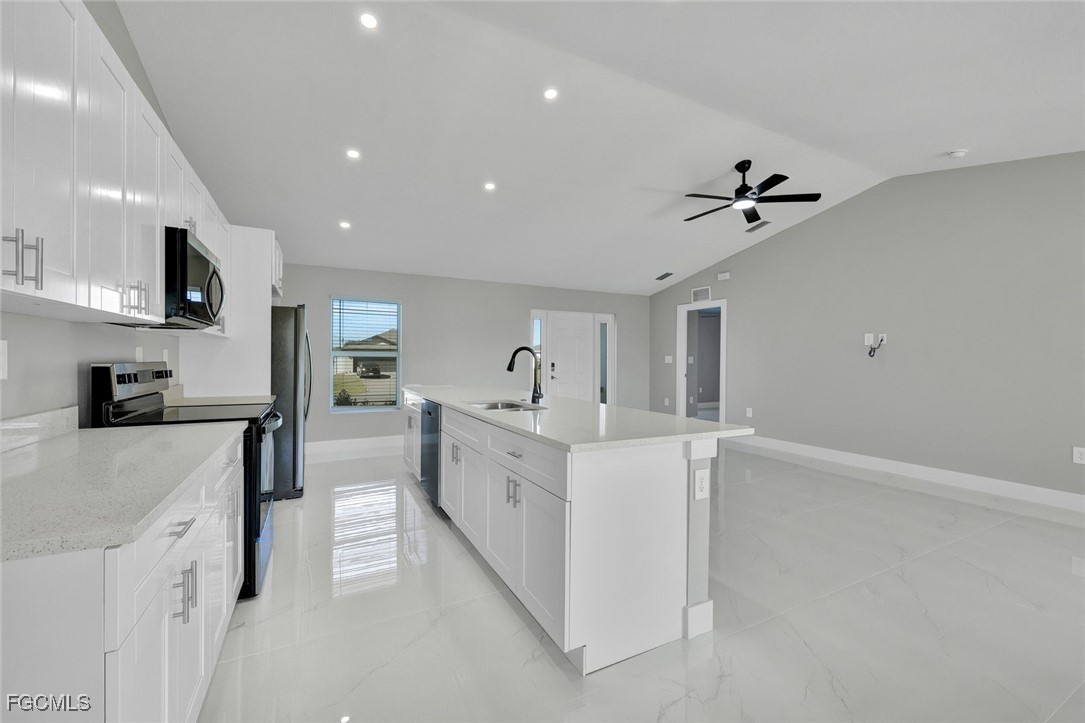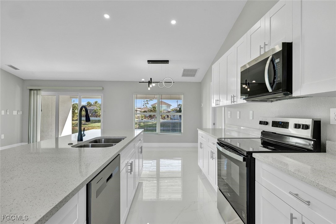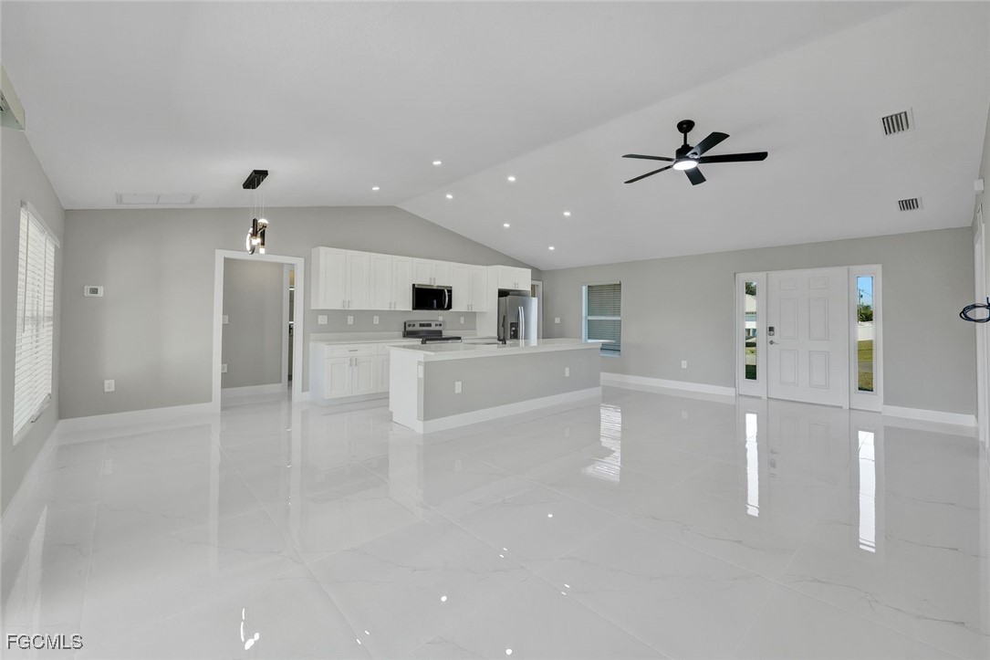 Nueva y hermosa casa de 4 habitaciones y 3 baños FRENTE AL AGUA, construida en bloques de hormigón, en la codiciada zona noreste de Cape Coral, en Gator Circle que tiene un parque communidad con senderos para caminar, parque infantil, baloncesto, tenis y pickleball. El vendedor está dispuesto a contribuir a los gastos de cierre del comprador. Vea el recorrido virtual. ¡NO SE ENCUENTRA EN ZONA INUNDABLE! Este popular modelo Verona incluye VENTANAS Y PUERTAS RESISENTES A HURACANES (no se necesitan contraventanas), una amplia y luminosa sala de estar de concepto abierto con pisos de baldosas, techos altos y puertas corredizas de 3 paneles que permiten la entrada de abundante luz natural y ofrecen vistas al agua. La luminosa cocina de chef cuenta con una enorme isla, gabinetes modernos con cierre suave, encimeras de cuarzo y un acogedor rincón para desayunar. La espaciosa habitación principal tiene un luminoso baño privado con encimeras de cuarzo, lavabos dobles, una ducha de azulejos con puerta de vidrio, y vestidor walk-in. Una segunda habitación principal opcional cuenta con un baño moderno y luminoso y acceso directo a la espaciosa terraza. Dos dormitorios adicionales y un tercer baño ofrecen mucho espacio para niños, invitados, una sala de estar, un espacio flexible o una oficina en casa. Ubicada junto a un canal navegable, disfrute de un día de pesca o simplemente explore los canales en paddleboard o kayak. En un vecindario IDEAL PARA FAMILIAS, con fácil acceso a áreas para ir de compras, comer, divertirse y a poca distancia en auto de las famosas playas de arena blanca de Florida. ¡Programe su visita hoy mismo! ~~~~~~~ Brand new, beautiful WATERFRONT 4 bedroom/3 bath concrete block home in desirable NE Cape Coral, in the Gator Circle neighborhood with a community park with walking trails, playground, and basketball, tennis and pickleball courts. NO FLOOD ZONE! This popular Verona model features HURRICANE-RATED windows and doors (no shutters needed), a large and bright open-concept living space with tile floors throughout, soaring cathedral ceiling and 3-panel sliding doors for natural light and VIEWS TO THE WATER. The bright chef's kitchen features a huge island, modern cabinetry, Quartz countertops, stainless steel appliances, and relaxing breakfast nook. The large owner's bedroom has a bright ensuite bath with Quartz counter tops, dual sinks, a tiled step-in shower with glass enclosure, and walk-in closet. An optional SECOND OWNER'S SUITE has a bright, modern bathroom and direct access to the spacious lanai. Two more bedrooms and a third bathroom provide lots of room for kids, guests, a den, a flex space or a home office. Situated on a navigable canal, enjoy a day of fishing or simply exploring the waterways via paddleboard or kayak. In a family-friendly neighborhood with convenient access to areas for shopping, dining, entertainment, and Florida's famous white-sand beaches. Schedule your showing today!