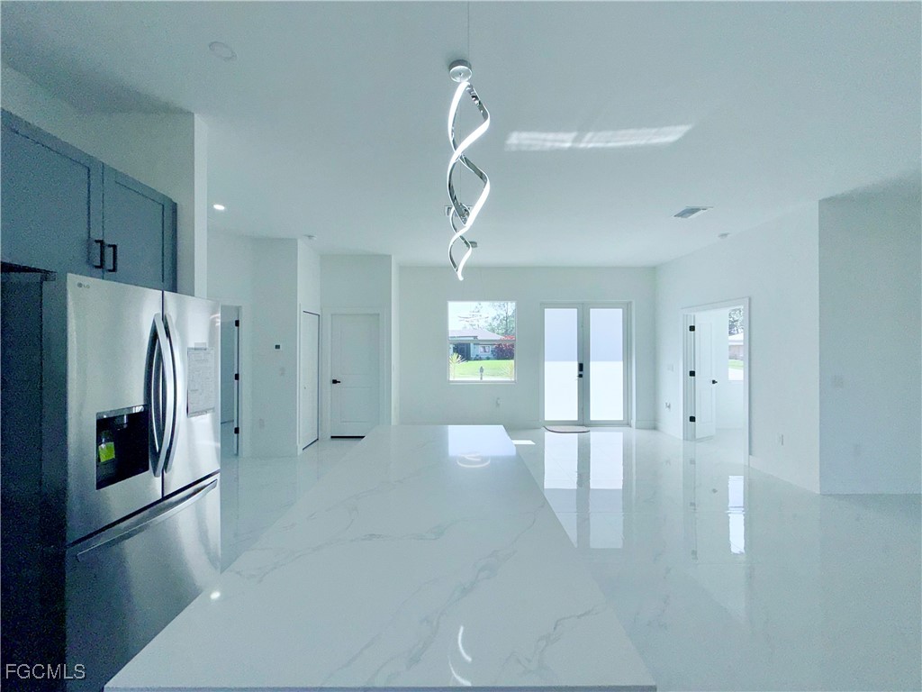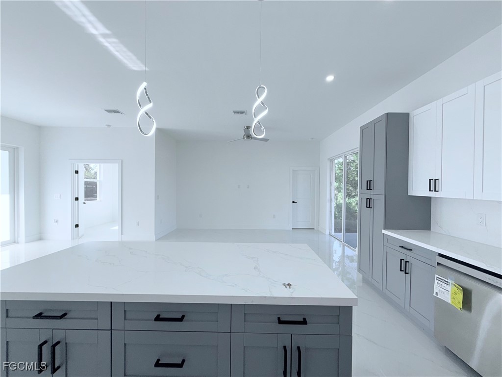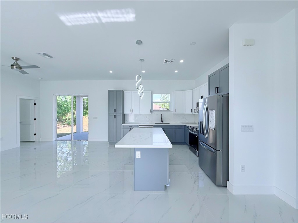 Move in ready and thoughtfully designed, this 3-bedroom and Den, 2-bath, home offers the layout today's buyers are actively searching for. The layout is open, functional, and inviting. The kitchen is a true focal point, featuring quartz countertops, wood cabinetry in two beautiful tones, and a pantry, creating a warm yet modern space ideal for daily living and entertaining. The primary suit offers privacy and comfort with dual sinks, a walk-in closet, and additional linen/storage space in the master bath. Enjoy outdoor Florida living with an open porch/lanai. This amazing property is centrally located in the SW of Lehigh close to shopping, dining, schools, and main roads offering convenience, accessibility, and long term value which is ideal for homeowners and investors alike.