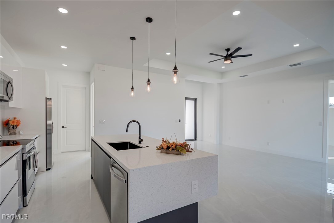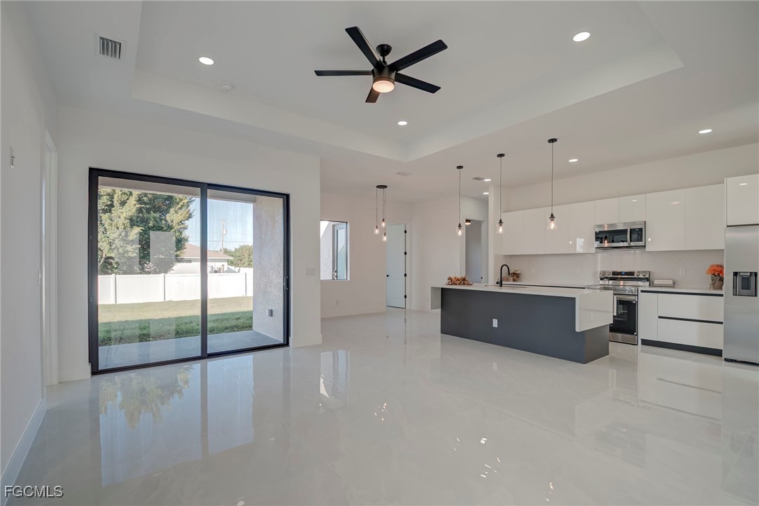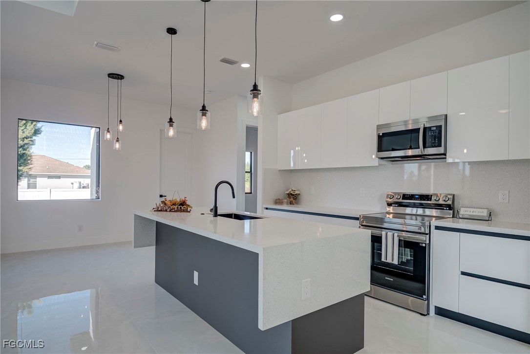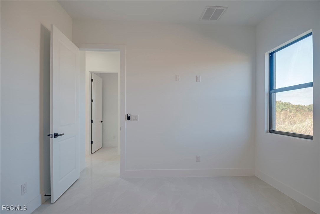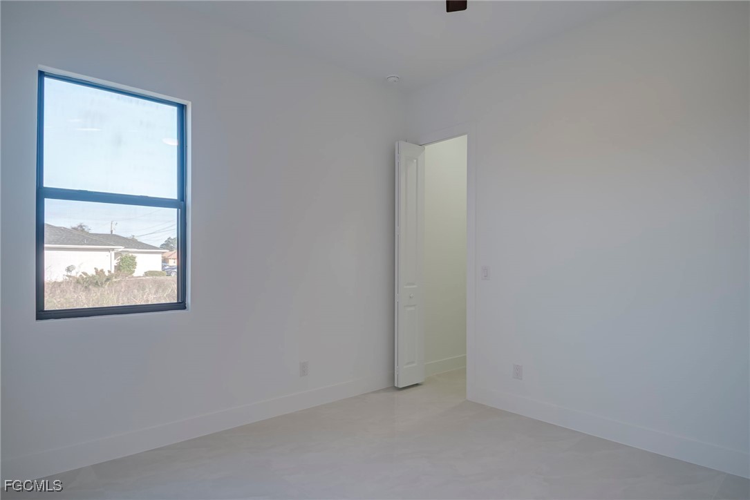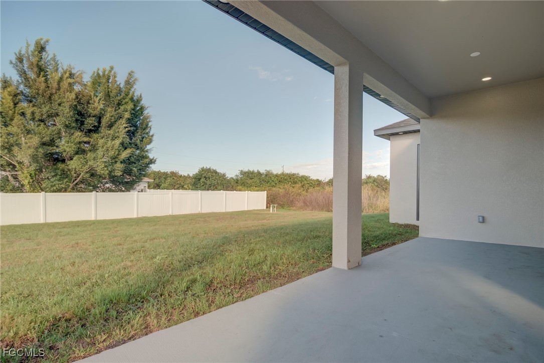 Welcome to this stunning new construction home, 3 bedrooms + a den 2 1/2 bathrooms perfectly positioned on a desirable corner lot in Lehigh Acres, Florida. This contemporary residence features three spacious bedrooms and two and a half bathrooms, including a convenient guest bath with exterior access. The home includes a versatile den that can easily be converted into a fourth bedroom or used as a home office. Enjoy the convenience of an in-house laundry room, adding to the home's functionality. Step inside to find elegant porcelain flooring throughout, complemented by sleek quartz countertops in the kitchen. The modern space is further enhanced by stainless steel appliances and contemporary fixtures and cabinets. The kitchen is a highlight, boasting an impressive island with a waterfall edge, ideal for both cooking and entertaining. Additional features include a beautifully paved driveway and walkway, providing both style and durability. The home is ideally located near shopping and restaurants, offering convenience and accessibility. Don’t miss this opportunity to own a beautifully crafted home in a prime location. Call us today to schedule your private showing and make this exceptional property yours.
