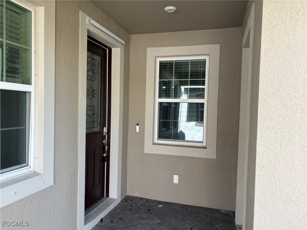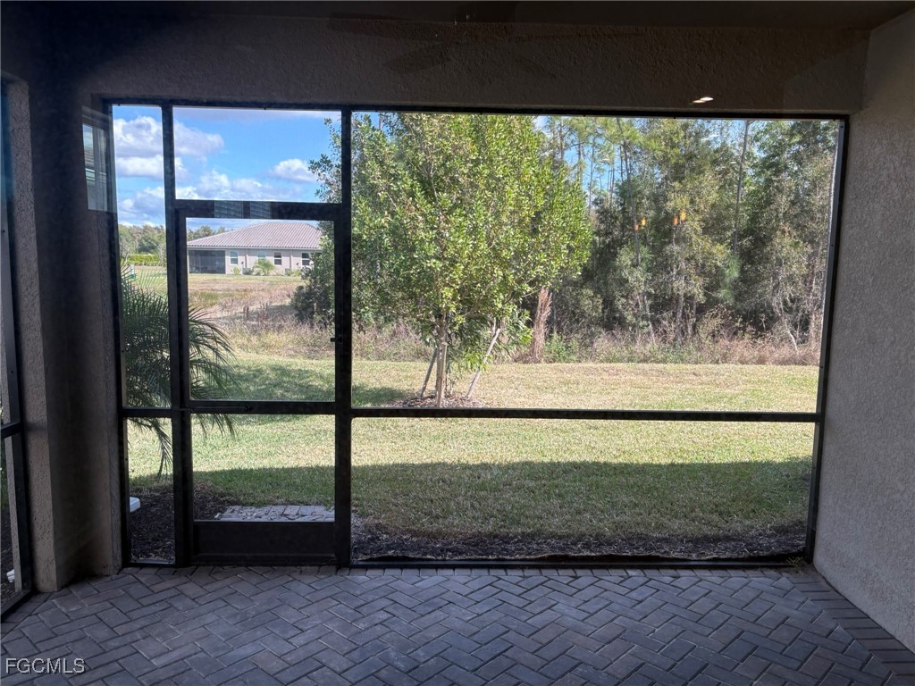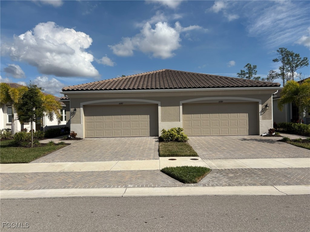 Amazing, bright, attached villa with two car attached garage in new like condition at Bonavie Cove in Fort Myers! Two lovely bedrooms, two full baths plus den with glass French doors. Beautiful kitchen with quartz countertops, pendant lighting, center island with breakfast bar, glass backsplash, and tall white cabinetry open to the welcoming dining area. Gorgeous fixtures and fans throughout plus luxury vinyl plank flooring in main living areas and with carpet in the bedrooms. Bedroom with Tray Ceiling. Ensuite full bath with dual sinks and glass shower. Inside Laundry Closet. Brick paver driveway and side entry pathway. Tile roof. Nice garage with finished floor. Nice screened lanai with landscaped views. Fantastic great room and a split bedroom floorplan! Bonavie Cove is an award-winning gated community that is also pet friendly. This villa is located near the resort style amenities center with a heated pool, a state-of-the art fitness center, a gas firepit, dog park, and a covered cabana. The home has no lender required flood insurance due to its flood zone status. Located in an area of diverse dining establishments, retail shops, and entertainment venues.