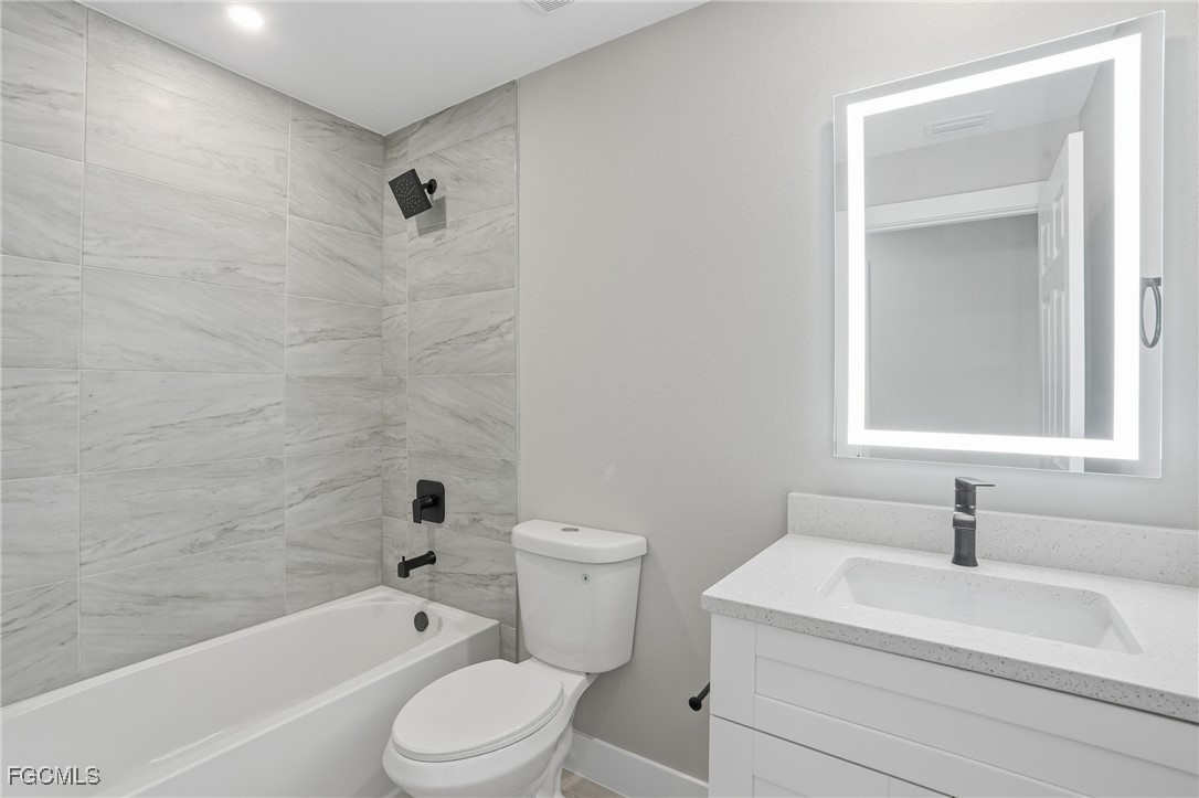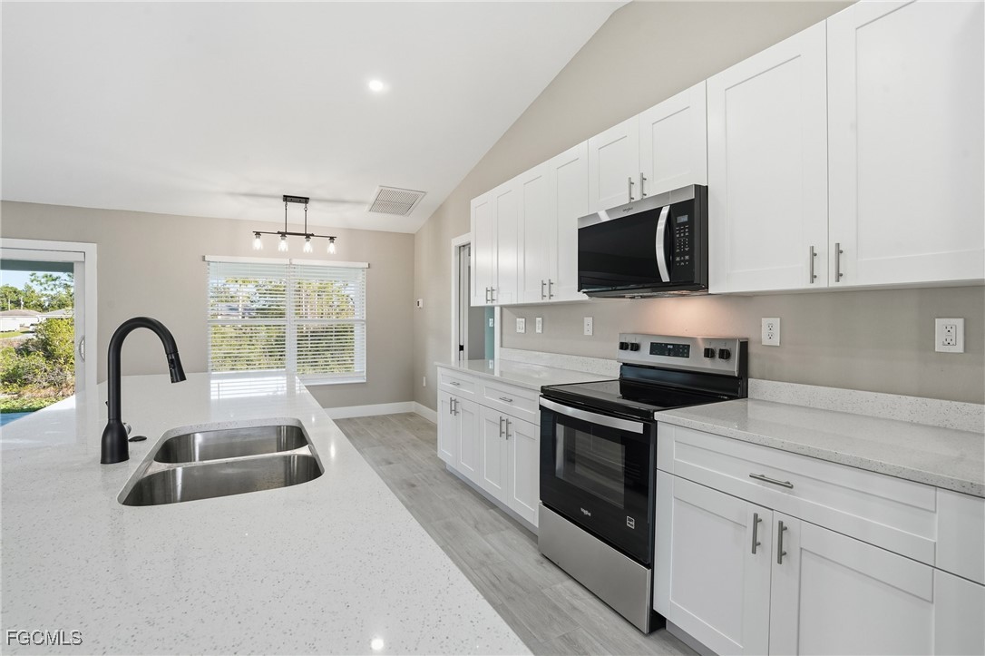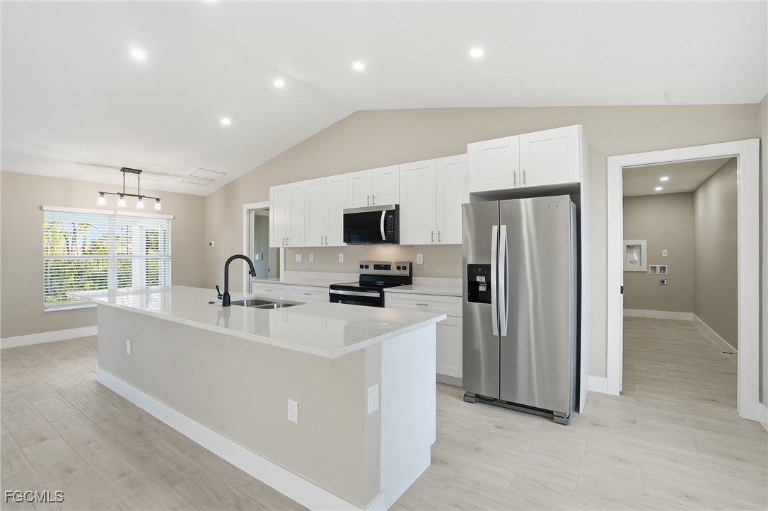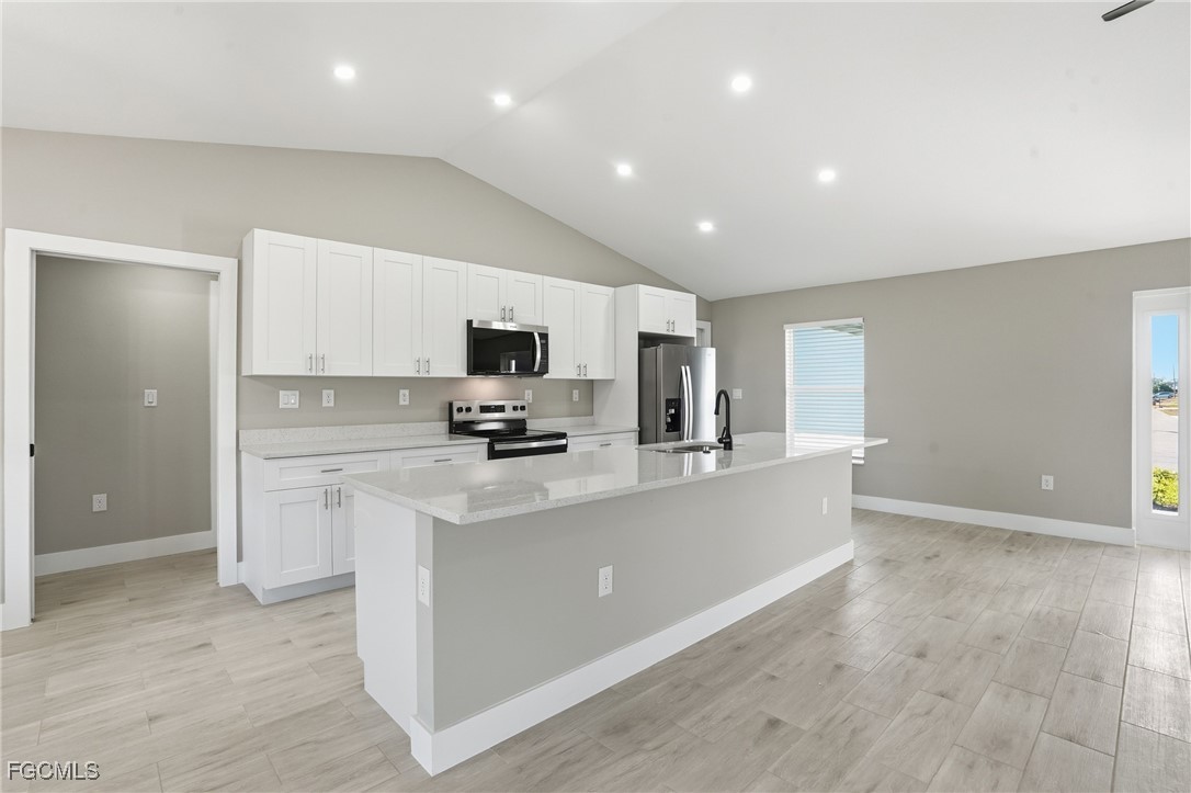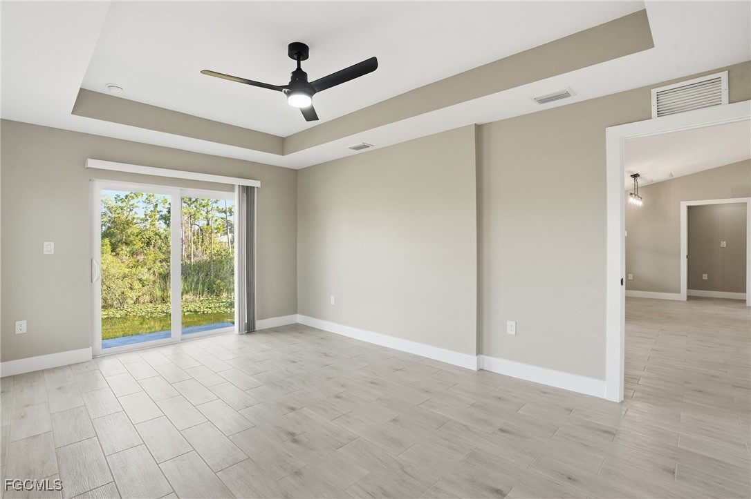 Welcome to this WATERFRONT 4 Bedroom, 3 Bathroom, 2 Car Garage home located on an oversized waterfront lot in Cape Coral, perfectly positioned on a freshwater canal. CLICK ON THE VIRTUAL TOUR LINK 1 FOR THE VIDEO AND VIRTUAL LINK 2 FOR THE 3D TOUR. This 2026 new build features porcelain tile flooring throughout and an open floor plan with high vaulted ceilings, creating a bright and airy atmosphere. The kitchen is a chef’s dream, with elegant stone countertops, stainless steel appliances, and a center island with a breakfast bar. It flows seamlessly into the open living and dining areas. The living room features a glass slider that overlooks the canal, offering breathtaking water views, while the dining area is highlighted by a large window, perfect for waterfront dining. The spacious master bedroom is highlighted by a glass slider where you can enjoy peaceful mornings watching wildlife along the canal from your bedroom. It includes a large walk-in closet and an en-suite bathroom with a dual sink vanity, a walk-in shower, and a linen closet. One additional guest bedroom is located on the same side of the home as the primary suite, while a second primary and 4th guest bedroom are on a split floor plan. The second primary suite has a glass slider leading to the lanai and an en-suite bathroom with a single-sink vanity and walk-in shower. Both guest bedrooms include built-in closets and share a conveniently located guest bathroom. The covered back lanai is perfect for sipping your morning coffee or unwinding with an evening beverage while enjoying the serene water views. The spacious backyard provides plenty of room to create your own outdoor oasis. Centrally located for easy access to parks, schools, shopping, and dining. Residents enjoy nearby recreational spots like Four Mile Cove Ecological Preserve & Sun Splash Water Park, plus easy access to boating and outdoor activities along the Caloosahatchee River, with a short drive to local award-winning beaches. Schedule your showing TODAY!