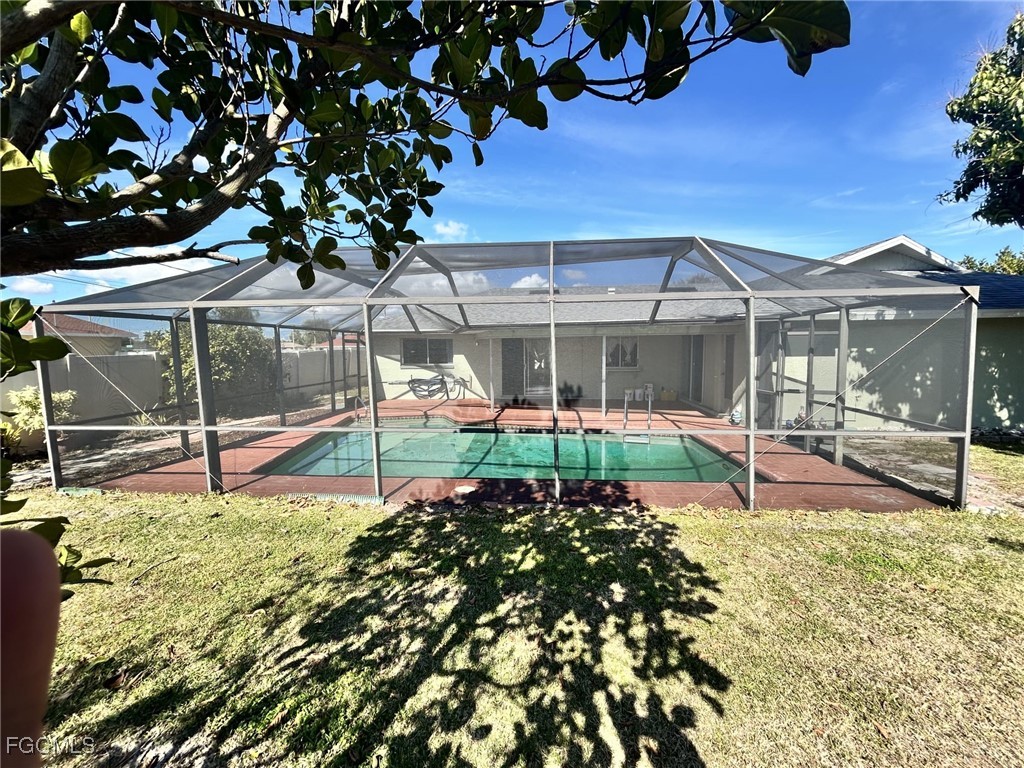 AMAZING/BEAUTIFUL POOL HOME IN CAPE CORAL FLORIDA !! 3 bedroom, 2 bathroom home. This home offers approximately 1,600 sq ft of living space with a split bedroom floor plan, and attached 2-car garage. The property sits on an 0.23 acre lot with a fenced backyard with producing fruit trees.. Interior features include a living room, kitchen, dining area, family/ flex room, no carpet throughout the home. Master suite have a powder area, master Bath, plus a walk in closet. The living/flex room, dinning room area plus 1 bathroom have entrances to the pool area. 2022 ROOF, 2022 WATER HEATER. Don't miss this opportunity schedule your tour today!
