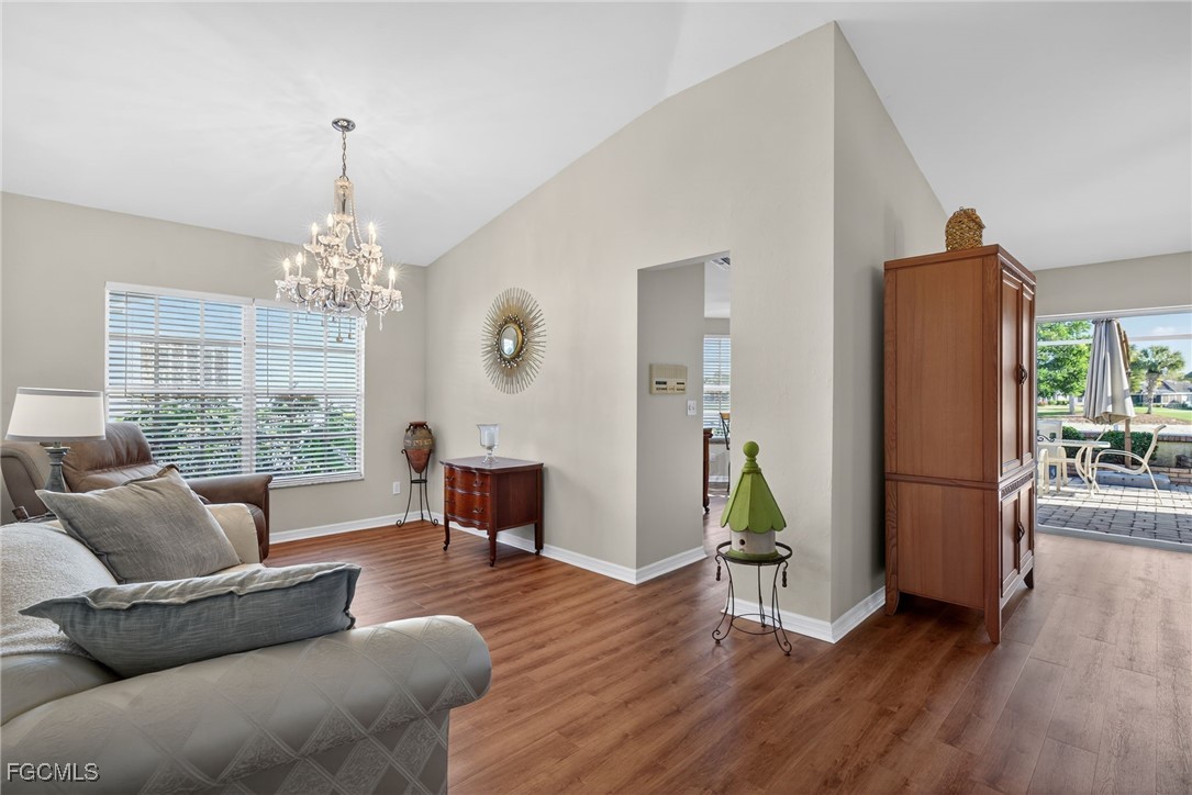 Enjoy beautiful southern exposure with expansive lake and golf course views from this cozy 2 bedroom, 2 bath home offering just over 1,900 sq ft of living space. The desirable split floor plan features cathedral ceilings, laminate wood flooring, and an oversized primary bath with a walk-in shower, garden tub, and walk in closet. Serene water views are enjoyed from the primary bedroom, kitchen, and dining areas. Outdoor living is enhanced by a spacious screened lanai, accessible from the primary bedroom and living room, ideal for embracing the Florida lifestyle. Sold furnished, this home also features a 2020 roof.