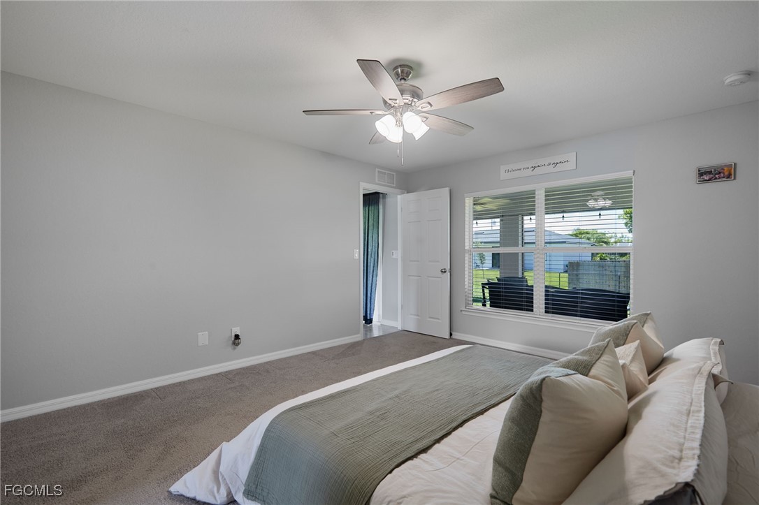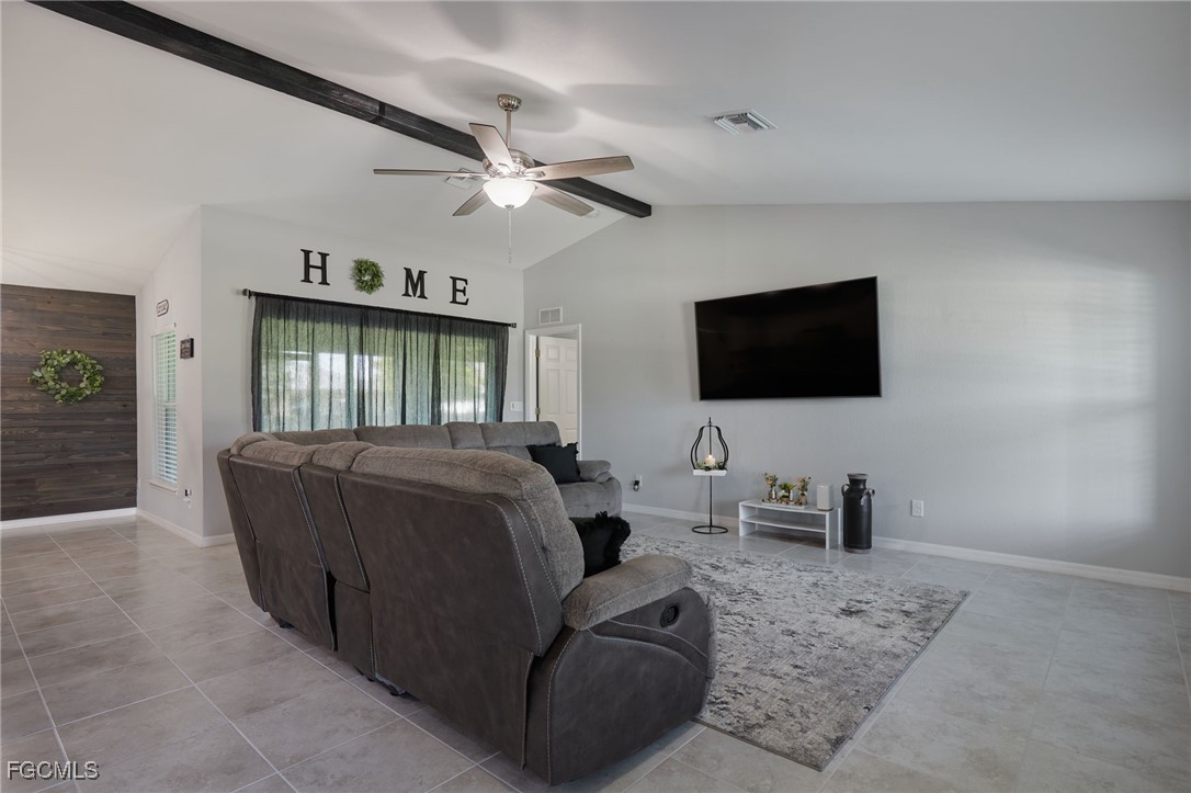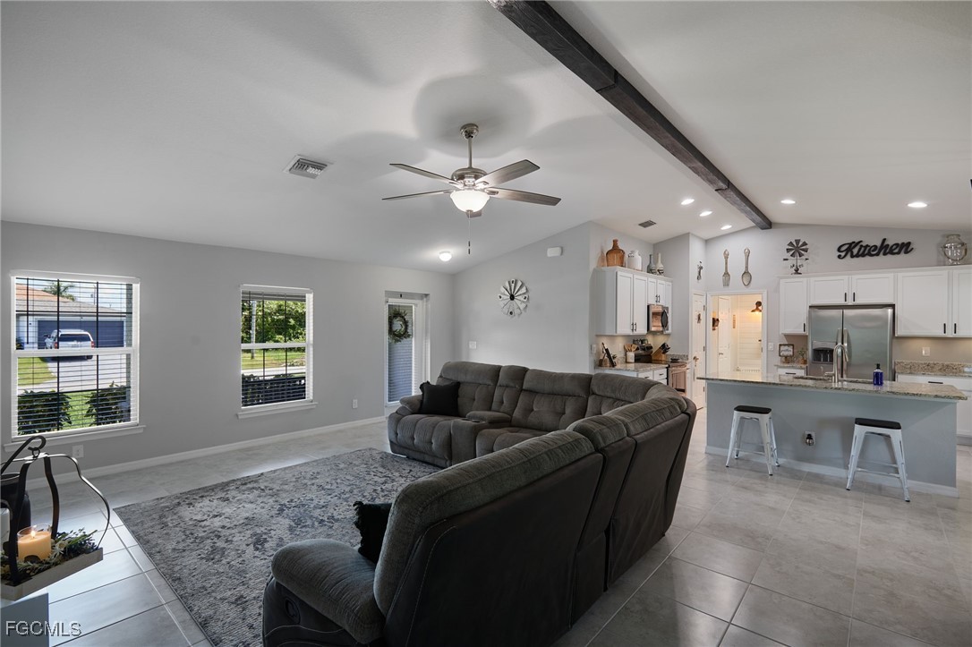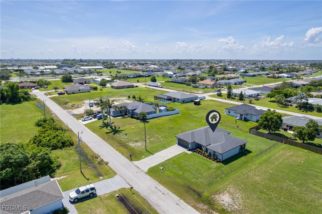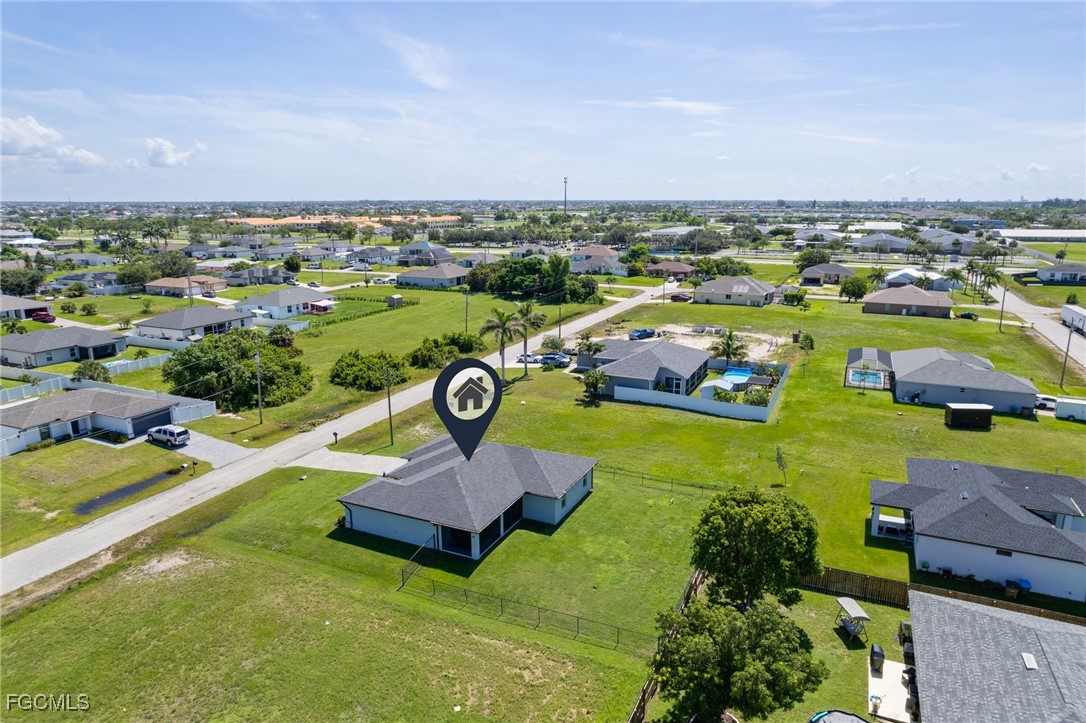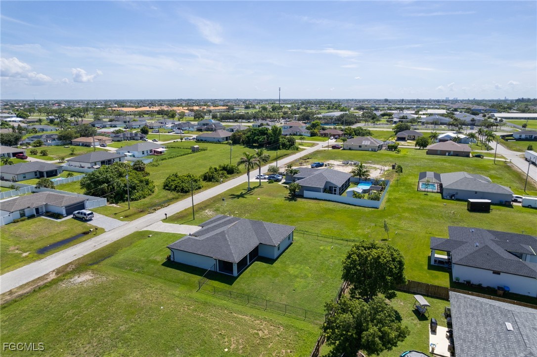 WELCOME HOME!!!!This beautifully maintained Christopher Alan Home offers the perfect blend of comfort, style, and functionality in one of Cape Coral’s most desirable NW neighborhoods. Built in 2019, this home comes with the valuable benefit of a 4-year structural warranty, providing peace of mind and long-term confidence in your investment. Step inside to an inviting open-concept layout featuring soaring cathedral ceilings with a custom wood plank beam at the center—bringing warmth, charm, and a designer finish to the living space. The center island kitchen flows seamlessly into the spacious living room and dining area, which showcases a shiplap accent wall that adds depth and visual interest. A second shiplap wall in the laundry room adds even more character and thoughtful detail to the home. The master suite is a true retreat with two walk-in closets, dual vanities, and a walk-in shower. Throughout the home, you'll find granite countertops in the kitchen and bathrooms, stainless steel appliances, Moen plumbing fixtures, and 18” x 18” tile flooring in the main living areas. Practical upgrades include a high-quality generator breaker interlock and custom pantry shelving. Step outside to enjoy a fully fenced backyard, perfect for pets, kids, or simply added privacy. Another major benefit is that this home is not located in a flood zone, which means no flood insurance is required—a significant savings and peace of mind for the future. Additional highlights include PGT low-E insulated windows, an irrigation system, an epoxy-coated garage floor, a paver driveway, and beautiful stone accents on the front elevation. Located in a quiet and fast-growing neighborhood close to schools, shopping, and dining, this home is an ideal choice for full-time living or a seasonal getaway. Don’t miss out—schedule your private showing today and come see this stunning NW Cape Coral home before it’s gone!