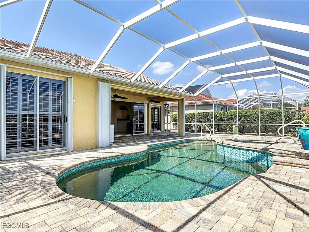 This Osprey home in HERONS GLEN COUNTRY CLUB showcases the spectacular sights and sounds of water with a sparkling LAKE and FOUNTAIN view from your screened lanai with POOL AND SPILLOVER SPA. This outdoor oasis features a large paver pool deck perfect for relaxation and entertaining while enjoying the superb view. Triple sliding doors from the kitchen and quadruple sliders from the great room provide seamless indoor-outdoor living, allowing you to fully appreciate this home's stunning setting. Inside, you'll find an elegant open-concept layout with diagonally laid tile and laminate flooring. The kitchen boasts fresh white cabinetry with crown moldings, STONE countertops, and a glass tile backsplash. Stainless steel appliances include a COOKTOP range and BOSCH dishwasher, and there is both a breakfast bar and eat-in area for you to enjoy your culinary creations. Special touches include PLANTATION SHUTTERS, upgraded fixtures, and a hand-painted dining room mural. Both bathrooms have been beautifully updated with VESSEL SINKS. The master en-suite BATHROOM RENOVATION boasts a luxurious tiled walk-in shower, a dedicated makeup vanity, new floors and CALIFORIA CLOSET-style built-ins in the walk-in closet. The versatile guest bedroom includes a queen Murphy bed with matching built-in desk, and FRENCH DOORS lead to a flexible DEN space. Recent upgrades include a 2025 NEW ROOF and 2025 NEW A/C, accordion HURRICANE SHUTTERS, WHOLE HOUSE GENERATOR, and AQUALINK POOL SYSTEM you control from an app on your phone. Home is being sold FURNISHED, including the Weber grill and GOLF CART. Herons Glen is a premier gated community where residents enjoy an 18-hole championship golf course, renovated clubhouse with large ballroom and dining options and a large ballroom, tennis and pickleball courts, modern fitness center, and more. The community offers a resort-like setting and lots of social activities - all with convenient access to shopping, healthcare, and Florida’s famous Gulf beaches.