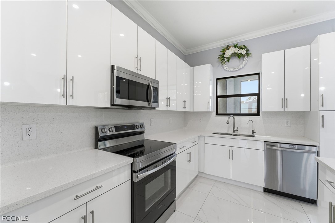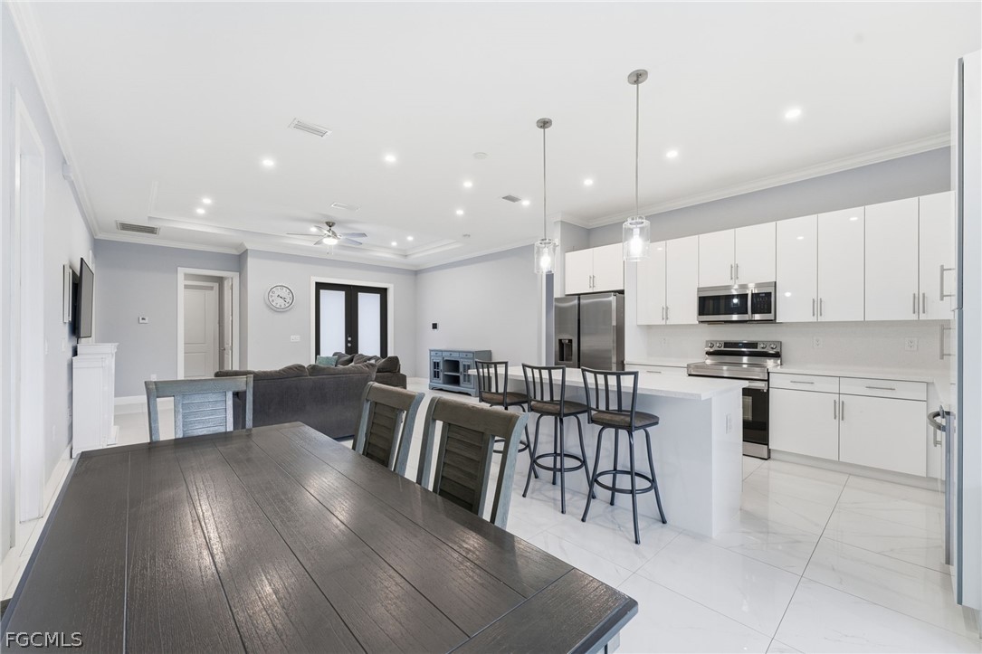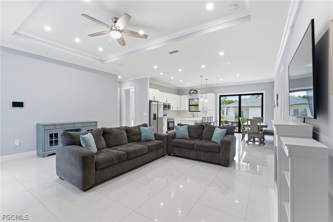 The open-concept floor plan features beautiful tray ceilings, crown molding, and tile flooring throughout, along with abundant natural light that fills the living spaces, creating a bright and sophisticated atmosphere. The layout flows seamlessly into the kitchen, which is appointed with Quartz countertops, stainless steel appliances, a large center island with pendant lighting, and ample cabinetry—ideal for everyday living and entertaining. The home also includes ADA wheelchair-accessible kitchen and bathroom features for enhanced accessibility.