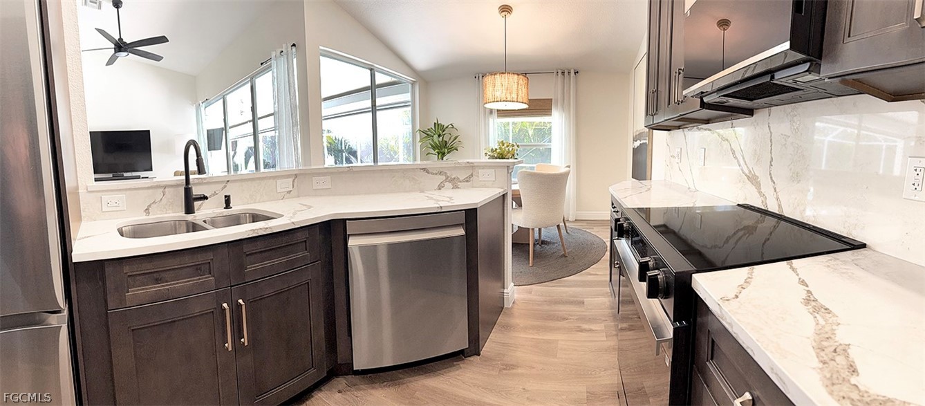 Sunlight fills the open floor plan, where vaulted ceilings and fresh designer finishes create a bright, airy atmosphere. The gourmet kitchen serves as the home’s centerpiece, featuring quartz surfaces, custom soft-close cabinetry, pantry, and new Samsung stainless appliances—ideal for casual mornings at the breakfast bar or effortless entertaining after a day on the water.