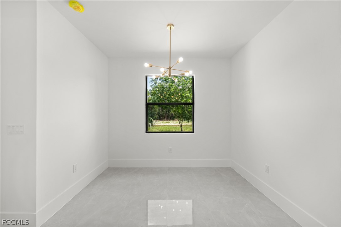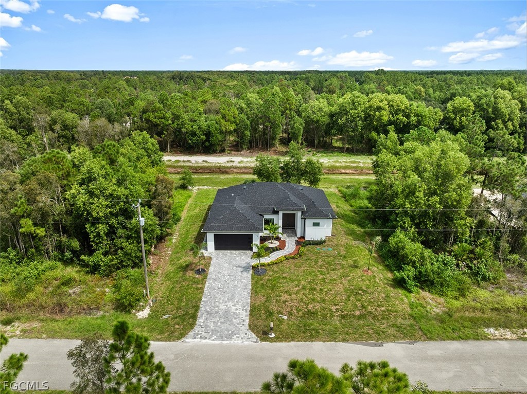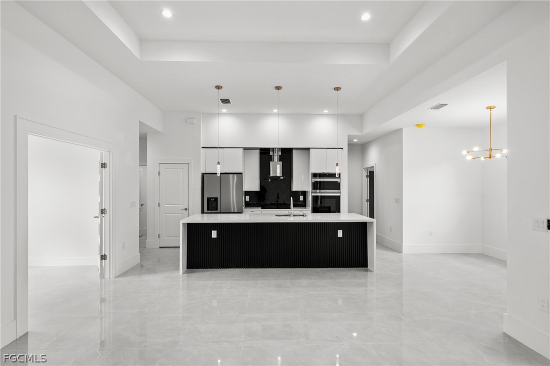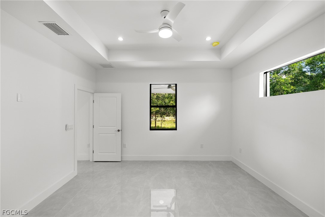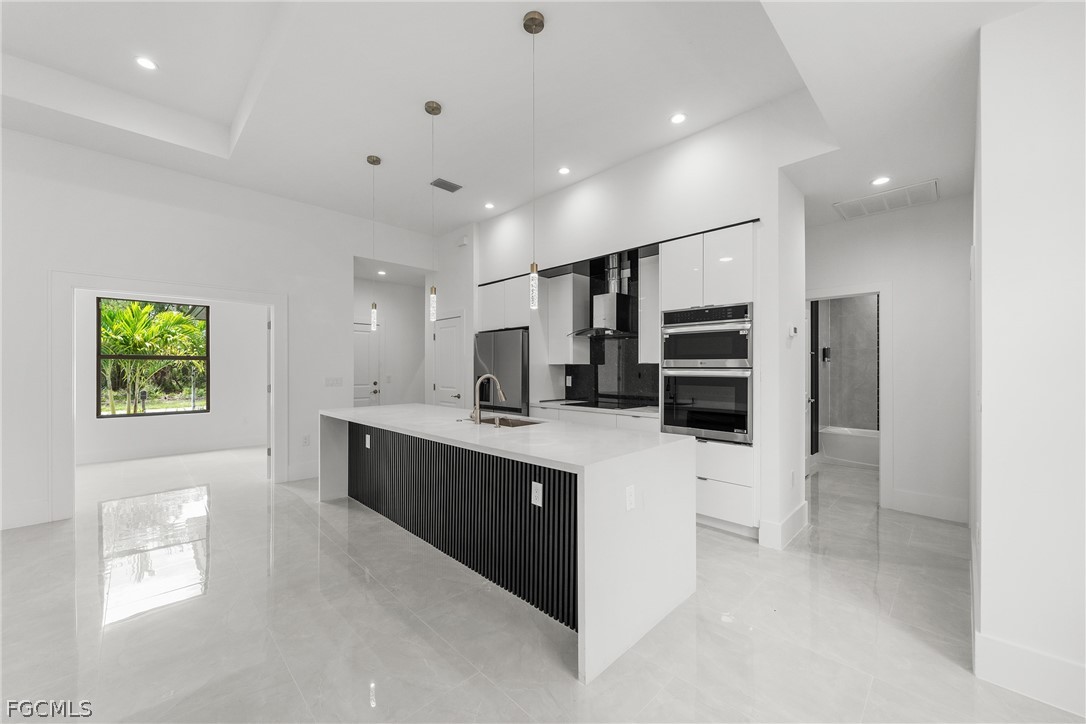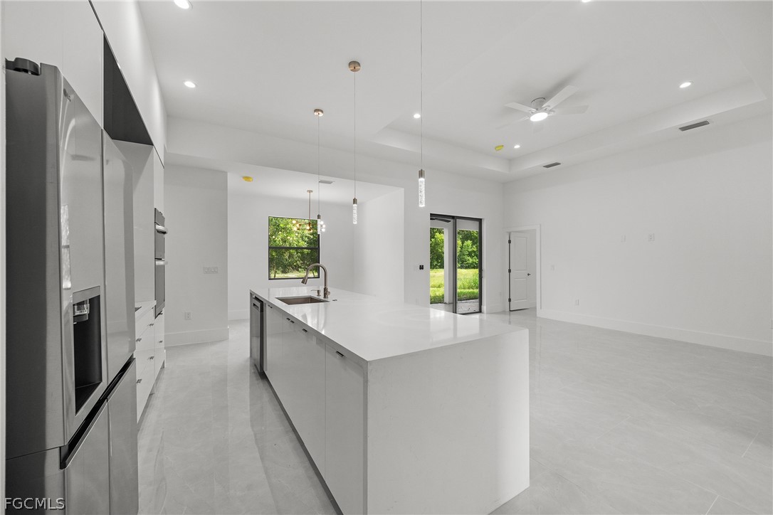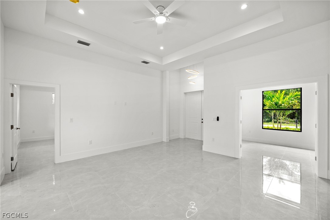 ***New Construction | Semi-Custom | Premium Upgrades Throughout*** NO FLOOD ZONE!!! Newly built semi-custom residence offering 3 bedrooms + den, 2 baths, and a thoughtfully designed open-concept floor plan with 10' ceilings and an 11' tray ceiling in the main living area and primary suite. Large-format 24"x48" porcelain tile runs throughout the home. The kitchen features stainless steel appliances with wall mounted combo oven/microwaves, and over the cooktop hood. Solid wood cabinetry, quartz countertops with accent color full-height backsplash. Primary suite includes dual walk-in closets with dual-sink vanity, freestanding soaking tub, oversized walk-through shower with dual shower heads. Guest bath provides direct lanai access (ideal for future pool bath). Sliding glass doors open to the covered, epoxy finished floor lanai for seamless indoor-outdoor living and enterteinment. Additional features: Impact-resistant windows and doors, Epoxy-coated garage and lanai floors, Paver driveway and entry, Bahia sod with automatic irrigation system. SCREENED-IN LANAI, not shown in pictures. Located in a rapidly Lehigh growing area with convenient access to major roadways, Road 82, Daniels Pkwy, Colonial Blvd, I-75.