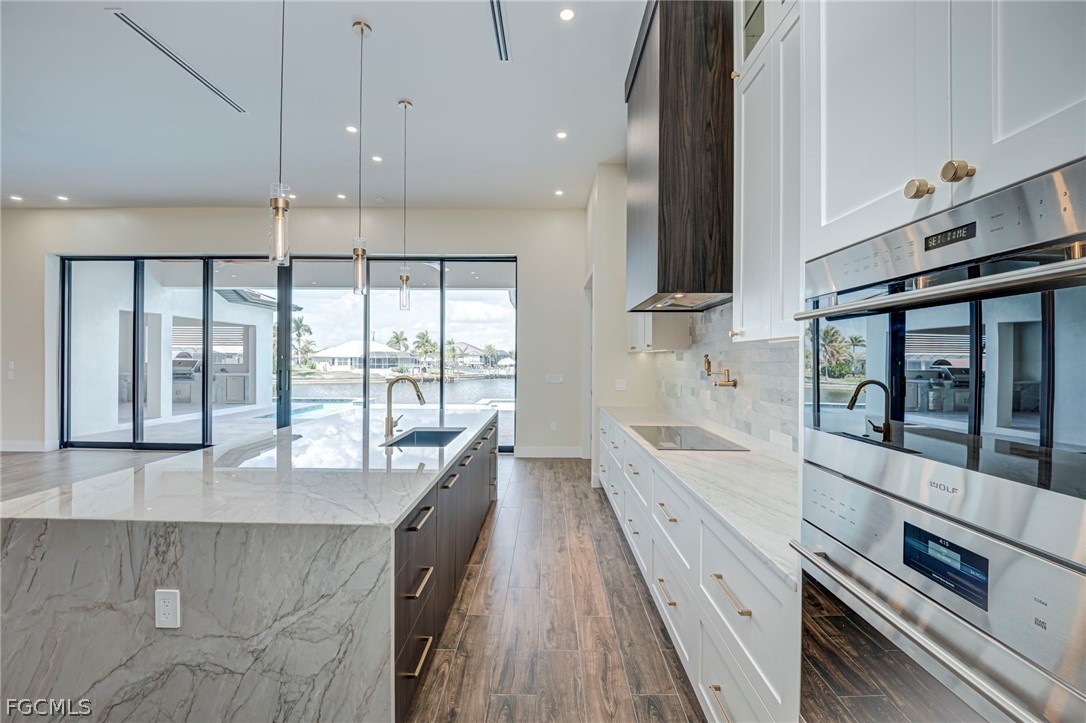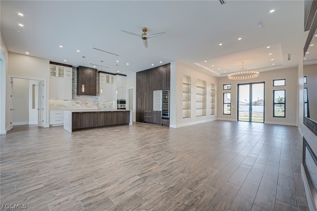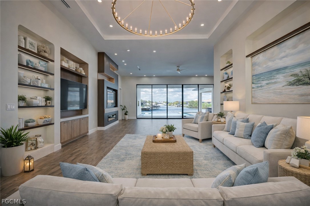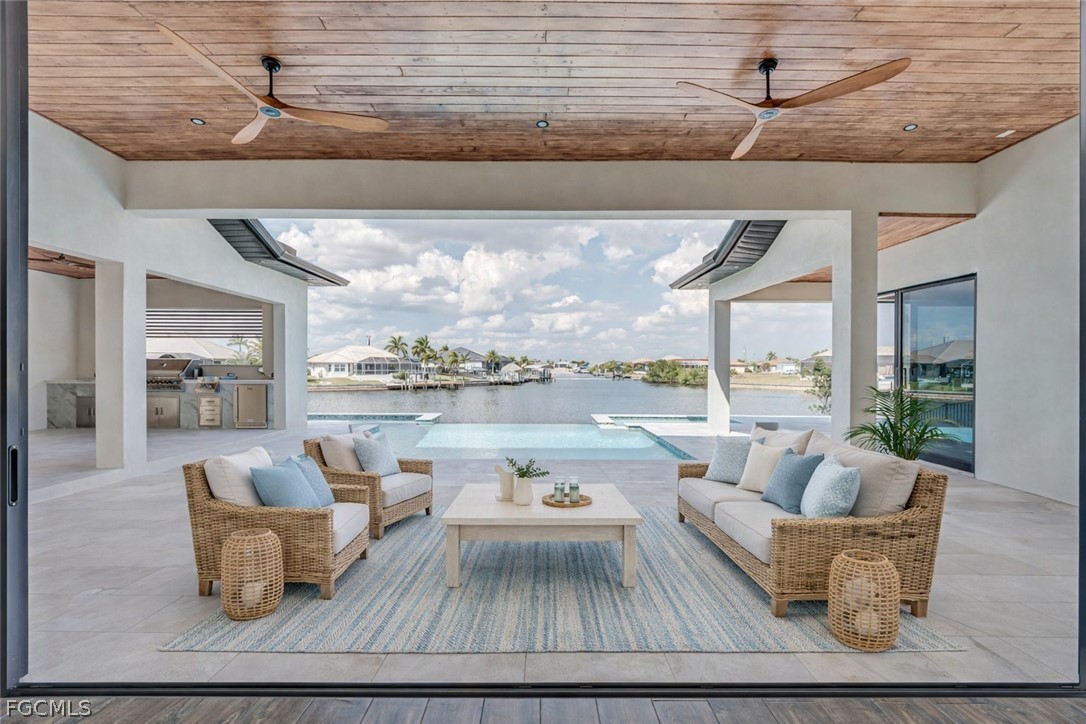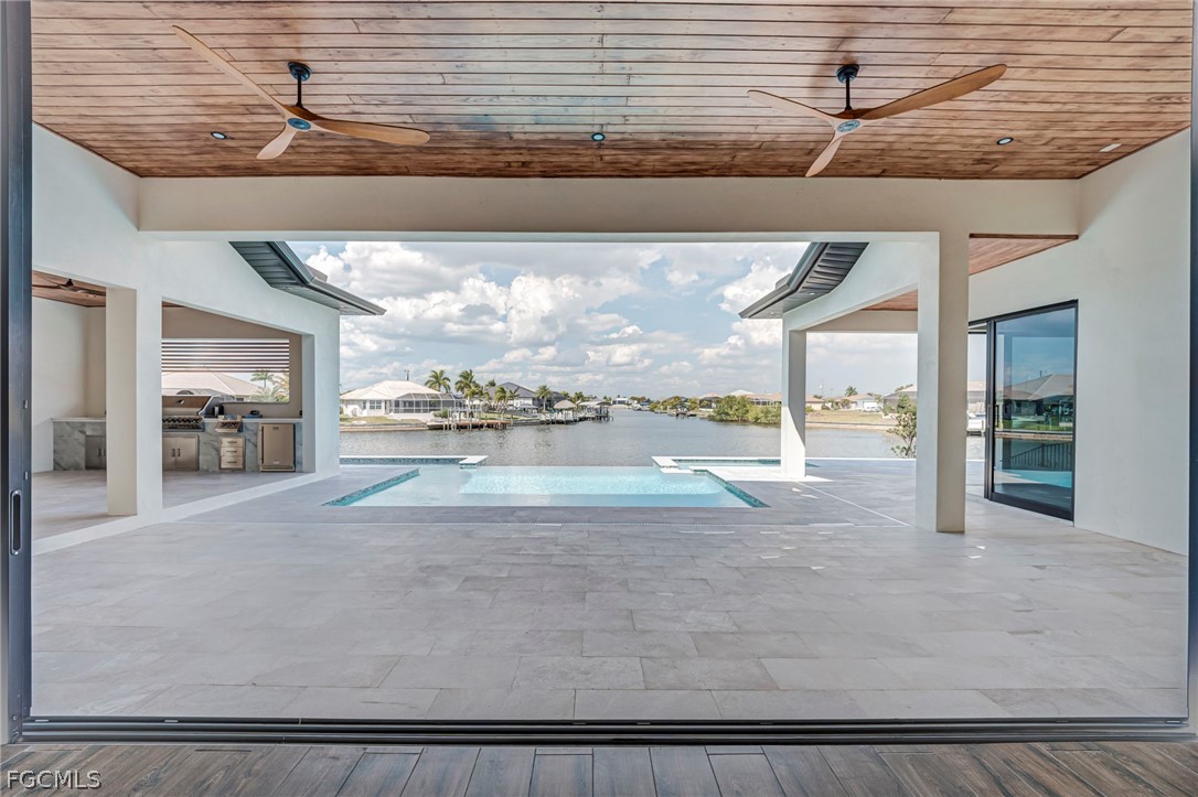 Experience the ultimate Florida lifestyle in this stunning new construction, custom-built waterfront home located in the rapidly growing Northwest Cape Coral Tropicana area. Offering 3 bedrooms plus a den, 3 full bathrooms, and a spacious 3-car garage, this impressive 2,869-square-foot residence was thoughtfully designed to combine modern luxury with everyday comfort and efficiency. Built with energy-efficient ICF (Insulated Concrete Form) reinforced concrete construction and topped with a sleek metal roof with foam insulation, the home delivers exceptional strength, durability, and efficiency. A high-efficiency Carrier air conditioning system, thermal insulated garage doors, LED lighting throughout, and a tankless water heater further enhance performance. Inside, soaring 14-foot ceilings and elegant tile flooring throughout create a bright, open atmosphere. Custom architectural ceiling details and beautiful wood plank ceiling accents add warmth and sophistication. Impact-resistant ESW Prestige windows and doors provide superior protection and insulation while filling the home with natural light. Dramatic 10-foot sliding glass doors seamlessly connect indoor and outdoor living while showcasing waterfront views. The kitchen is a showpiece, featuring custom Italian cabinetry, premium Sub-Zero and Wolf appliances, and stunning quartzite countertops with a waterfall island. A large hidden walk-in pantry offers both convenience and style. The space is complemented by decorative lighting, high-end plumbing fixtures from Kohler, Delta, and Kingston, and solid wood interior doors throughout the home. The luxurious primary suite provides a peaceful retreat with custom-built closet systems and a spa-inspired bathroom featuring an oversized shower, soaking tub, and dual floating vanities. The primary closet also offers convenient access to the spacious laundry room. Step outside to an exceptional waterfront outdoor living space overlooking a breathtaking 230-foot-wide intersecting Gulf-access canal. The expansive lanai features elegant white marble flooring and wood plank ceilings, creating the perfect setting for relaxing or entertaining. The outdoor kitchen includes premium appliances including a Napoleon grill, gas burners, and a quartzite countertop bar. A custom-designed heated saltwater pool with integrated spa overlooks the tranquil water views. Additional features include a deep well with whole-house reverse osmosis water purification, a 500-gallon water tank, 400-amp electrical service, epoxy-coated garage flooring, smart-home technology, Wi-Fi irrigation controls, and security cameras. Ideally located near the highly anticipated Seven Islands waterfront development and boardwalk, this exceptional home offers direct Gulf-access boating, modern luxury finishes, and cutting-edge construction in one of Cape Coral’s fastest-growing neighborhoods. Schedule your private showing today and experience this remarkable waterfront home.