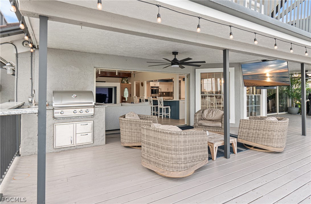 Enjoy an outdoor kitchen, built-in grill, patio, outdoor shower, and sprinkler system, perfect for entertaining or relaxing lakeside.