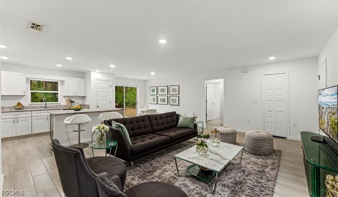 The home features designer tile flooring throughout, creating a seamless and low-maintenance living space. The bright, open living area includes recessed LED lighting, a convenient floor outlet, vinyl insulated tilt-out windows, and structured low-voltage wiring for data and cable.