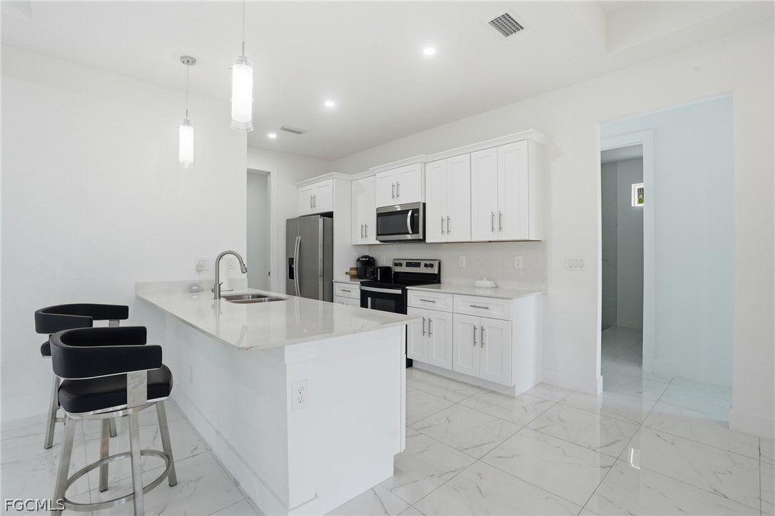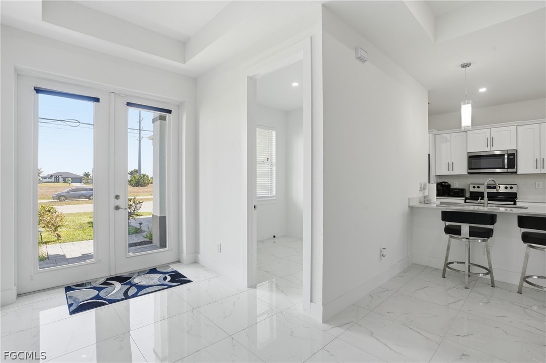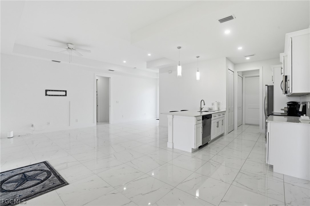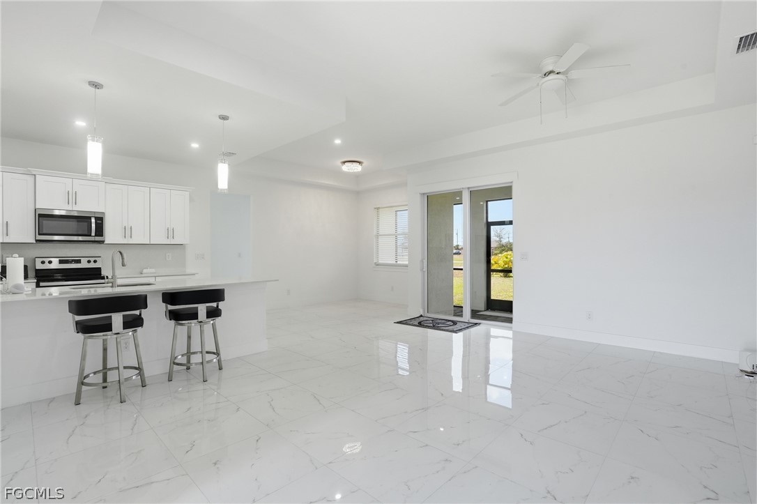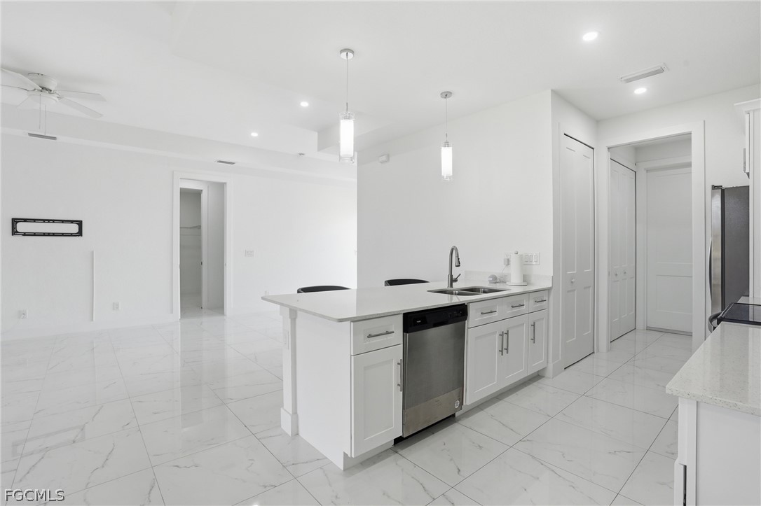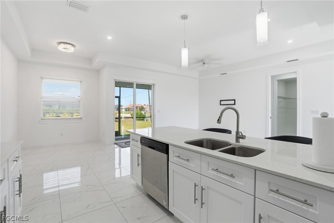 Welcome to this beautifully built 2023 single-family home located in the desirable NW section of Cape Coral. Offering 3 bedrooms plus a den, 2 full baths, and 1,688 sq ft of living area, this well-designed residence combines modern style with comfortable everyday living. The open-concept great room floor plan features tile flooring throughout and a split-bedroom layout for added privacy. The spacious kitchen overlooks the main living and dining areas and includes a breakfast bar, pantry, and ample cabinetry—ideal for both entertaining and daily use. Sliding glass doors lead to a screened lanai, creating a seamless indoor-outdoor living experience with a peaceful landscaped view and desirable western rear exposure. The primary suite offers a walk-in closet and en-suite bath with dual sinks and a walk-in shower. Two guest bedrooms and a versatile den provide flexibility for a home office, study, or additional living space. Additional features include impact-resistant windows and doors, central electric heating and cooling, ceiling fans, laundry in residence, and window coverings throughout. Situated on an oversized double lot totaling approximately .25 acres (Lots 37 & 38), this property offers added space and privacy with no HOA fees and no rental restrictions. The attached 2-car garage includes an automatic garage door opener. The home is serviced by well water with a water treatment system and septic. Conveniently located near shopping, dining, schools, and everyday amenities, this move-in ready home presents a fantastic opportunity to own a newer construction property in a growing area of Cape Coral.