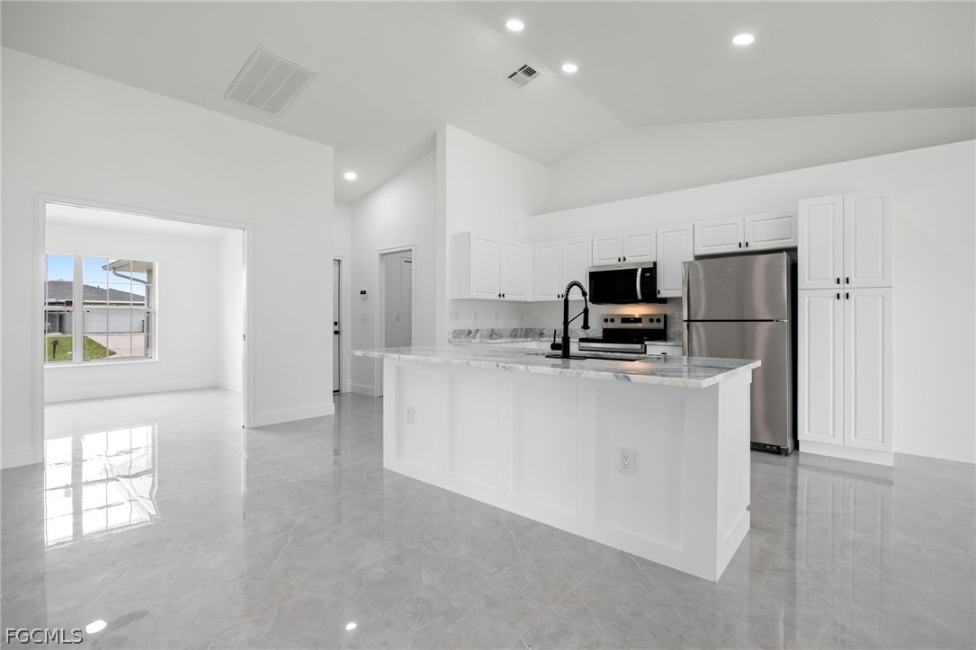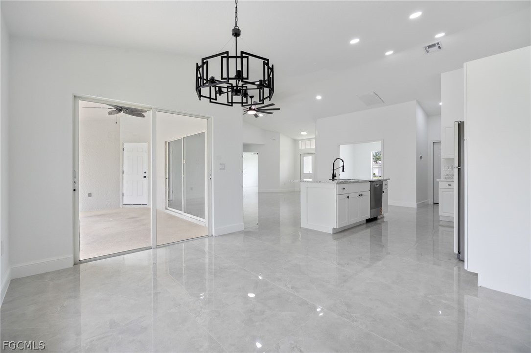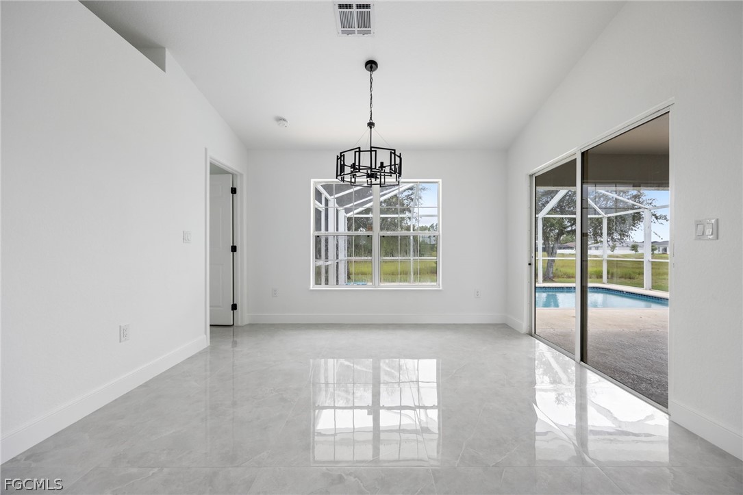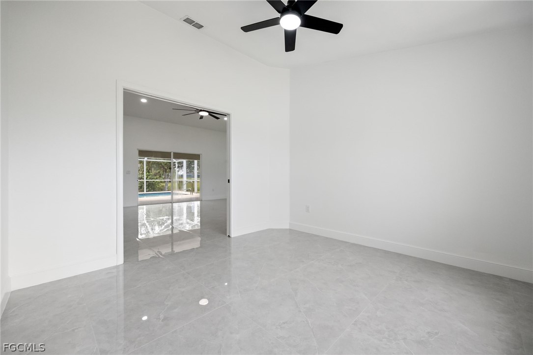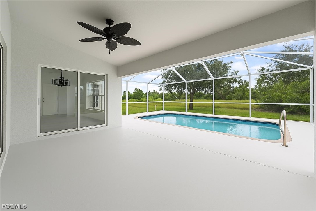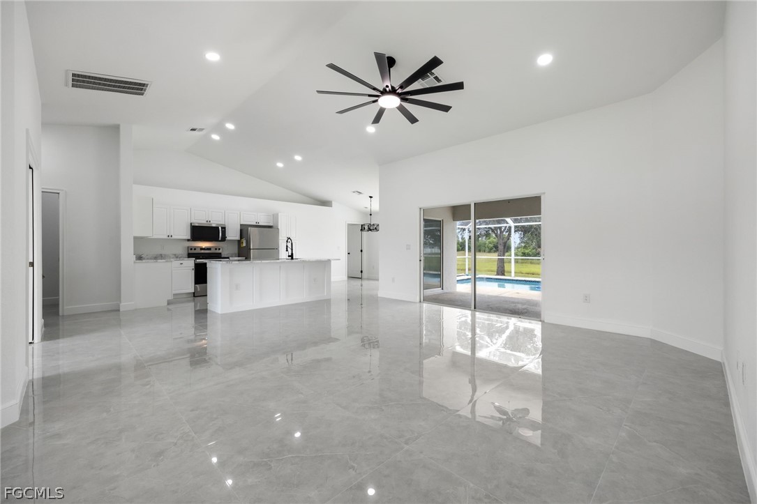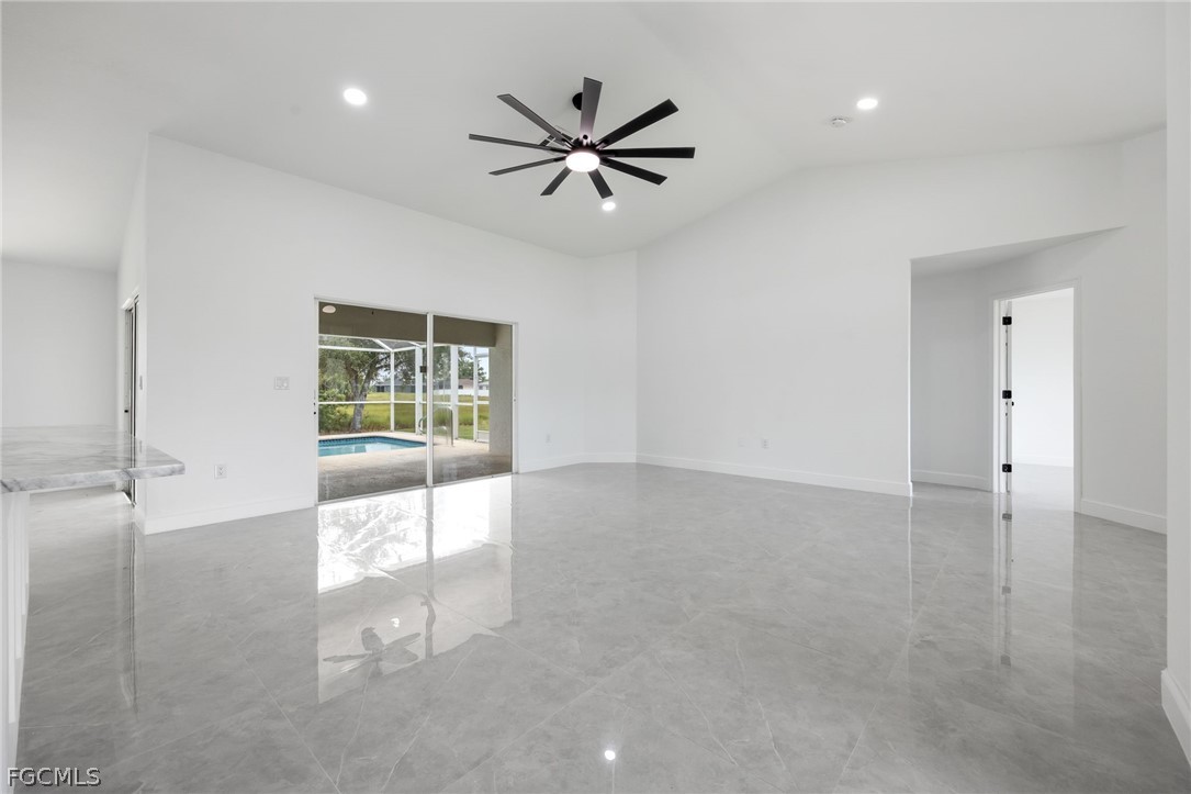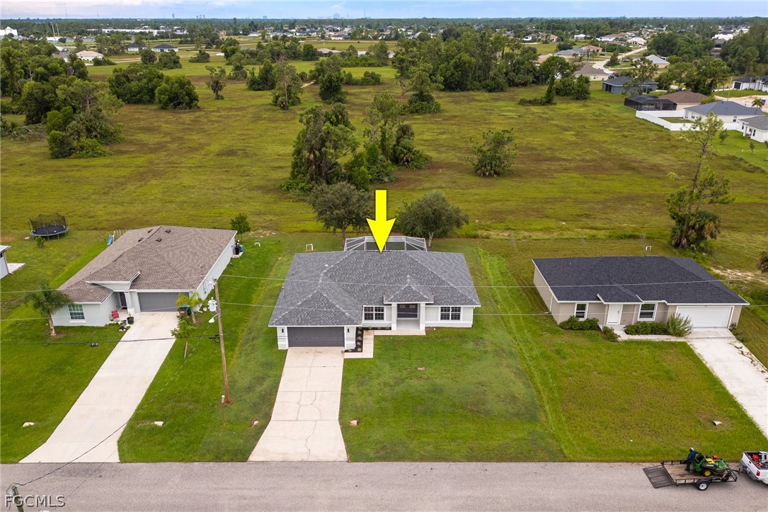 New 2024 roof, 2022 A/C, and a sparkling private pool overlooking peaceful green space—this beautifully updated 3 bedroom + den, 2 bath home delivers true move-in-ready comfort in NE Cape Coral. Step inside to an open, light-filled layout with neutral tile throughout, updated interior paint, and a spacious living and dining area perfect for gathering. The remodeled kitchen features granite counters, stainless steel appliances, modern cabinetry, and a breakfast bar ideal for everyday living. The split-bedroom design offers a private primary suite with a walk-in closet and a refreshed bathroom with dual sinks and a walk-in shower. The versatile den works perfectly as an office, playroom, or flex space. Step outdoors to your own backyard oasis—a screened-in pool and lanai with no rear neighbors, offering room to relax, entertain, and enjoy the Florida lifestyle. Additional highlights include an indoor laundry room, updated baths, a 2-car garage, and beautifully maintained landscaping. Conveniently located near shopping, dining, schools, and commuter routes, this home combines comfort, style, and peace of mind with major updates already done. This is the one you’ll want to see in person.