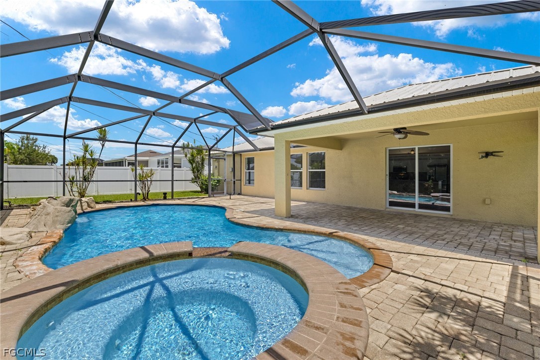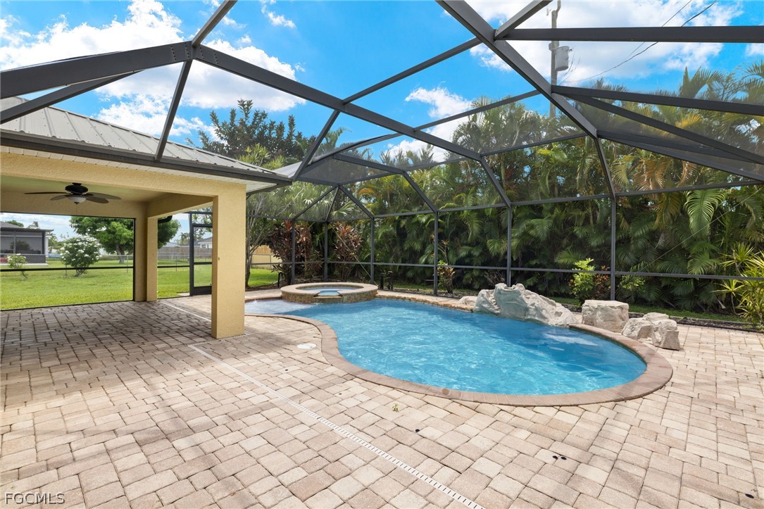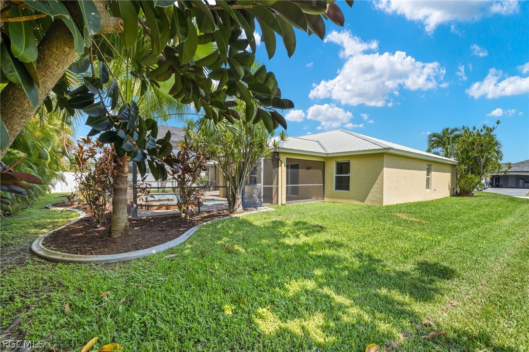 MOVE IN READY! Great SW Cape Coral location! HEATED POOL & SPA w/ ROCK WATERFALL. Spacious under truss SCREENED LANAI with PAVER POOL DECK. NEW METAL ROOF 2023. NEW AC 2022. NEVER FLOODED! and does NOT need flood insurance! All assessments paid. Three bedrooms plus large DEN W/ Glass French Doors…perfect as a guest room, play room, office or media room. Hard to find extra Bonus Room is versatile enough to use as second family room or formal dining room. Kitchen with white Cabinetry w/ STAINLESS APPLIANCE PACKAGE, GRANITE Countertops w/ recessed oversized Stainless Sink in CENTER ISLAND w/ generous BREAKFAST BAR seating. Designed for family or intimate gathering. VAULTED CEILINGS in Kitchen, Bonus Room and Great Room. Great Room patio doors conveniently open to Lanai AND views of Pool and Spa. Master Bath includes Walk In Shower with floor to ceiling Tile Surround AND separate corner garden soaking tub, and Granite Counter Tops. Guest Bath includes tile tub surround and Granite Counter Tops. Split Bedroom plan is perfect for guests or multi-generation family lifestyles. LAUNDRY ROOM is conveniently located inside the home, spacious with pantry shelving. Hurricane Shutters are included. Excellent location …. Minutes to shopping, Pine Island, Matlacha and the anticipated 7 Islands Project.