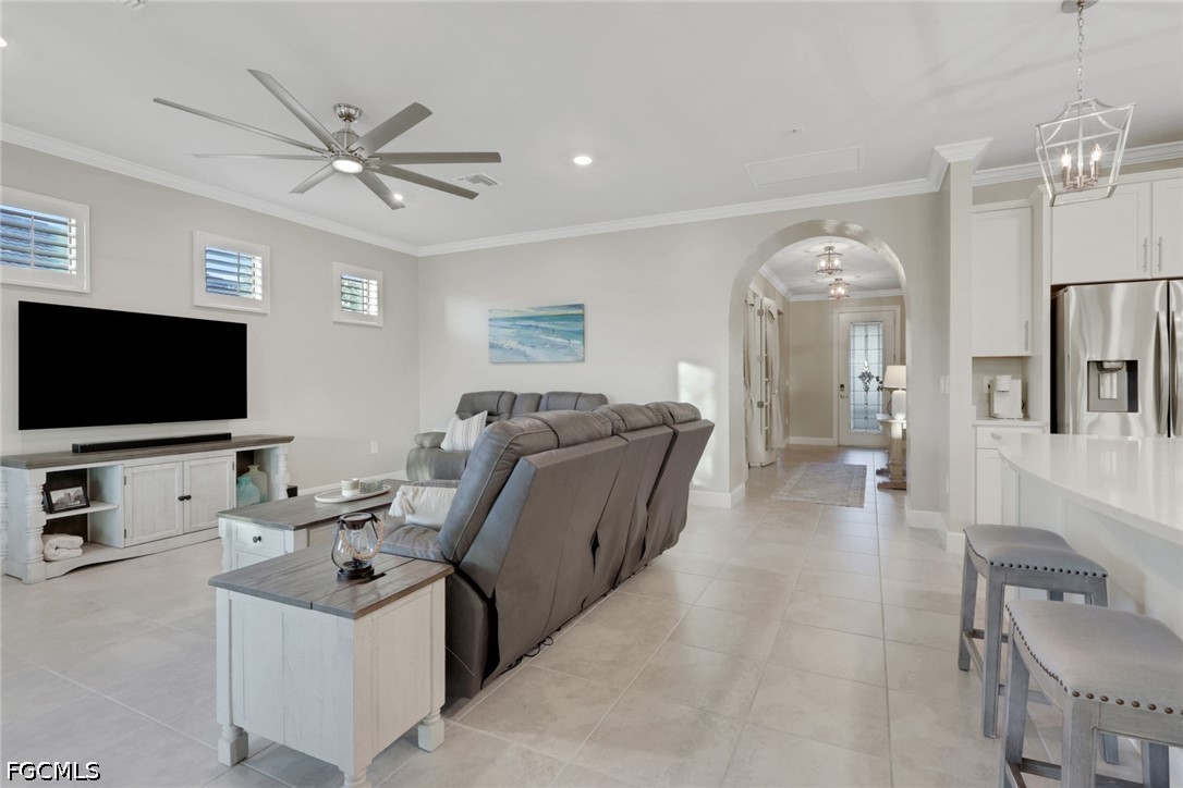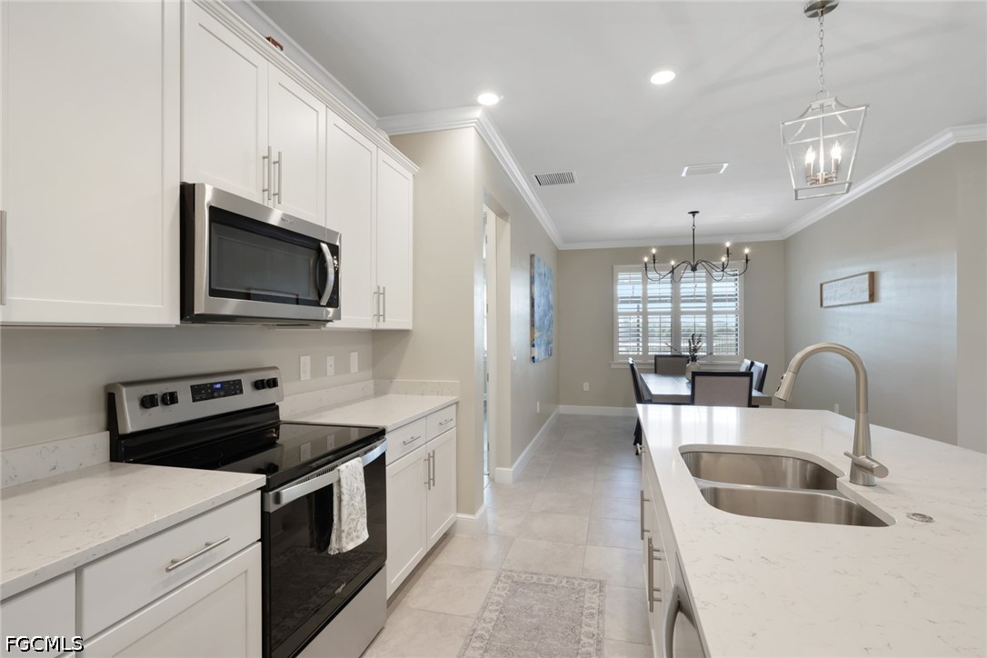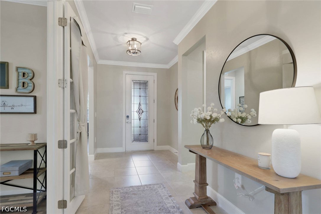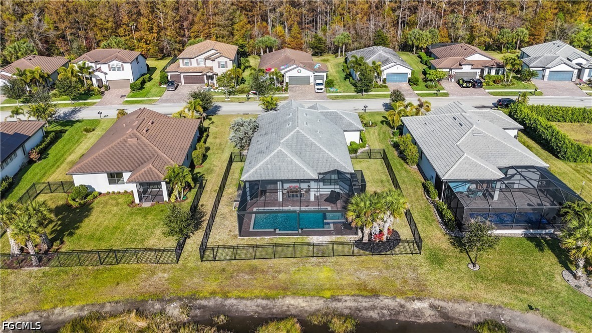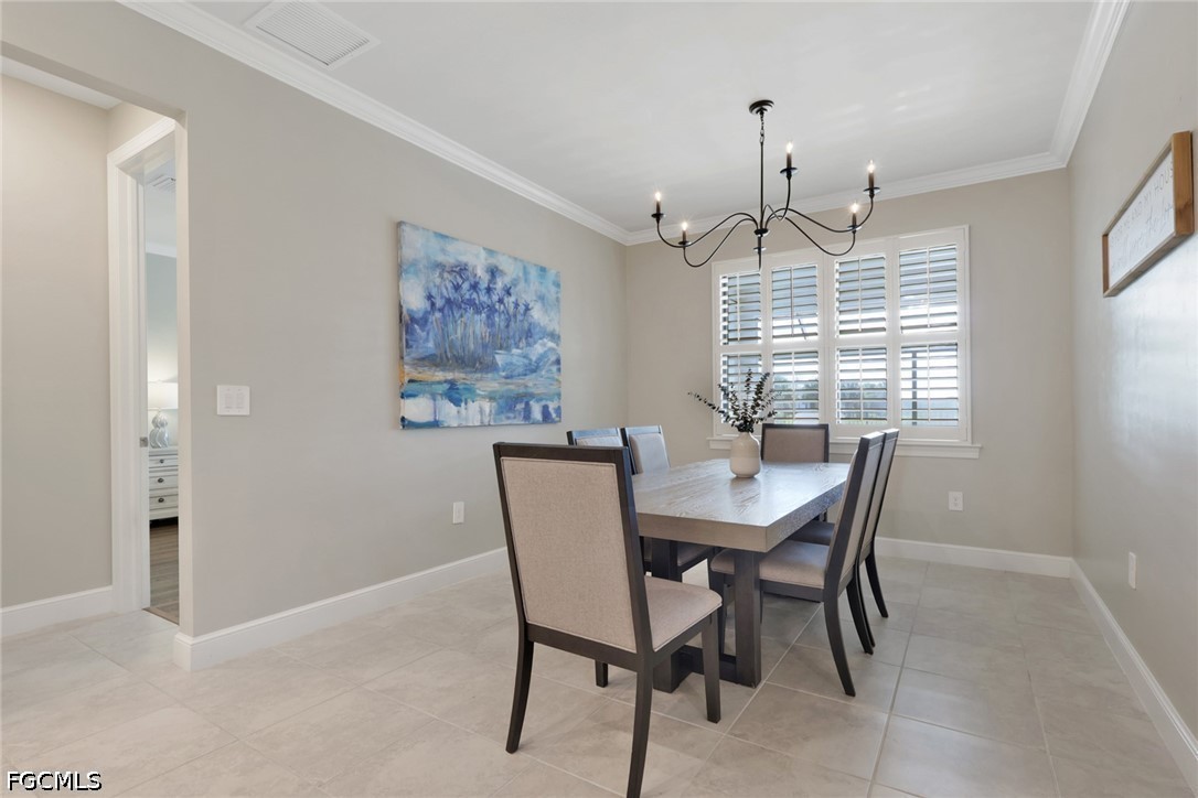 This home is the crown jewel of the Hampton Lakes neighborhood, sitting at the base of a large lake on a fenced oversized lot. The huge 3 car garage is custom with added space for storage. This home has been upgraded with with a large custom built, heated salt water pool and spa. the outdoor bar, dining area, 70" large screen smart TV,(conveys) LED lights and built in speakers for entertaining makes this property incredibly unique. Outdoor living area boasts a custom panoramic screen enclosure for maximum views. Gorgeous setting for morning coffee and watching the abundant wildlife at sunset. Tile and luxury vinyl floors in bedrooms and closets. This home features large master bedroom with dual sinks, shower, water closet and very spacious walk in closet. Take a walk or golf cart ride to the club house to enjoy the weight room or beach style pool, pickel ball courts, playground and large grass areas to play with your kids or dogs.