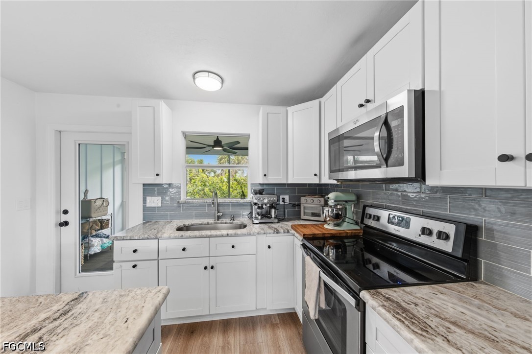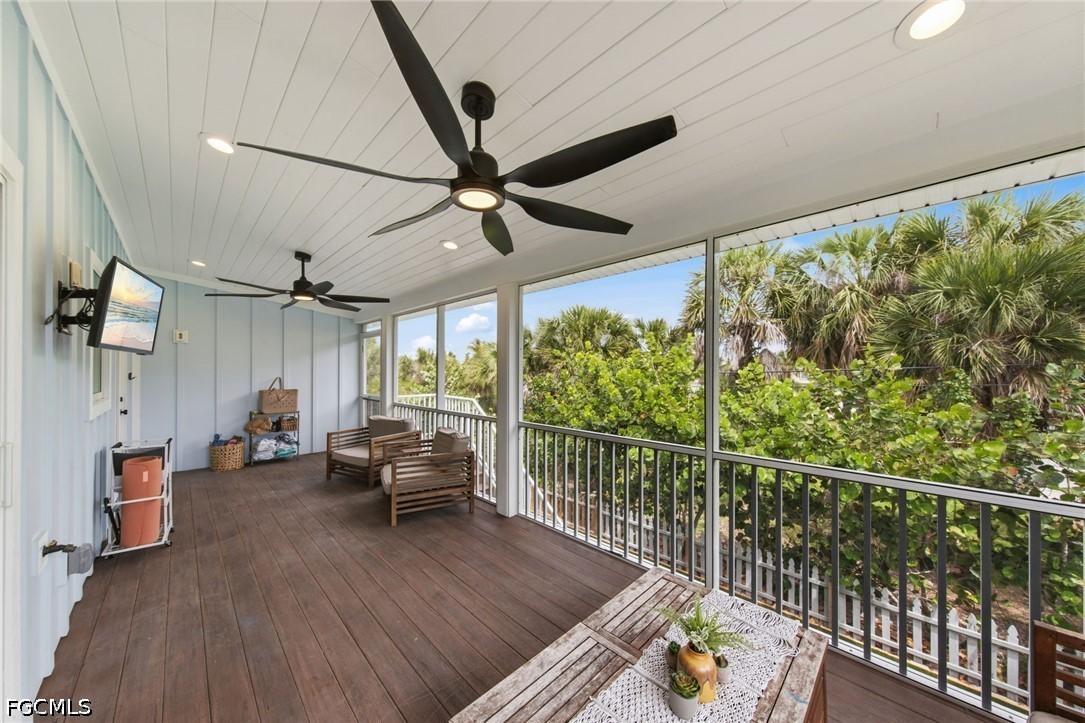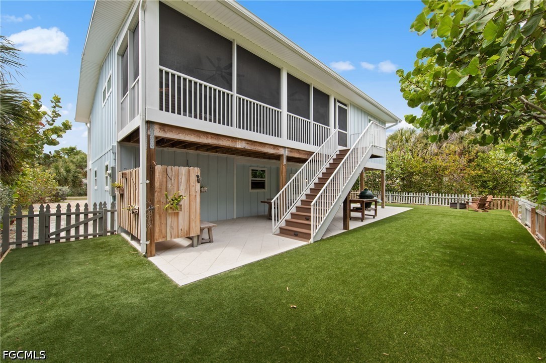 This exceptional Old Florida–inspired residence has been masterfully updated and expanded, with a comprehensive renovation completed in 2022. Thoughtfully designed with both elegance and durability in mind, the home features a standing seam metal roof, Hardie board siding, and impact-rated windows and doors. Timeless coastal architecture meets refined island living, creating an inviting yet sophisticated retreat. The interiors are filled with natural light and showcase elevated, thoughtfully curated finishes throughout—from warm wood flooring to a stunning, private primary suite designed for comfort and tranquility. A gracious front porch welcomes you into a sun-drenched, window-lined sitting area that transitions effortlessly into the main living space. The open-concept design flows seamlessly into a beautifully appointed kitchen, where quartz countertops, custom shaker-style cabinetry, and stainless steel appliances create a clean, elegant focal point. The great room extends to a serene screened outdoor living area, offering the perfect setting for relaxed coastal entertaining. The fully enclosed lower level provides both practicality and versatility, featuring a one-car garage, an expansive storage area, and a dedicated workspace—ideal for hobbies, projects, or additional storage needs.