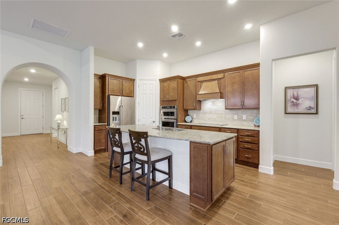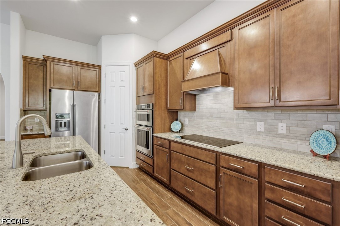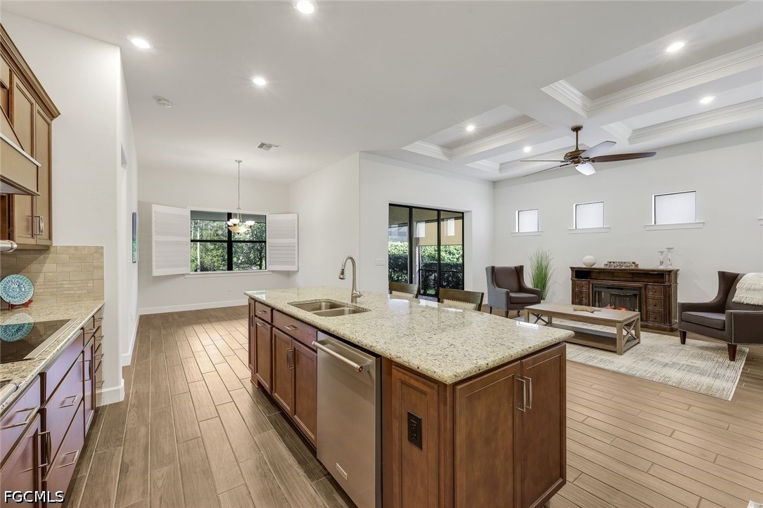 Inside, you’re greeted by gorgeous plank tile flooring, soaring coffered and tray ceilings, crown moldings and elegant plantation shutters. The chef-inspired kitchen is a standout, featuring upgraded granite countertops, a large center island, custom cabinetry, stainless steel appliances, double oven and a generous walk-in pantry. The open great room flows seamlessly, creating a warm and inviting space for family and friends.